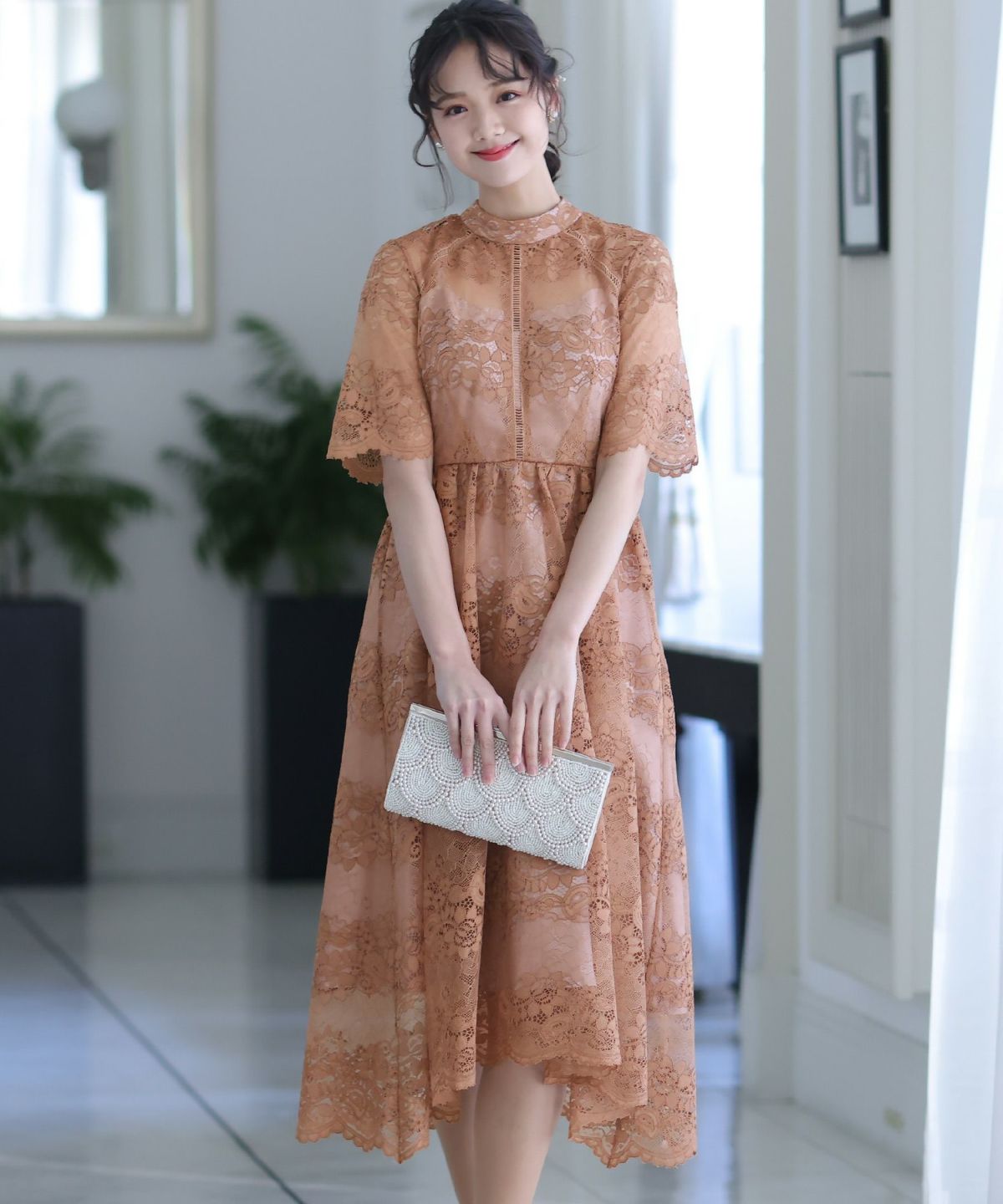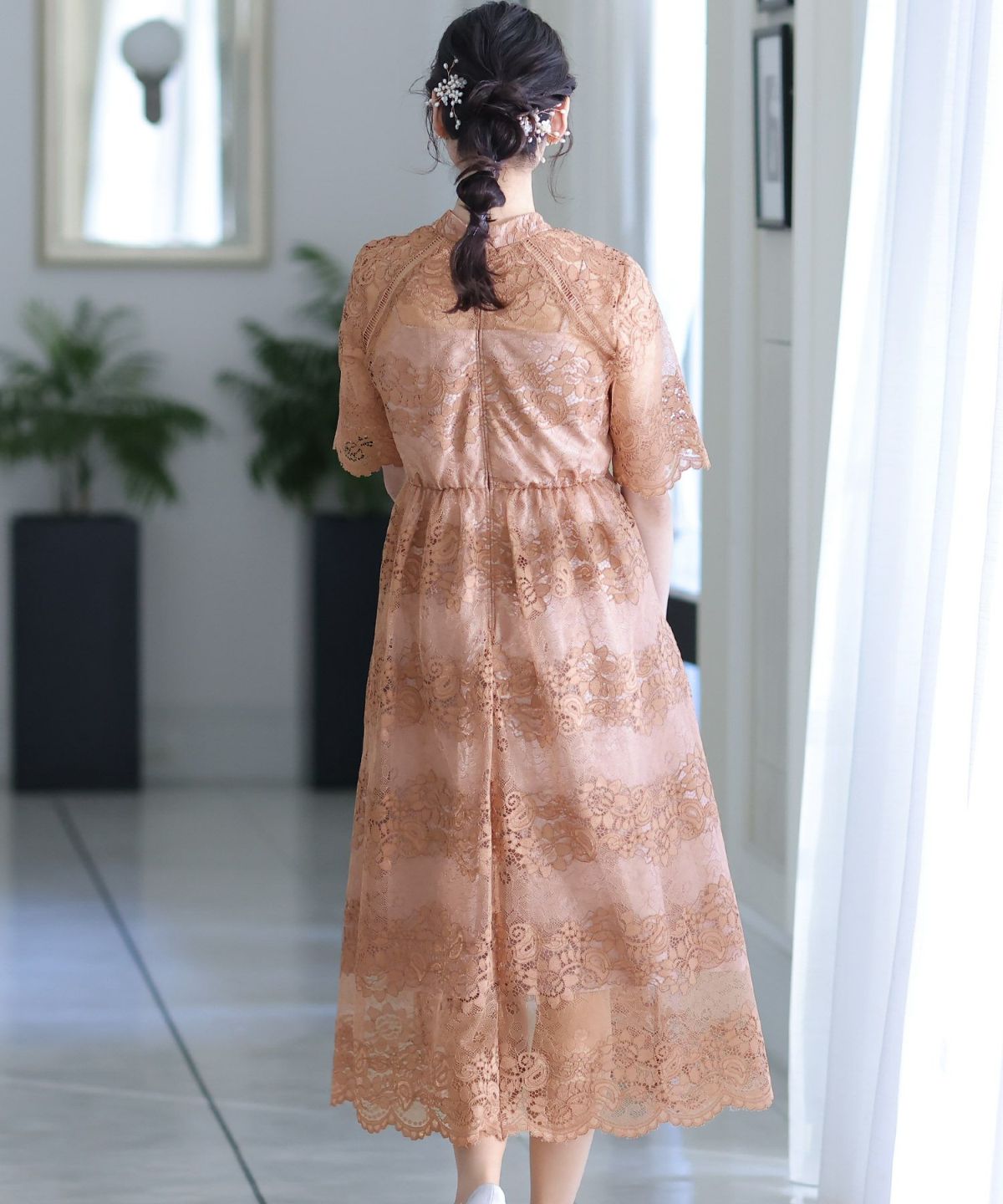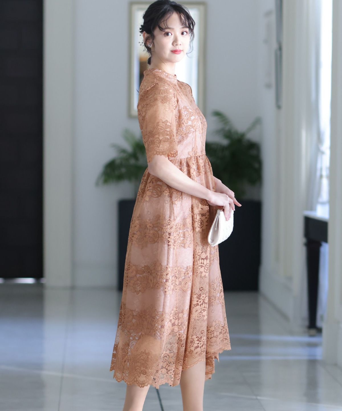 ■総レース×スカラップスカラップデザインが可愛い総レースワンピース。高めのウエストとふんわり広がるスカートで綺麗なAラインシルエットに。ウエスト背面がゴムになっているので着脱も楽ちん。オケージョンシーンはもちろん、特別なお食事会などにもピッタリです。