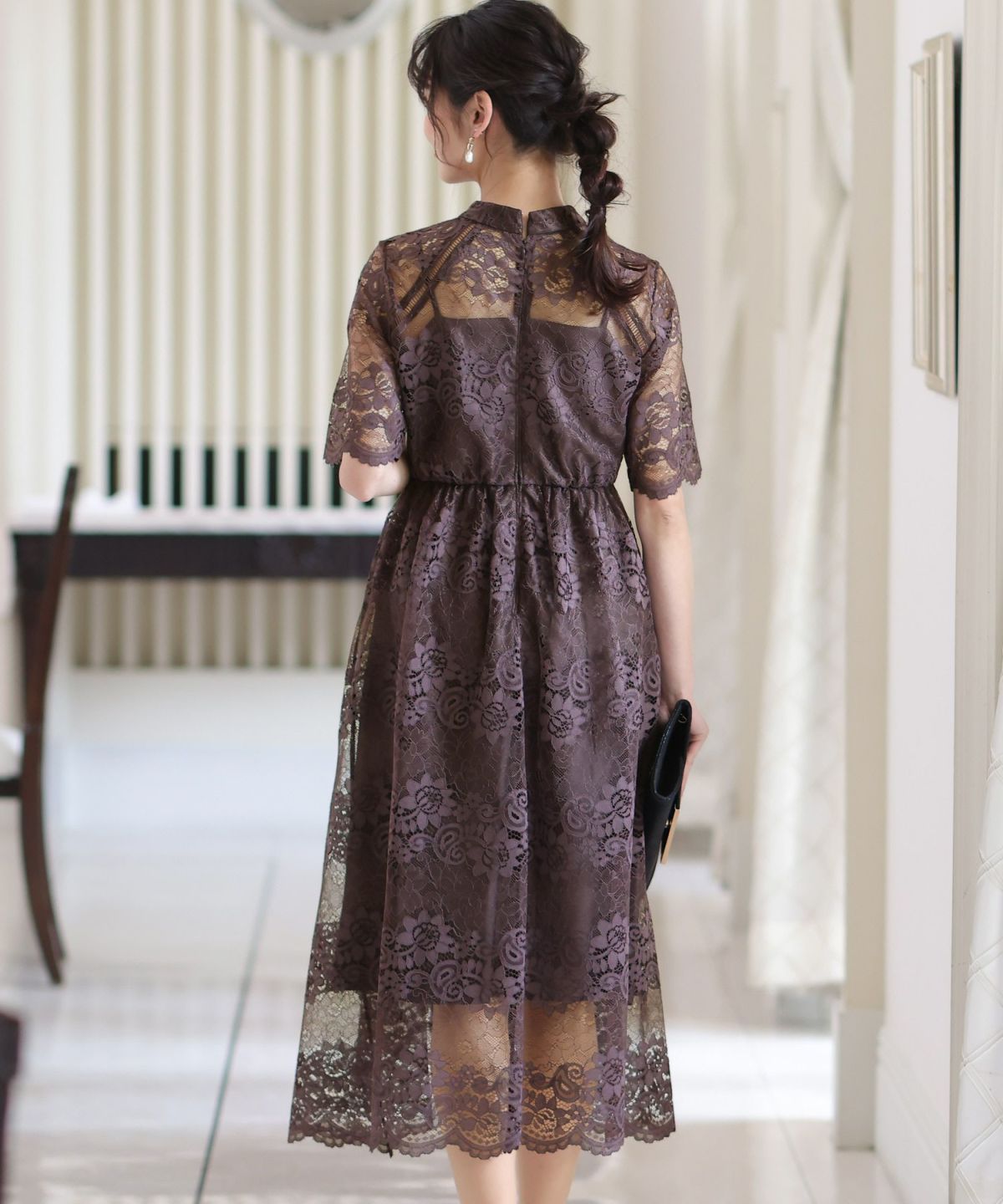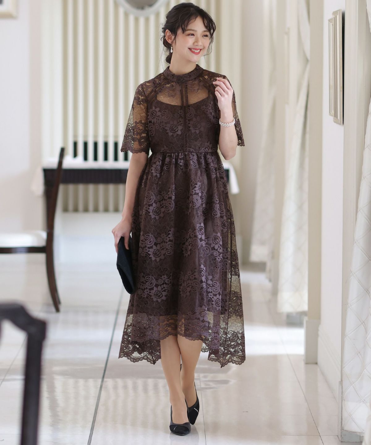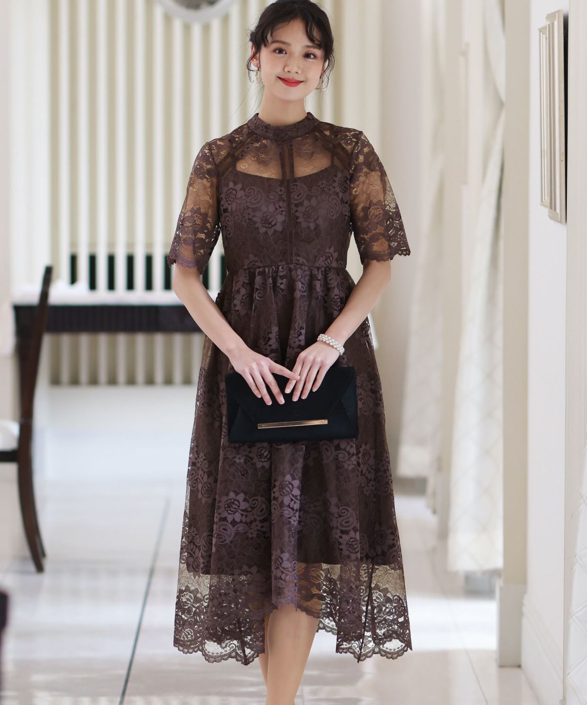 ■総レース×スカラップスカラップデザインが可愛い総レースワンピース。高めのウエストとふんわり広がるスカートで綺麗なAラインシルエットに。ウエスト背面がゴムになっているので着脱も楽ちん。オケージョンシーンはもちろん、特別なお食事会などにもピッタリです。