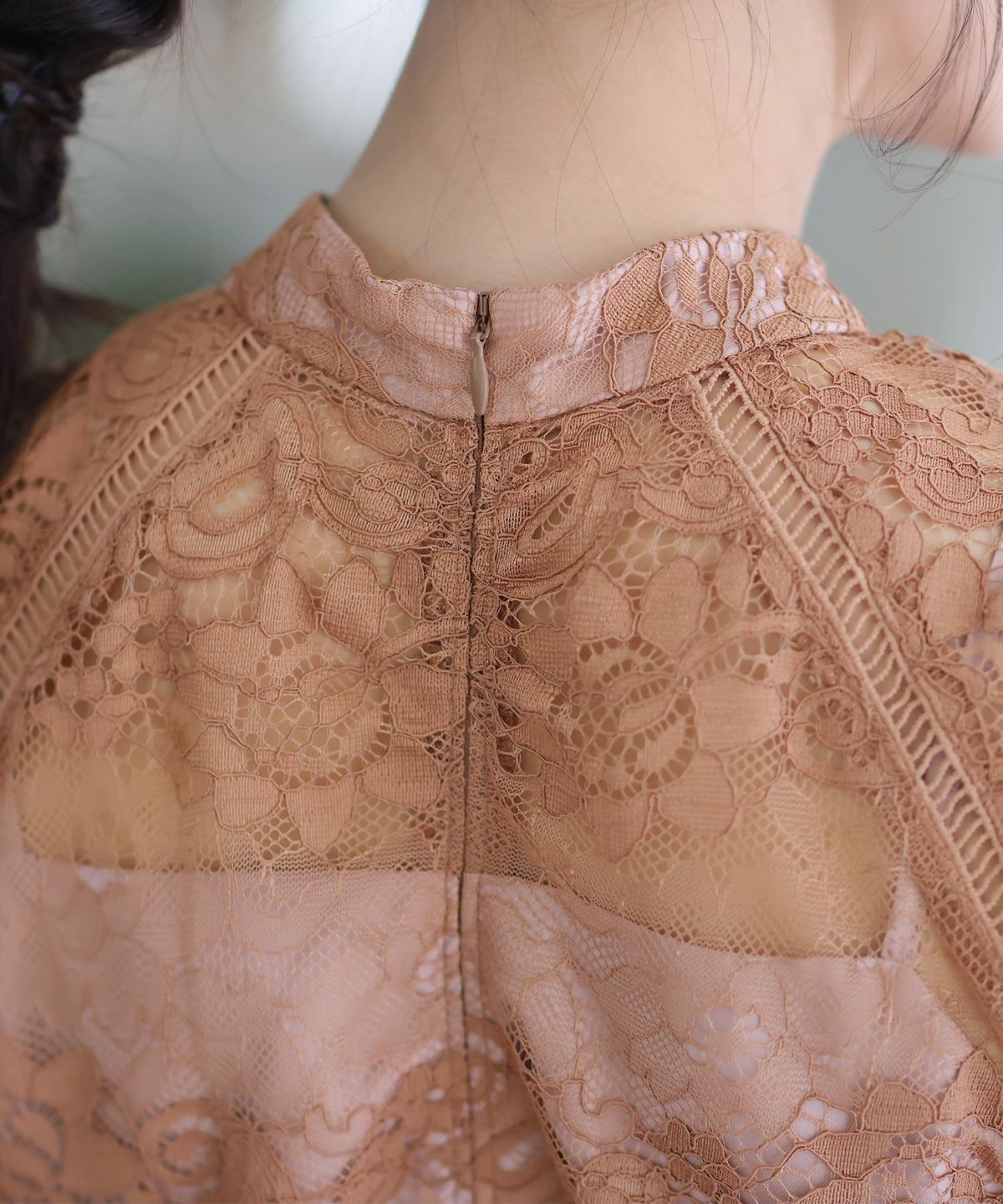 ■プチハイネックと程よい透け感で上品な印象に体型カバーポイント:【二の腕】【脚】【ウエスト】【ヒップ】デコルテからスリーブの程良い透け感が上品です。少し長めのレース袖で気になる二の腕もカバー。