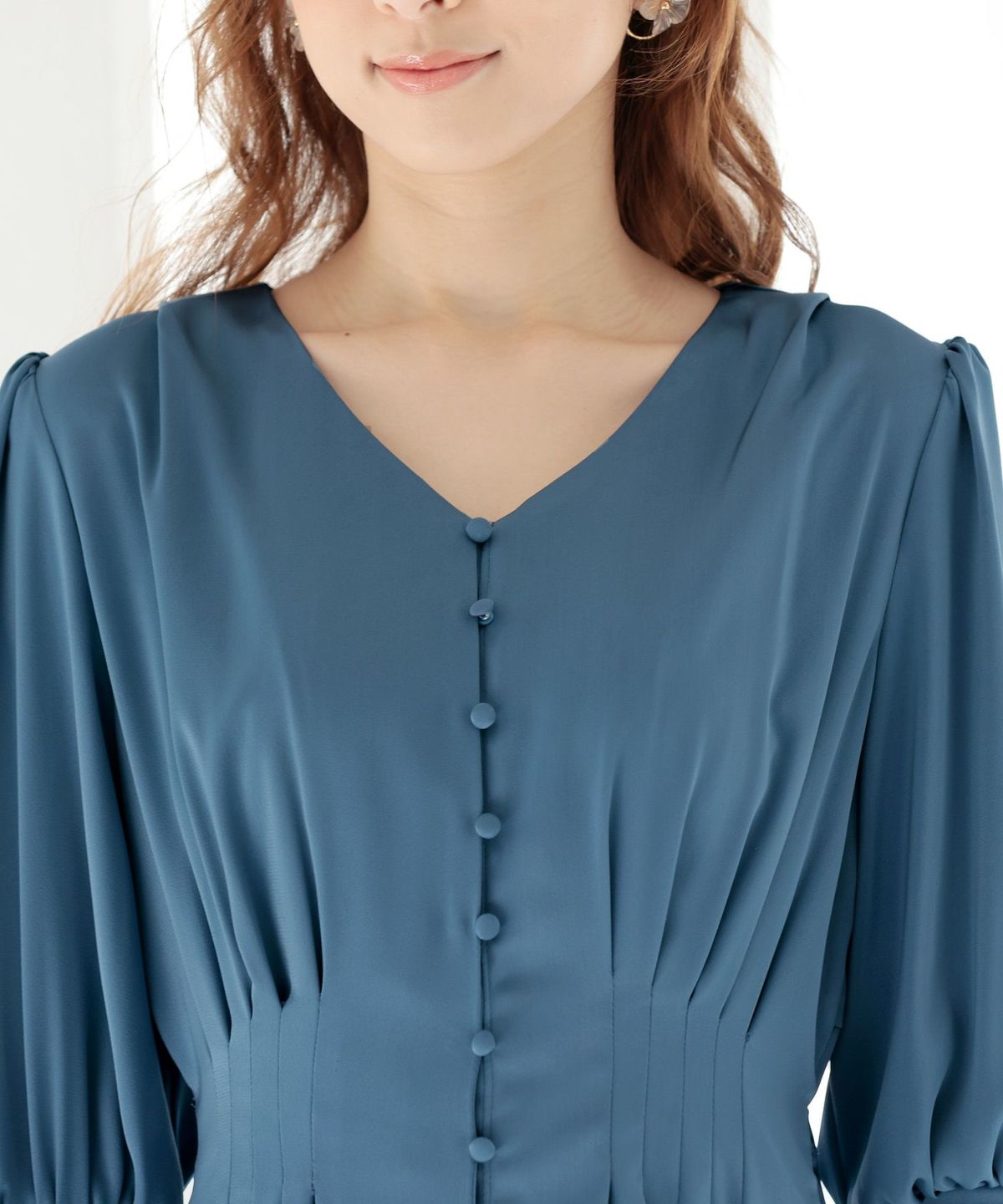 くるみボタンを使用したフロントデザインがアクセントになり、一枚でもこなれ感ある着こなしに。小顔効果のあるVネックと、ふんわりとしたバルーン袖が華奢なラインに見せてくれます。