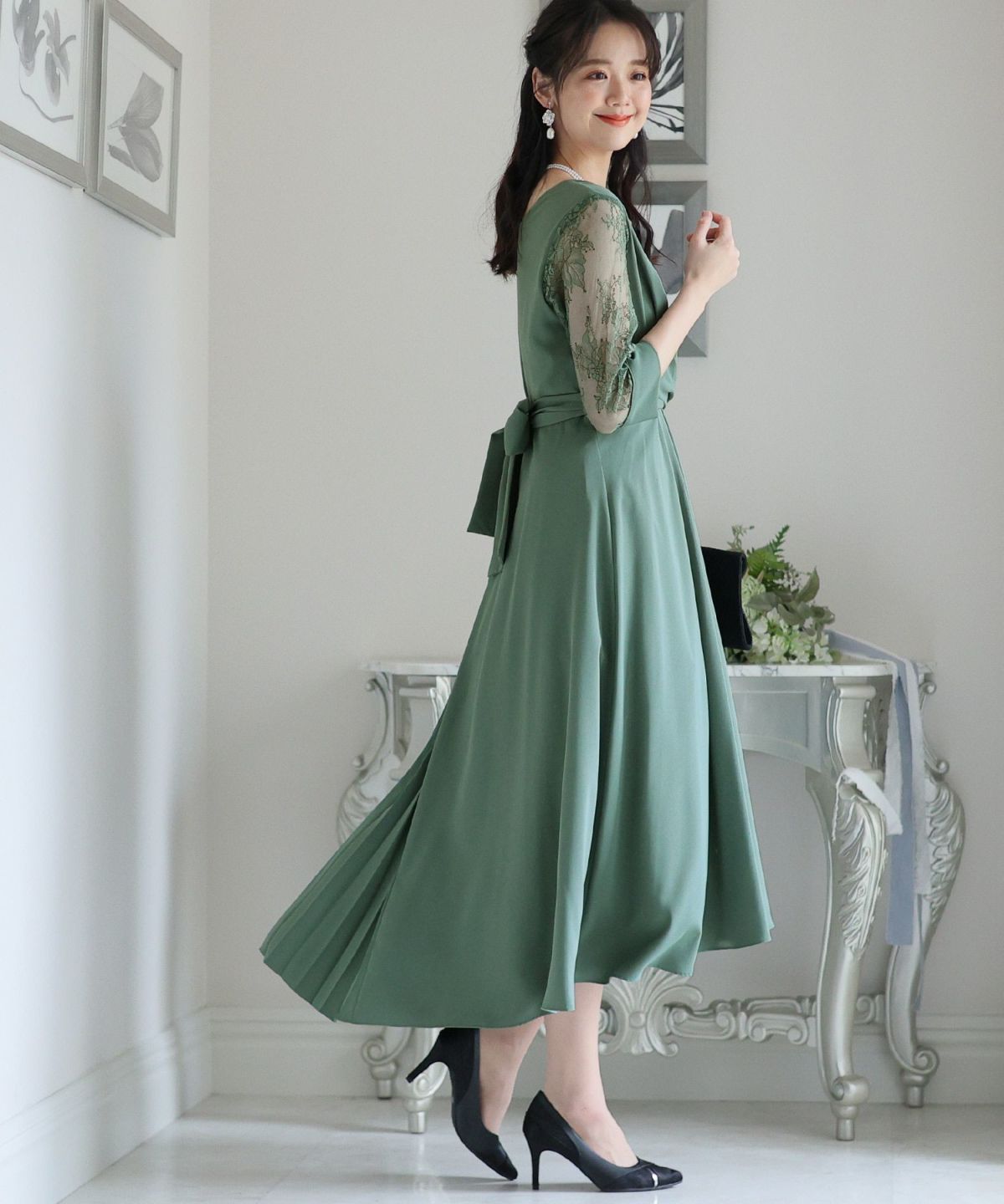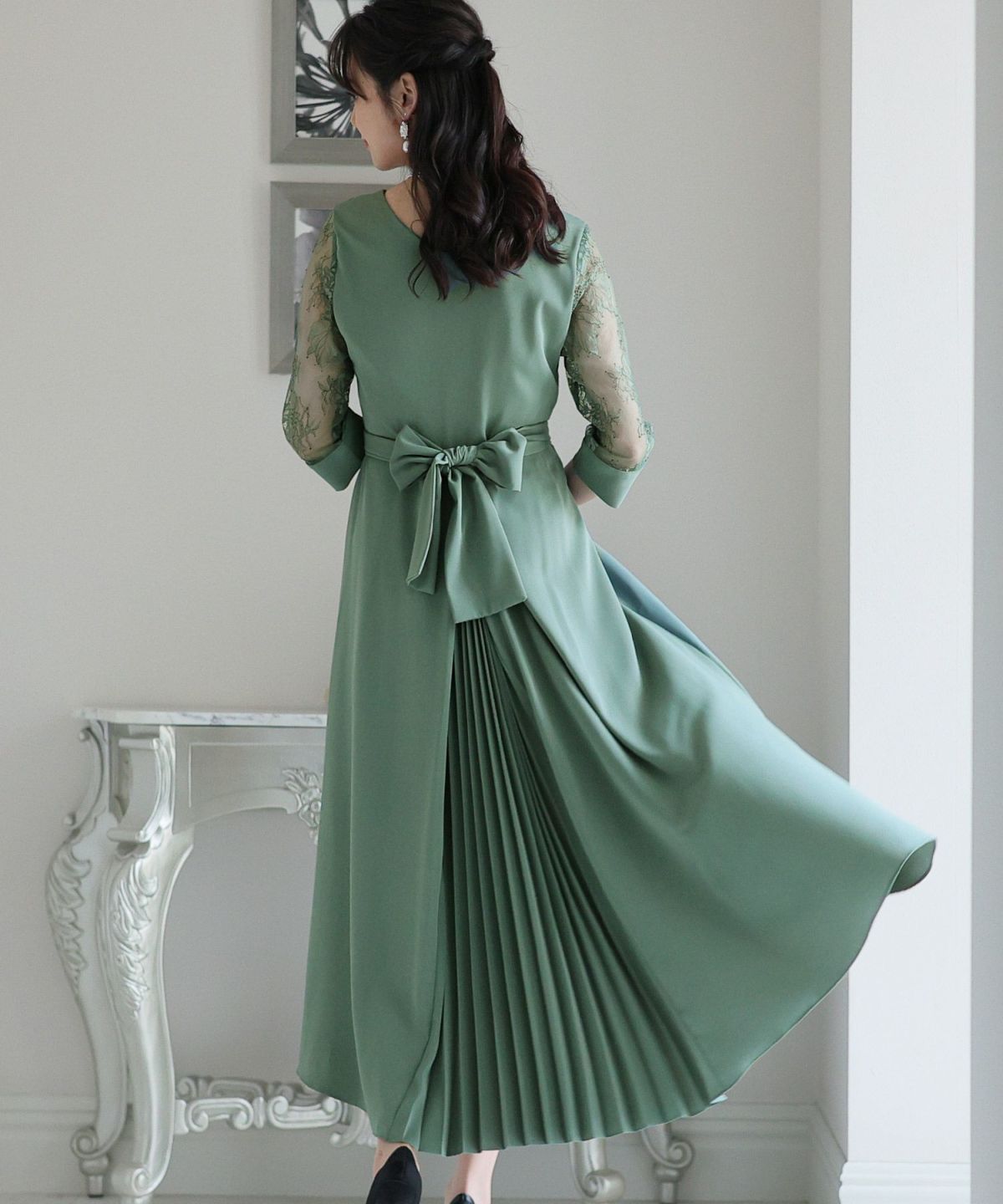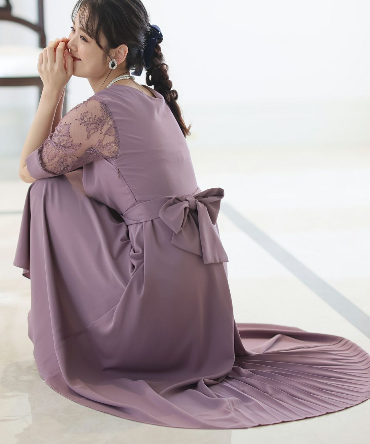 ■リボン×プリーツバックセンターに入ったプリーツデザインが可愛いワンピースです。コードレースに切り替えられたスリーブ部分の透け感が可愛い。ウエスト部分のリボンは前後ろどちらで結んでも◎オケージョンはもちろん、特別な日のお出かけにもおすすめです。