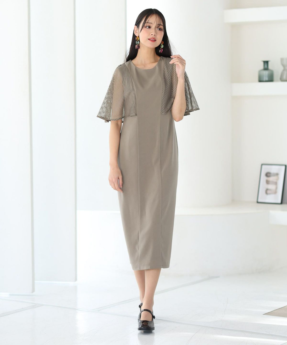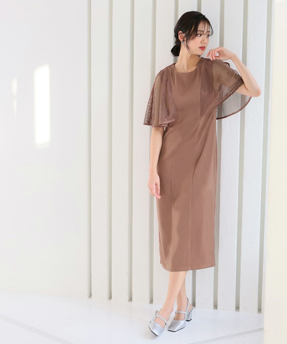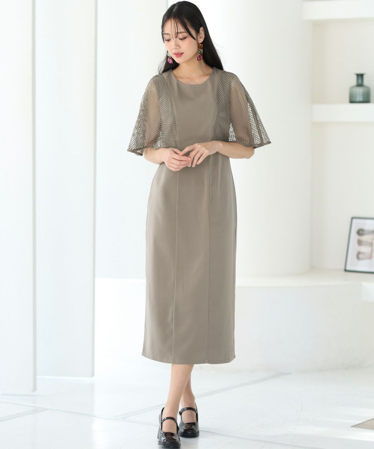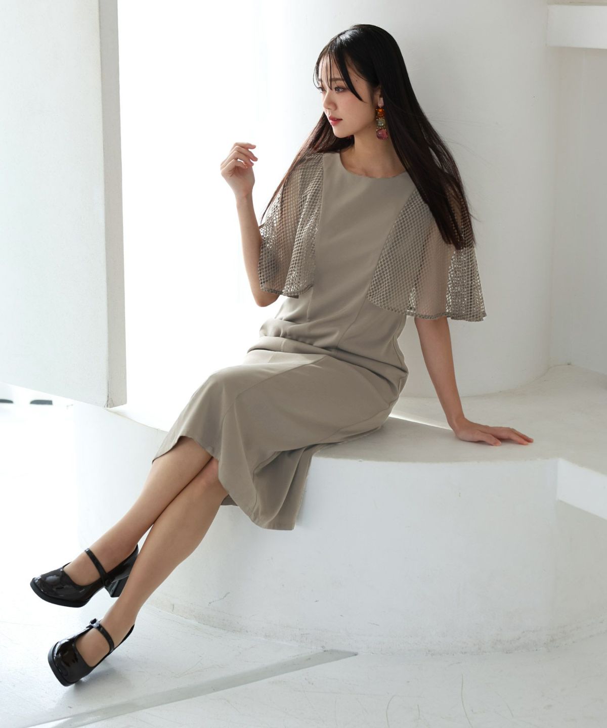 ケープスリーブが特徴的なタイトラインワンピース。袖のボタンを外すことで袖のデザインが変わり、2通りの着方を楽しめます。程よく広がりのある袖で、メリハリのあるラインを演出。シンプルなデザインなので、お食事会など様々なシーンで着用いただけます。
