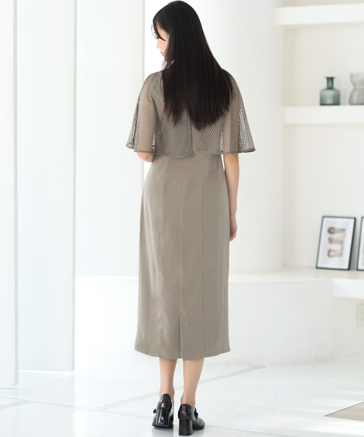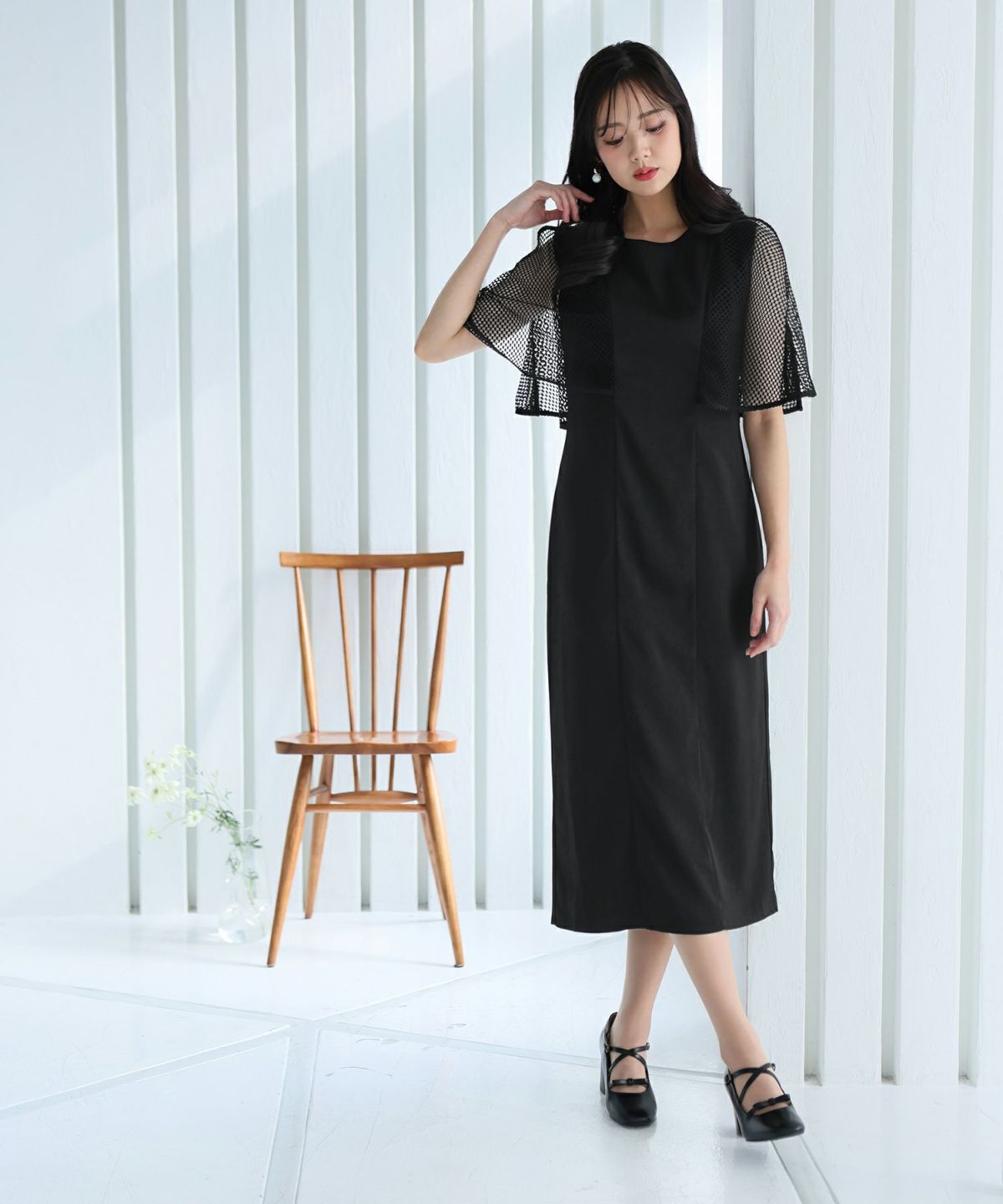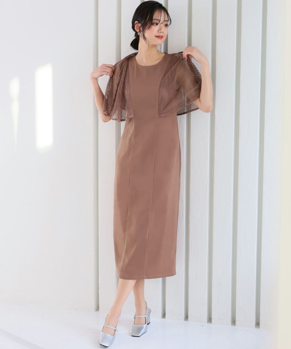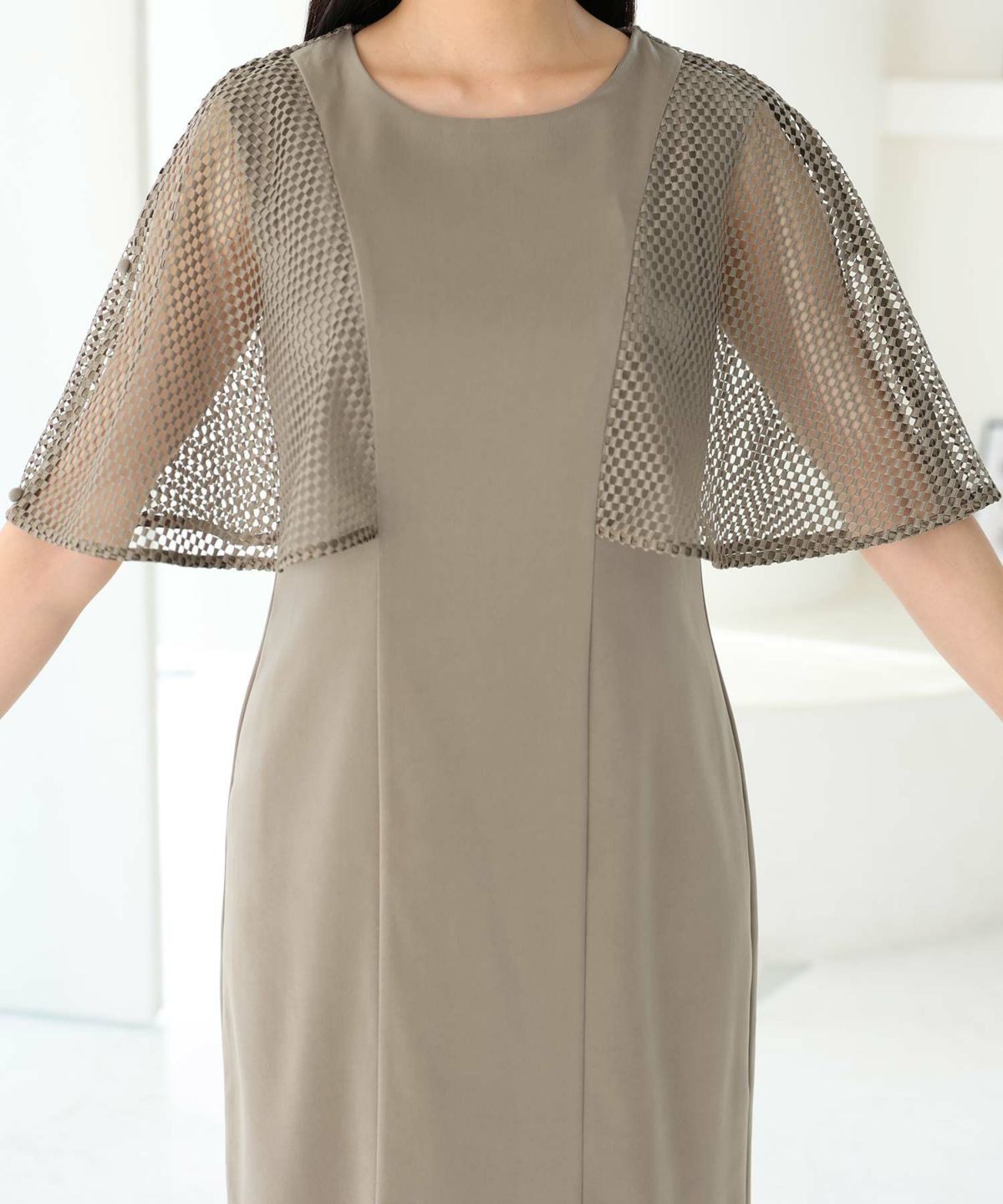 ケープスリーブが特徴的なタイトラインワンピース。袖のボタンを外すことで袖のデザインが変わり、2通りの着方を楽しめます。程よく広がりのある袖で、メリハリのあるラインを演出。シンプルなデザインなので、お食事会など様々なシーンで着用いただけます。