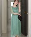 ■シンプルなデコルテとスカラップ袖シンプルなスクエアネックは、どんなアクセサリーも合わせやすい♪袖の透け感と裾のスカラップで可愛く二の腕をカバーしてくれます。ウエスト部分にはシャーリングが入っており伸縮性があるので、圧迫感がなく楽な着心地です。