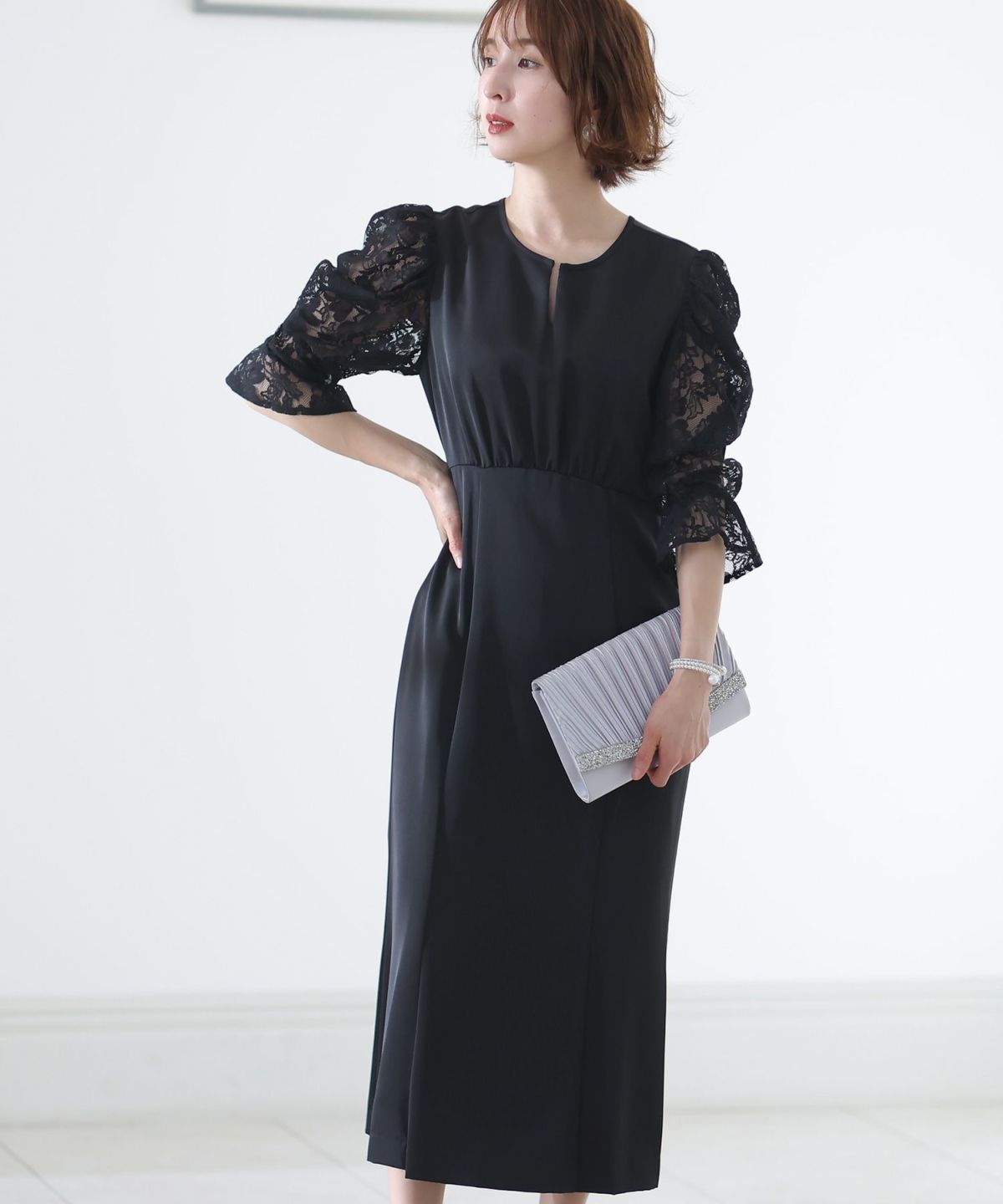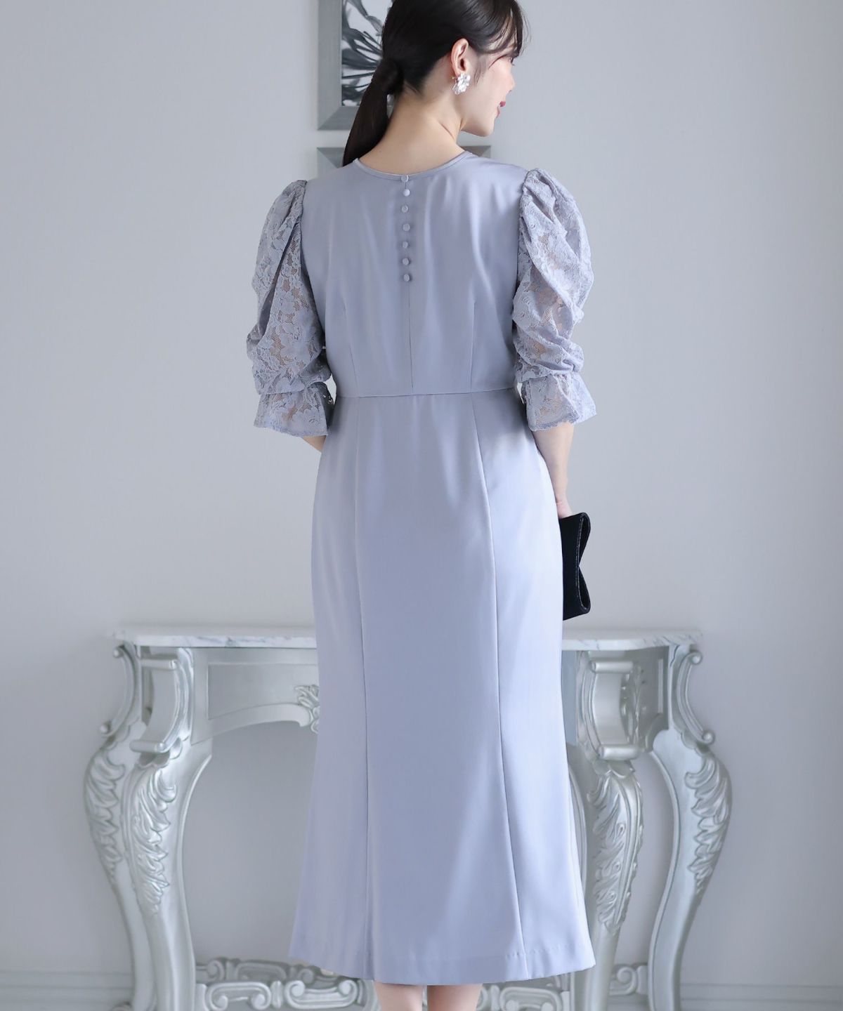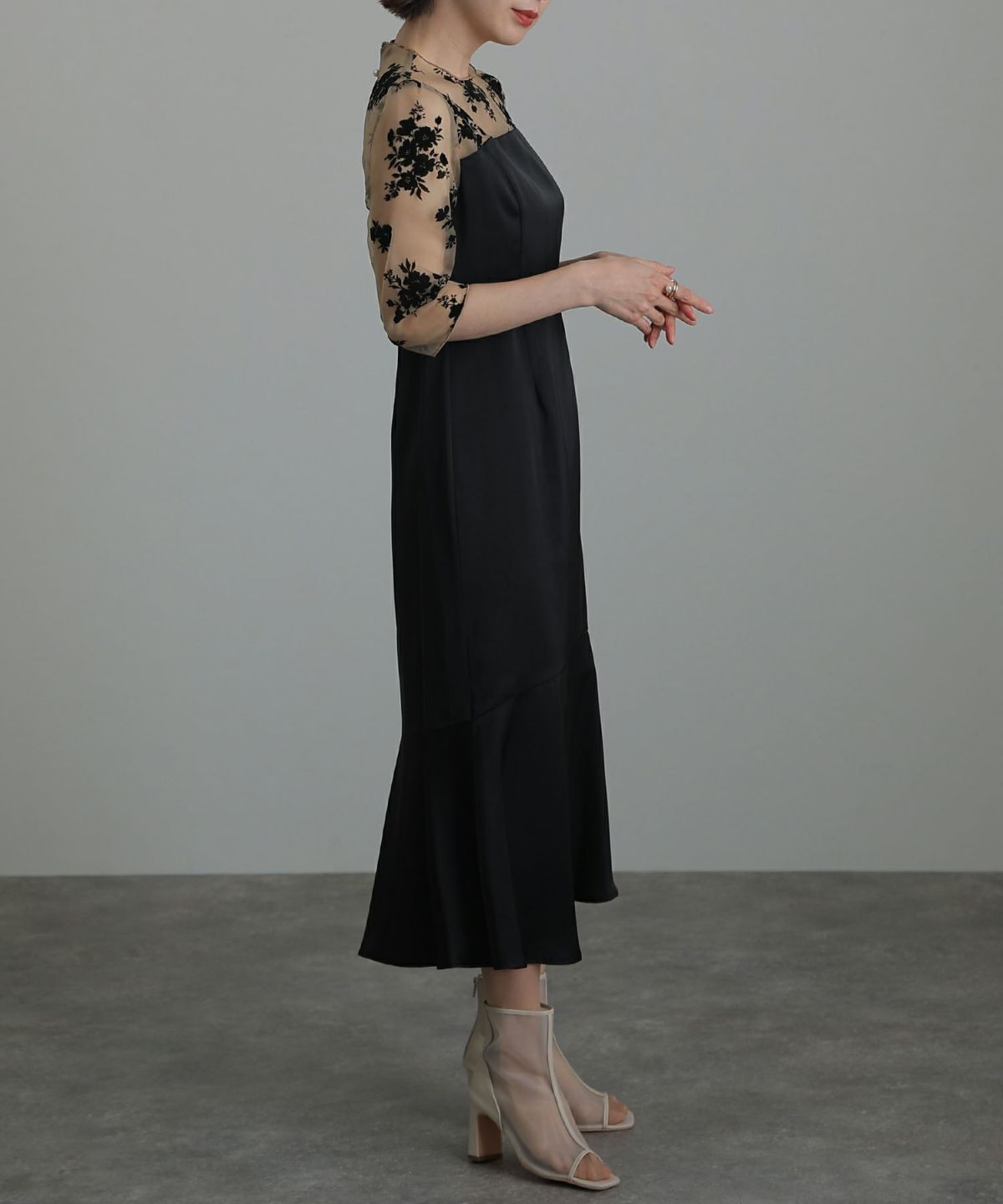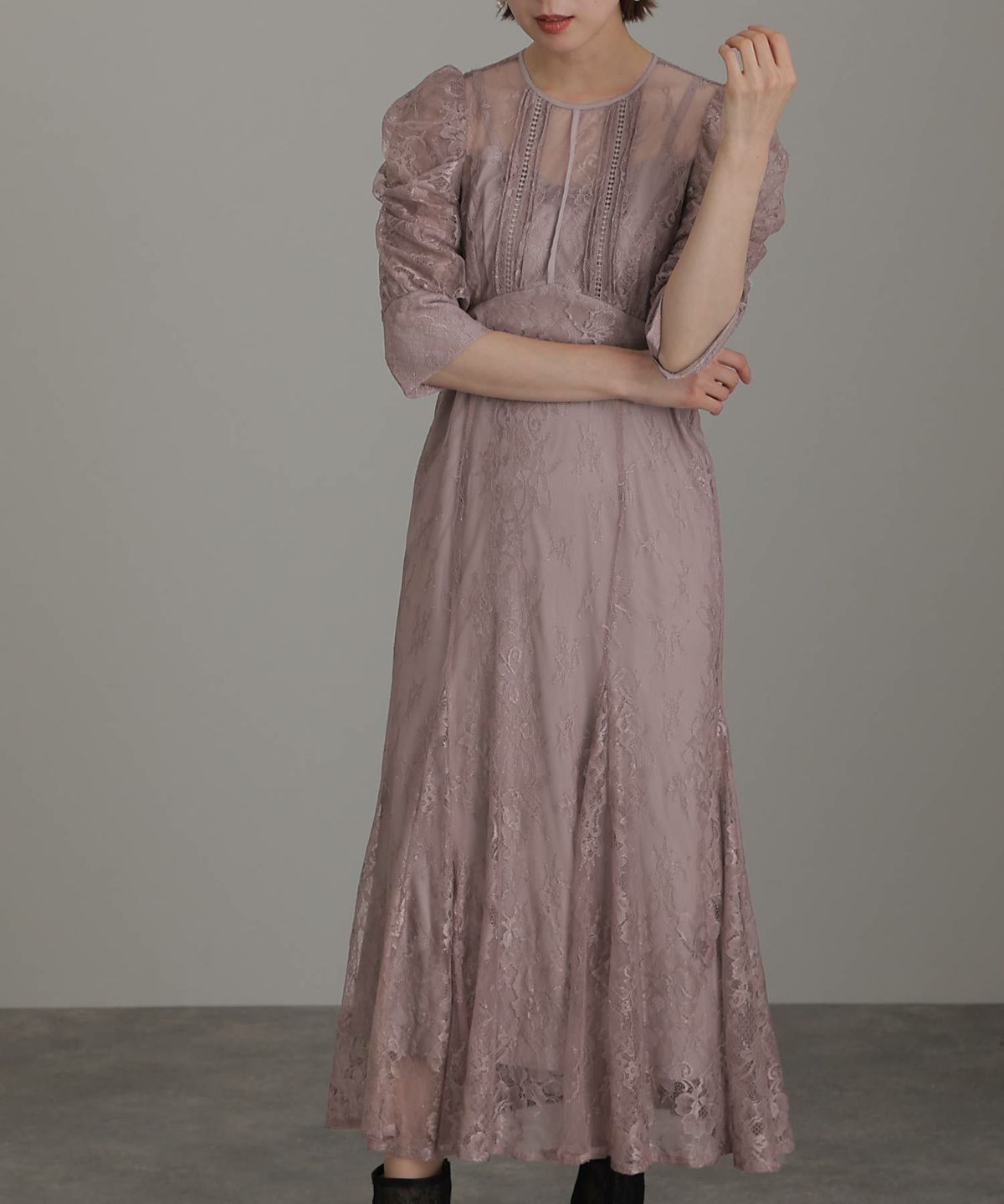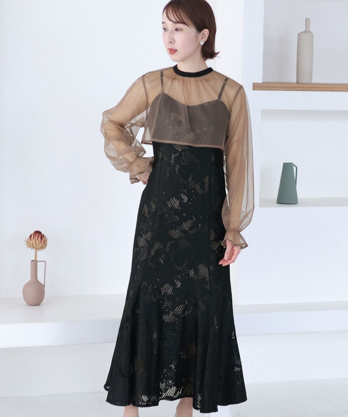 袖の程よい透け感で上品な印象に レースハイウエスト切替えマーメイドワンピース