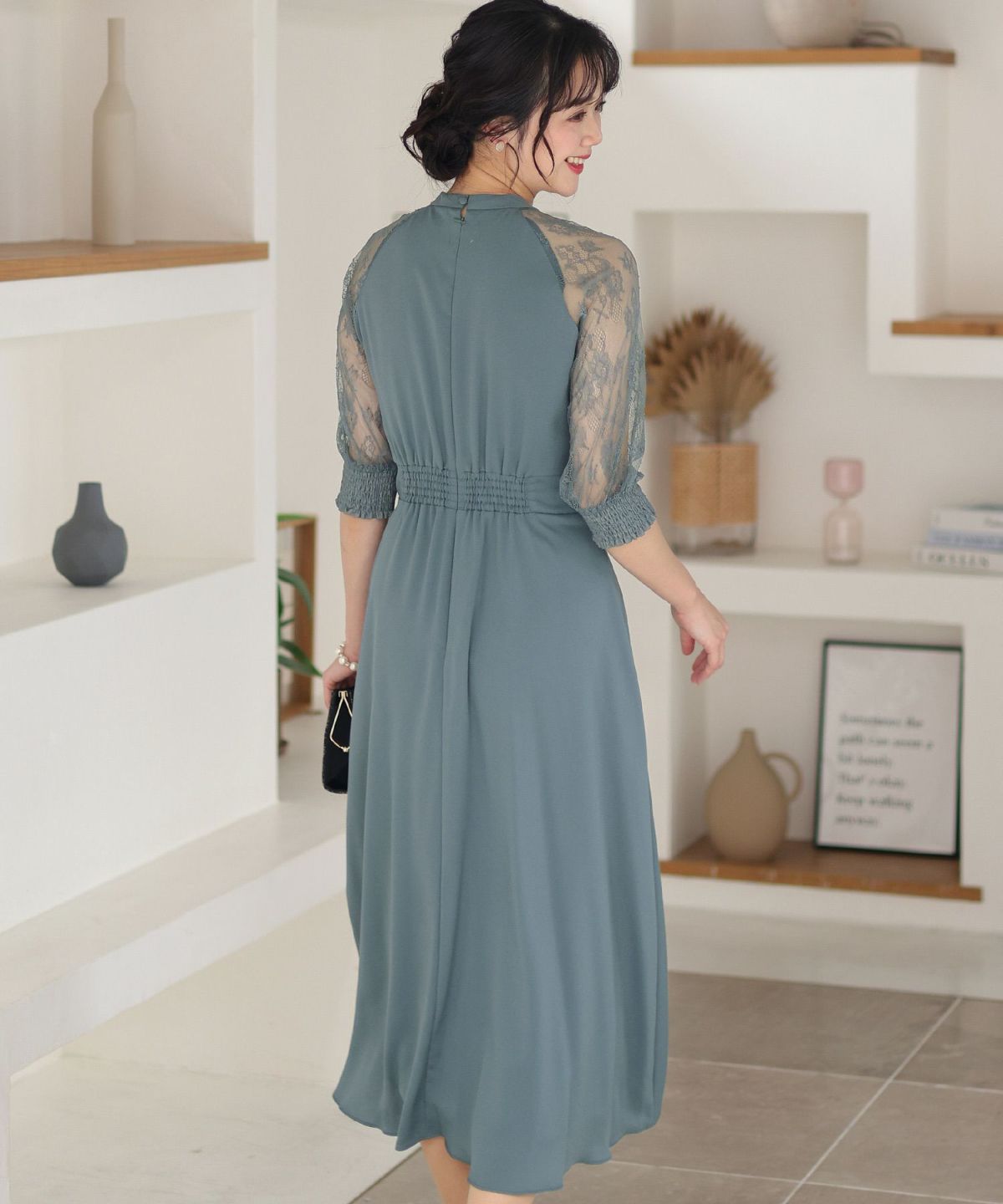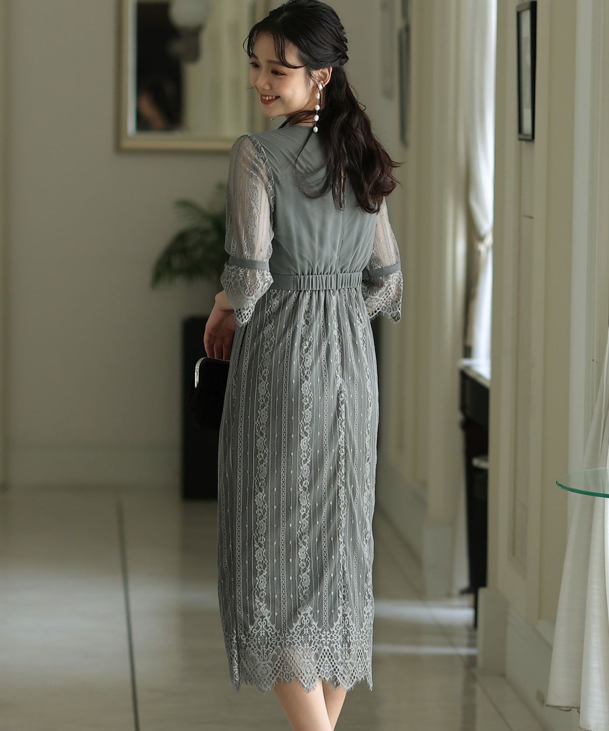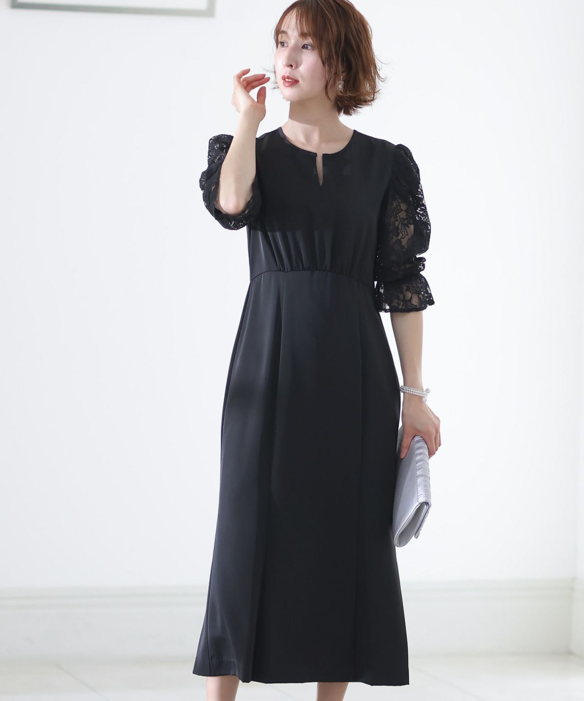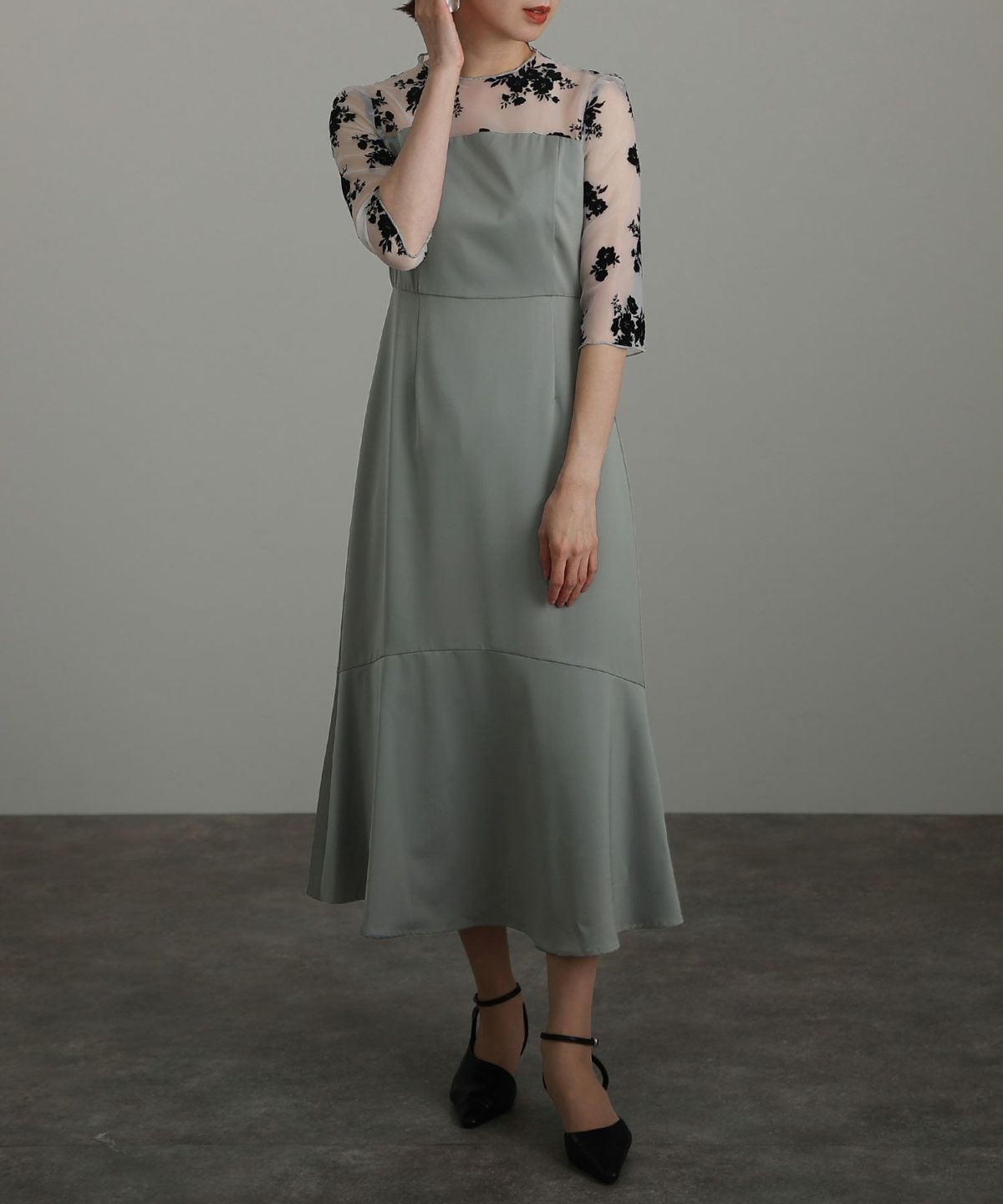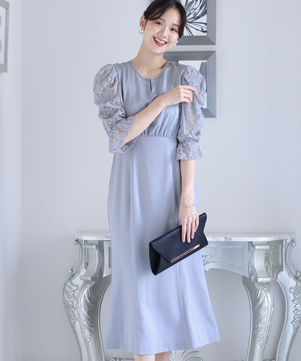 袖の程よい透け感で上品な印象に レースハイウエスト切替えマーメイドワンピース