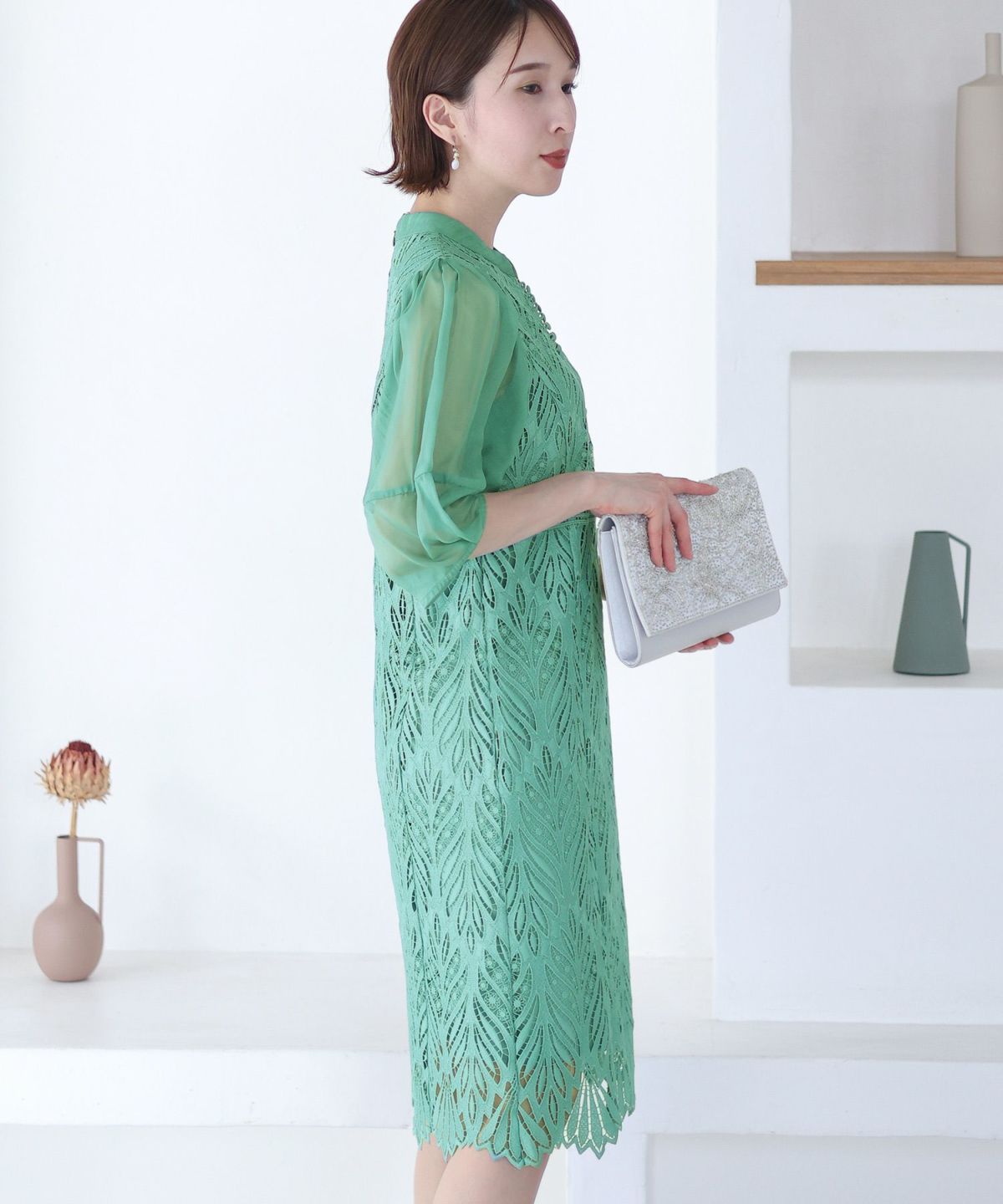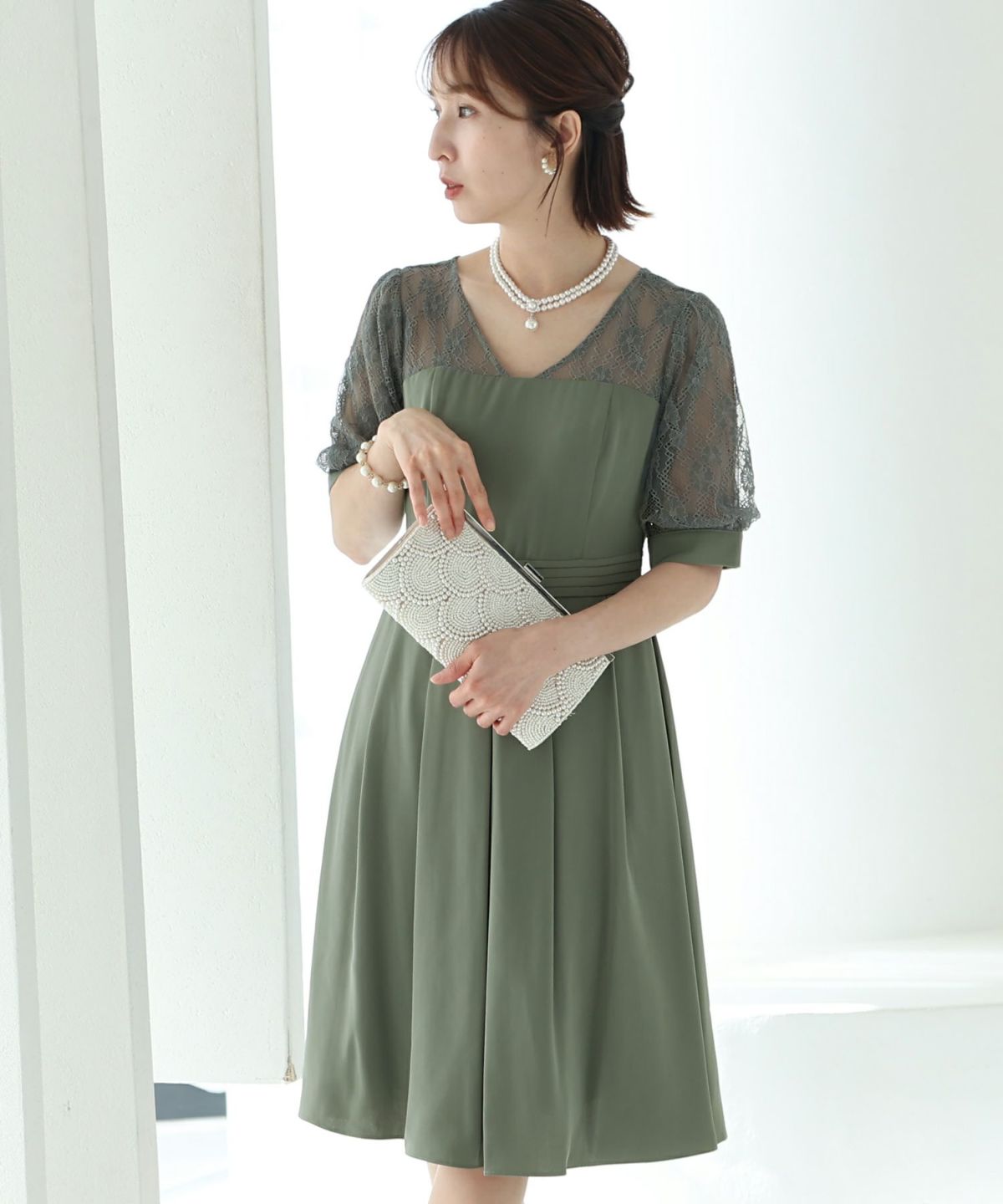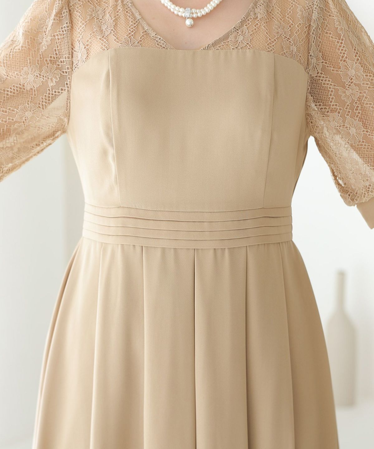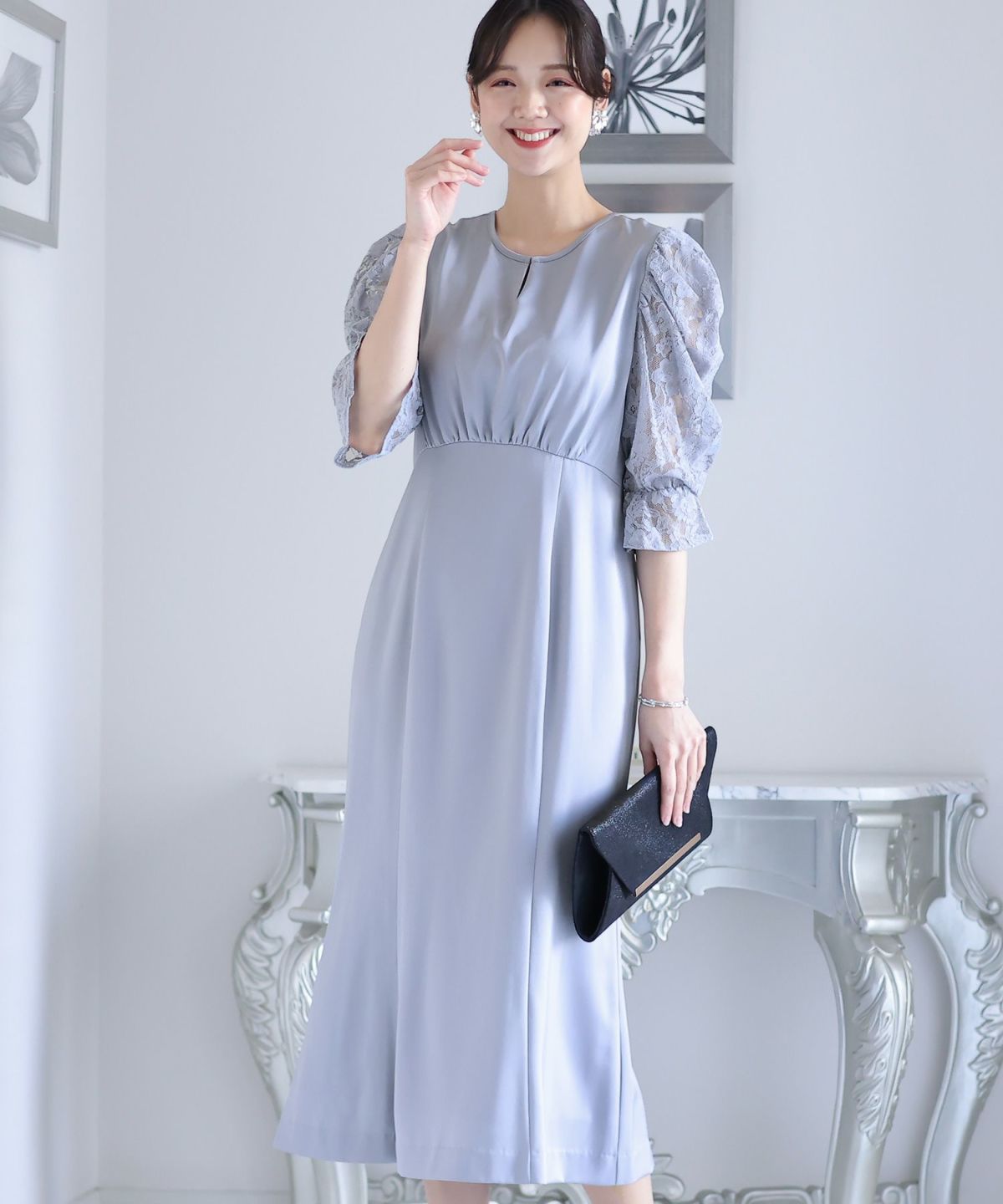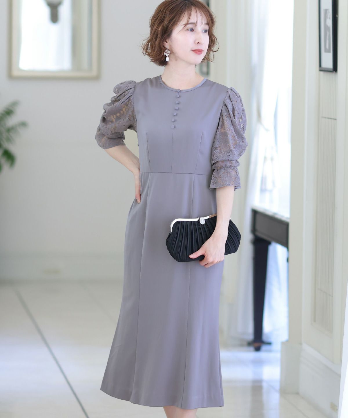 袖の程よい透け感で上品な印象に レースハイウエスト切替えマーメイドワンピース