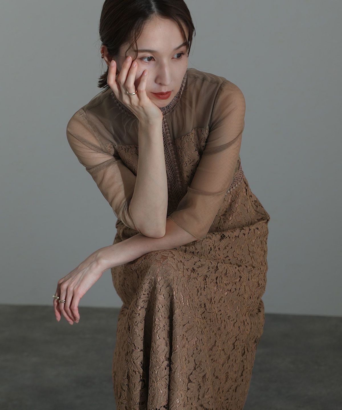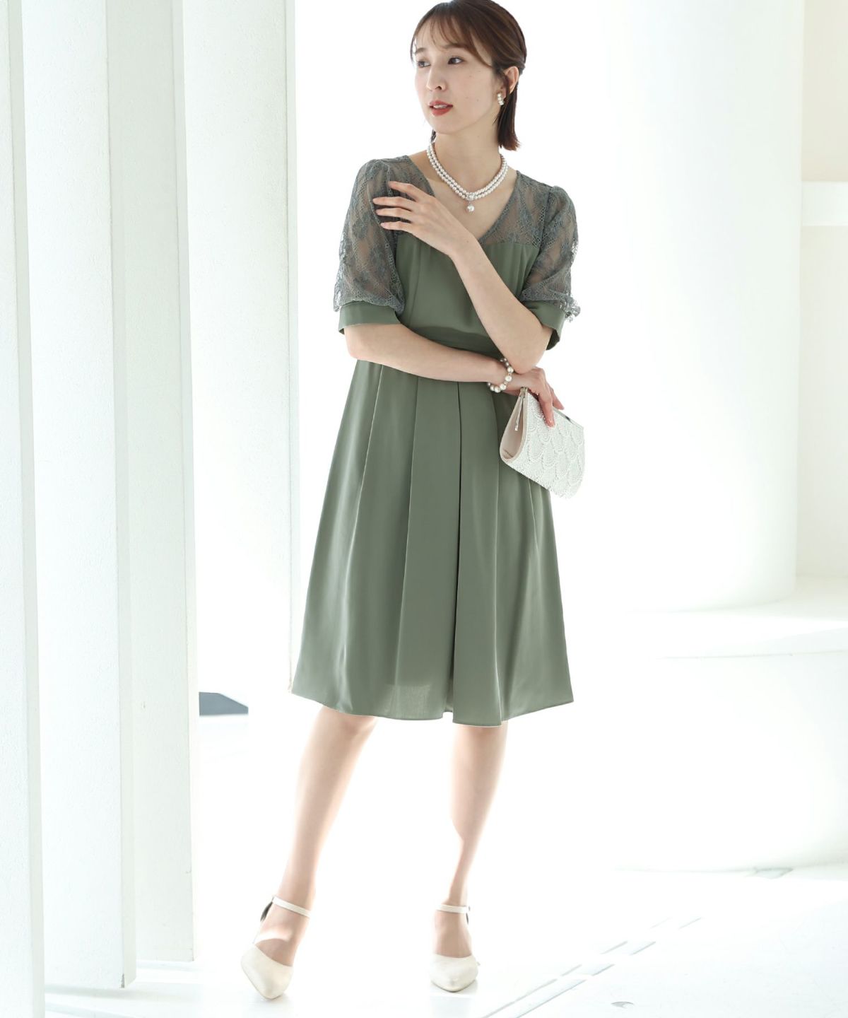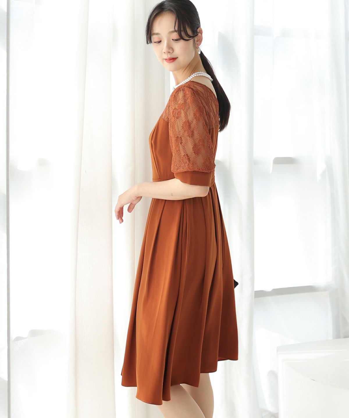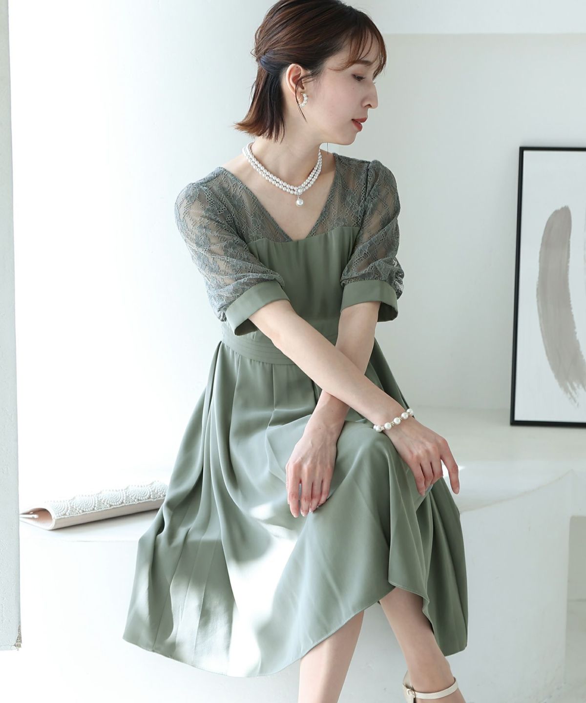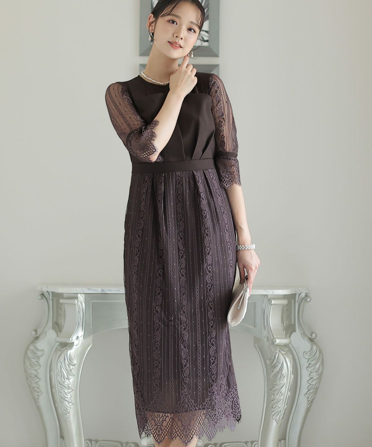 袖の程よい透け感で上品な印象に レースハイウエスト切替えマーメイドワンピース