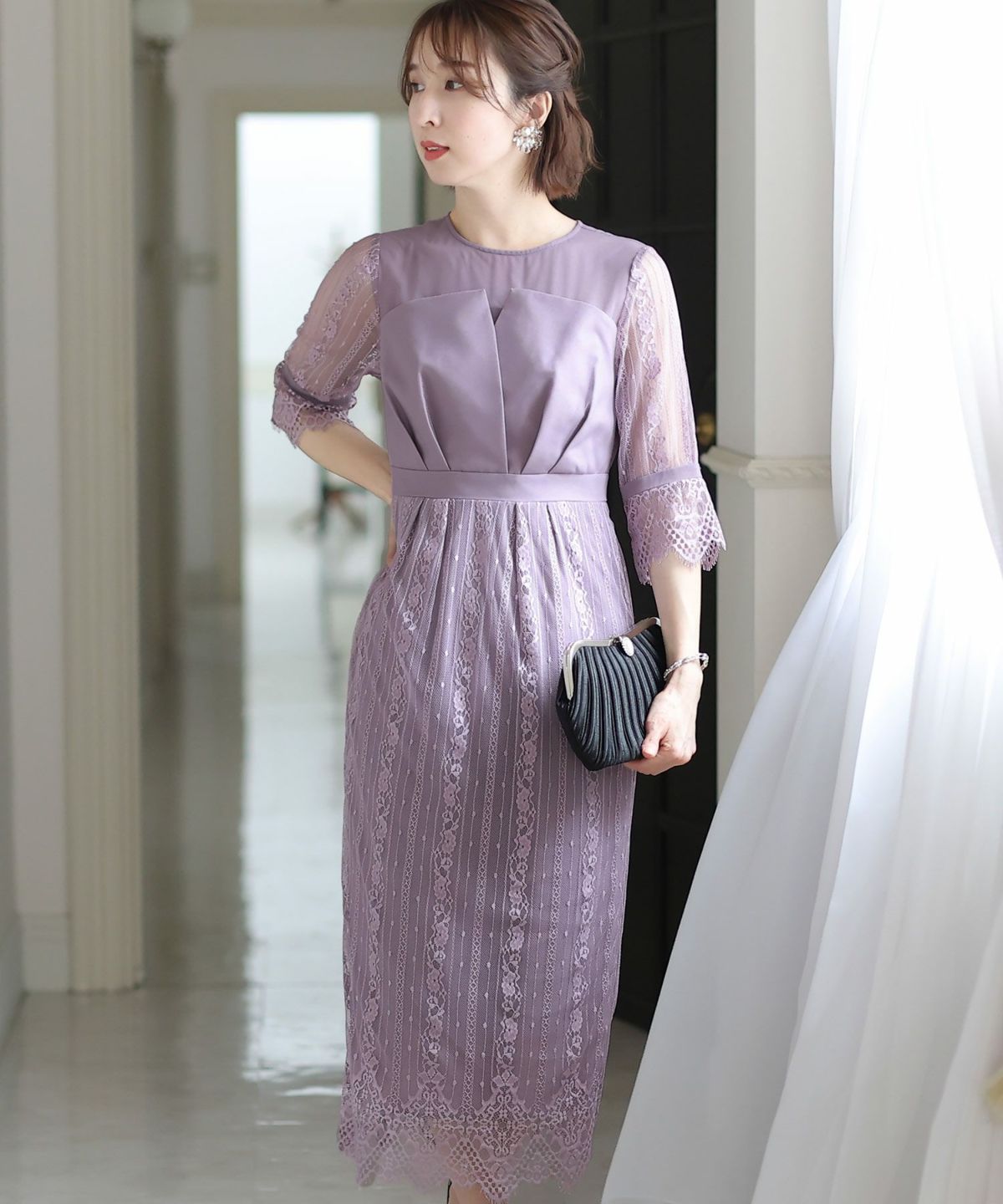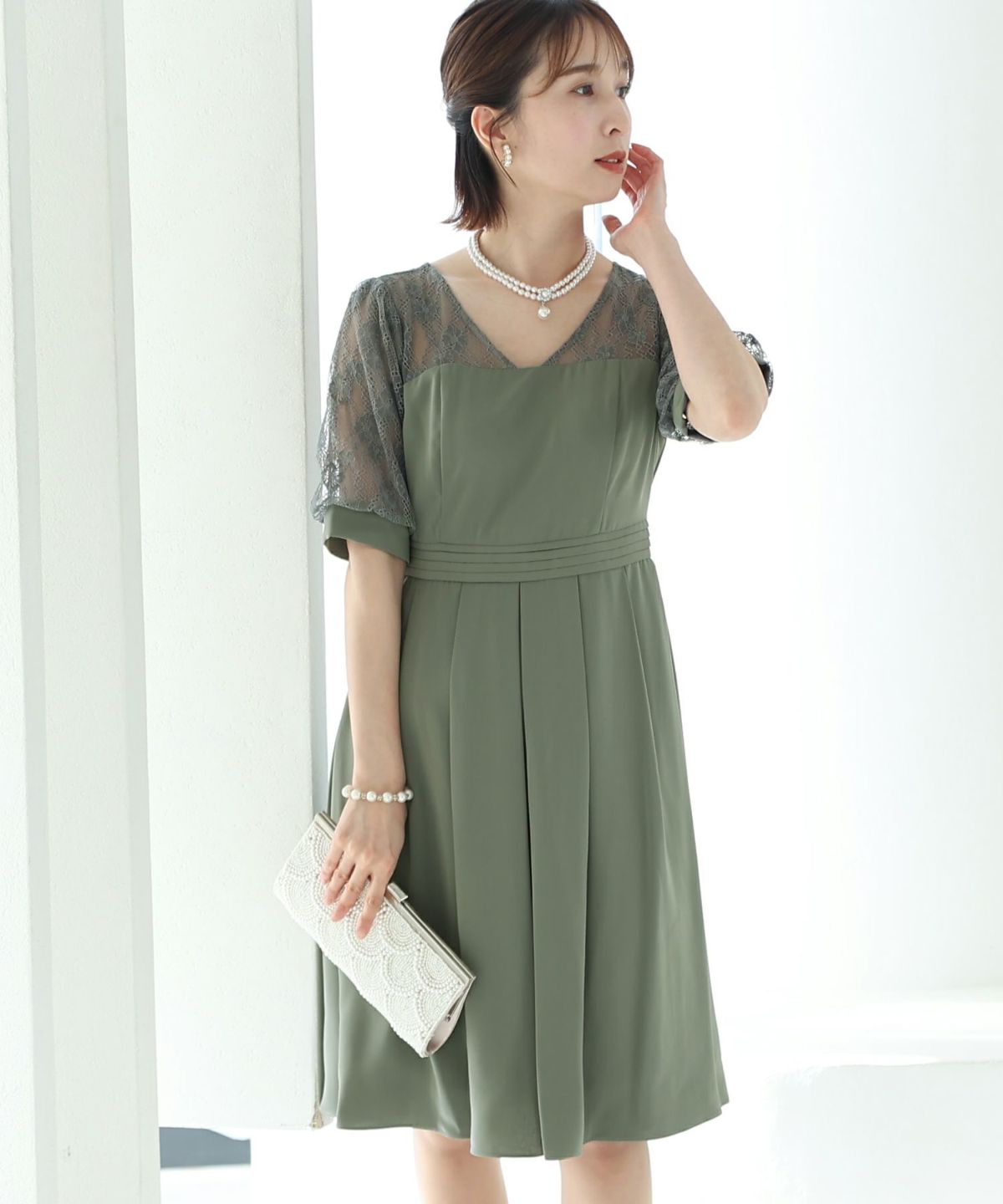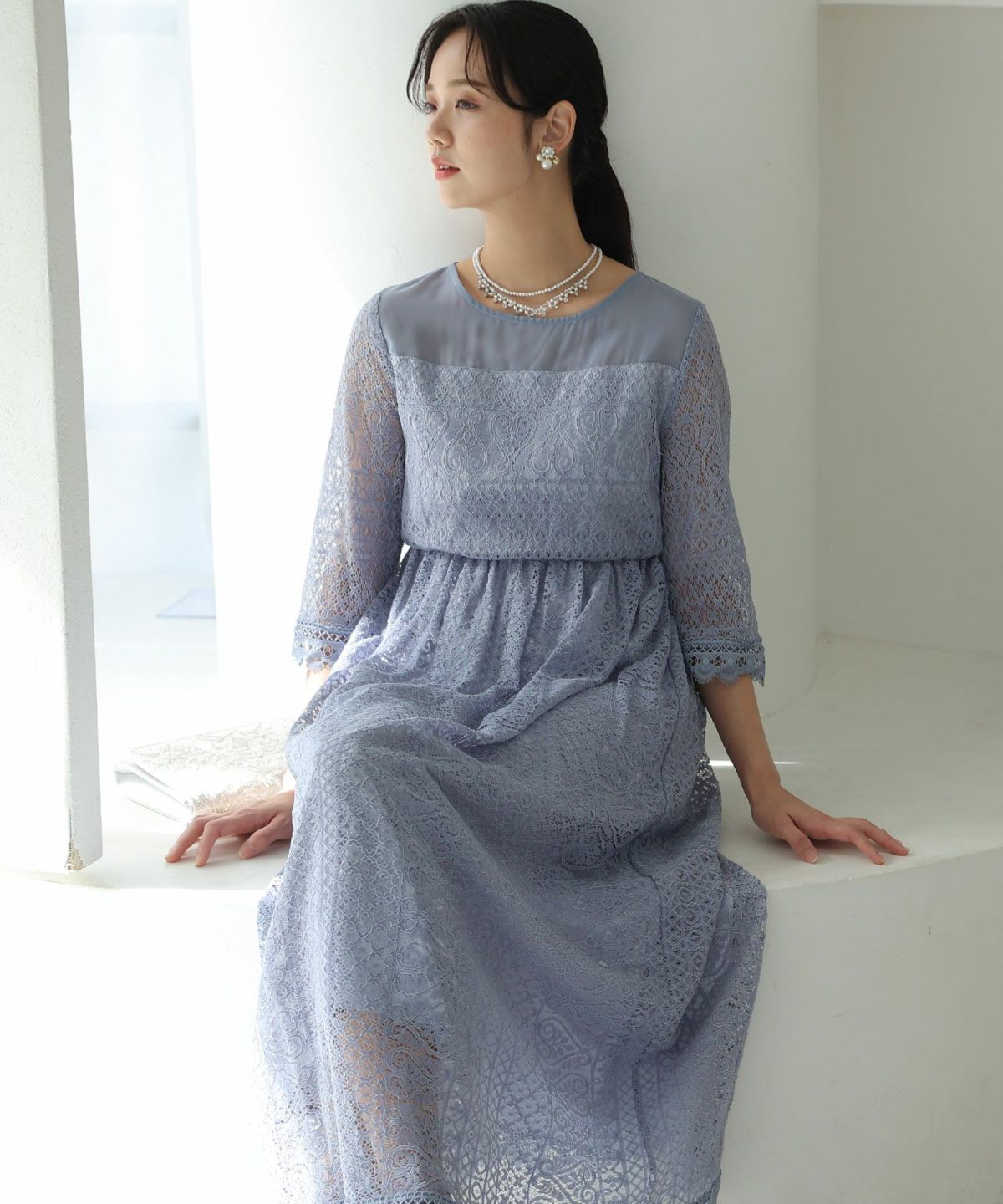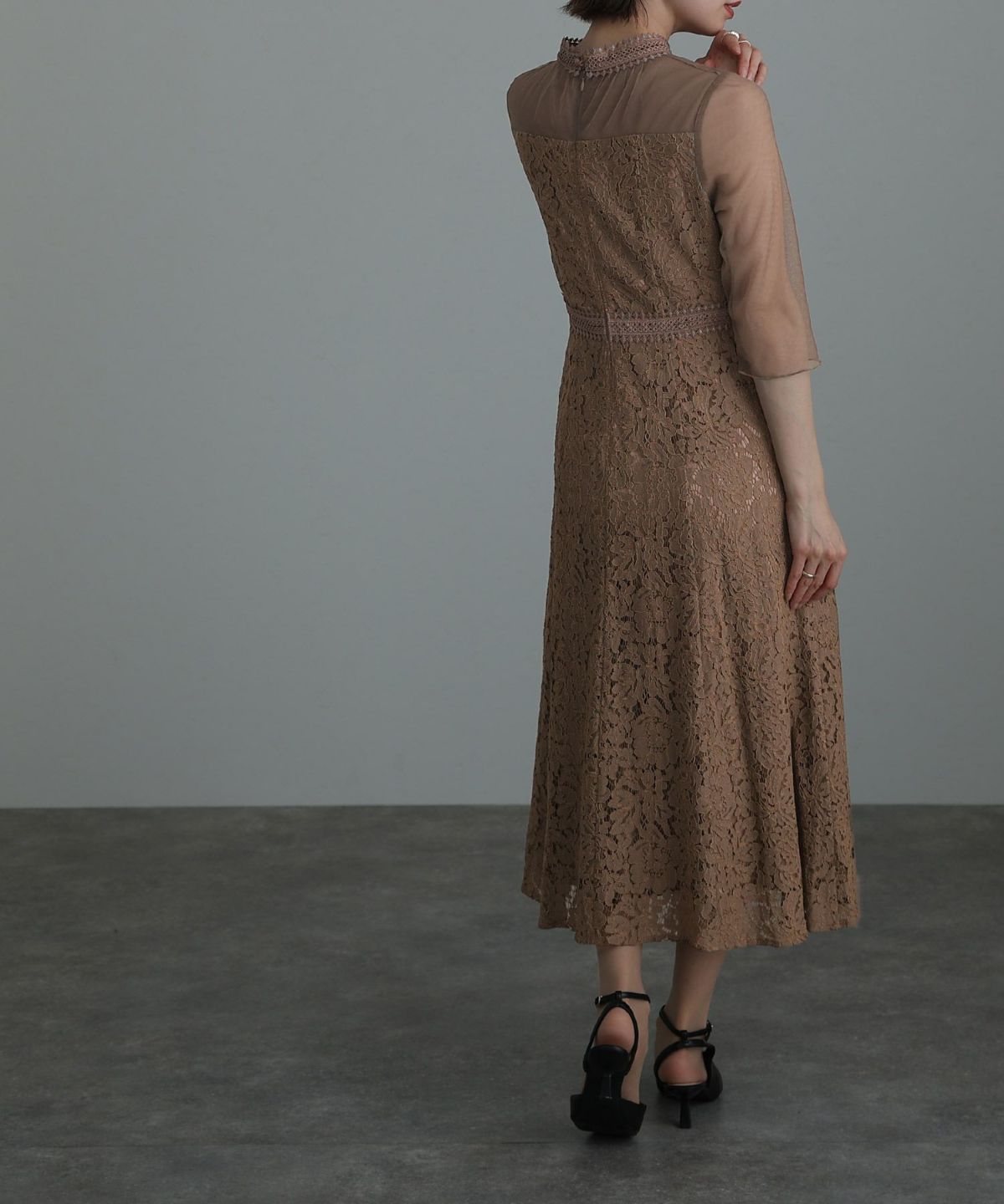 袖の程よい透け感で上品な印象に レースハイウエスト切替えマーメイドワンピース