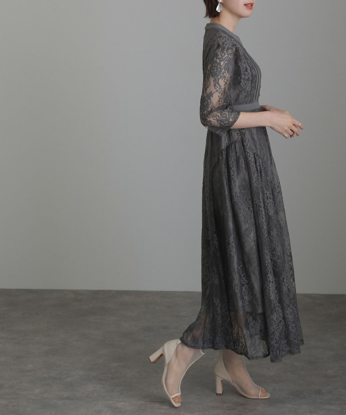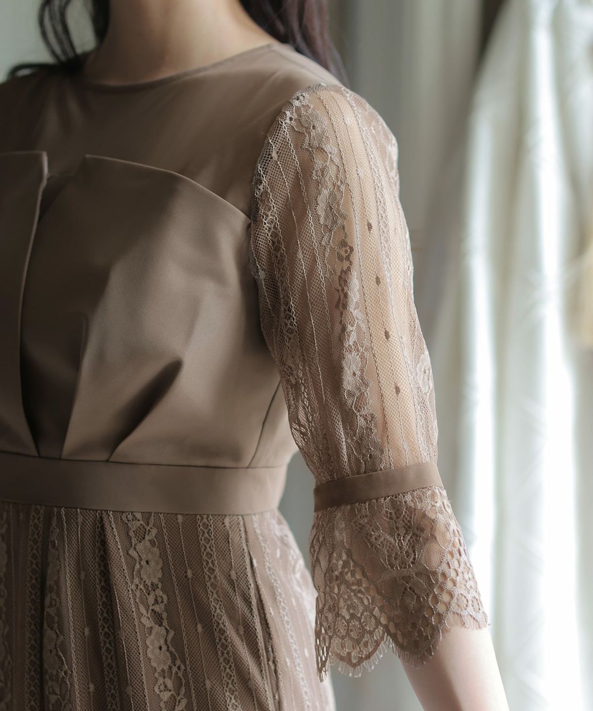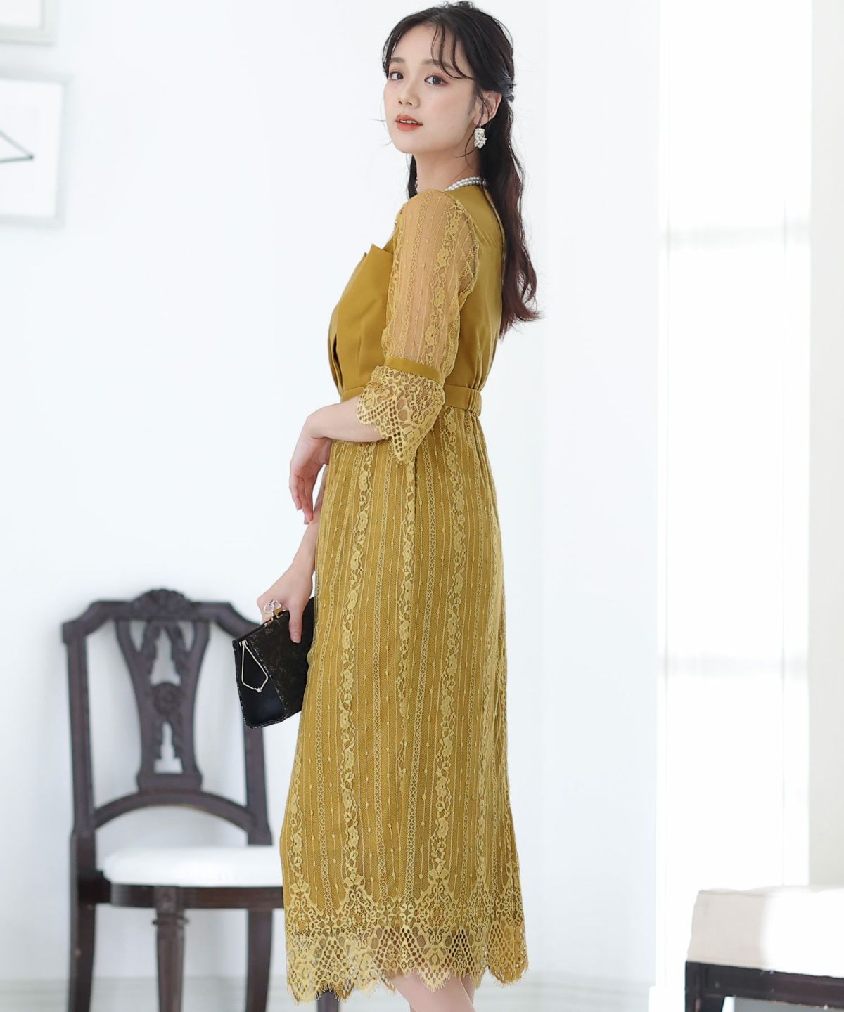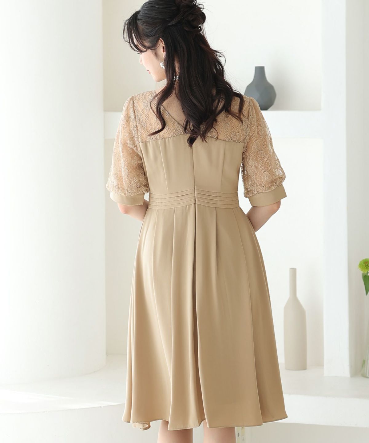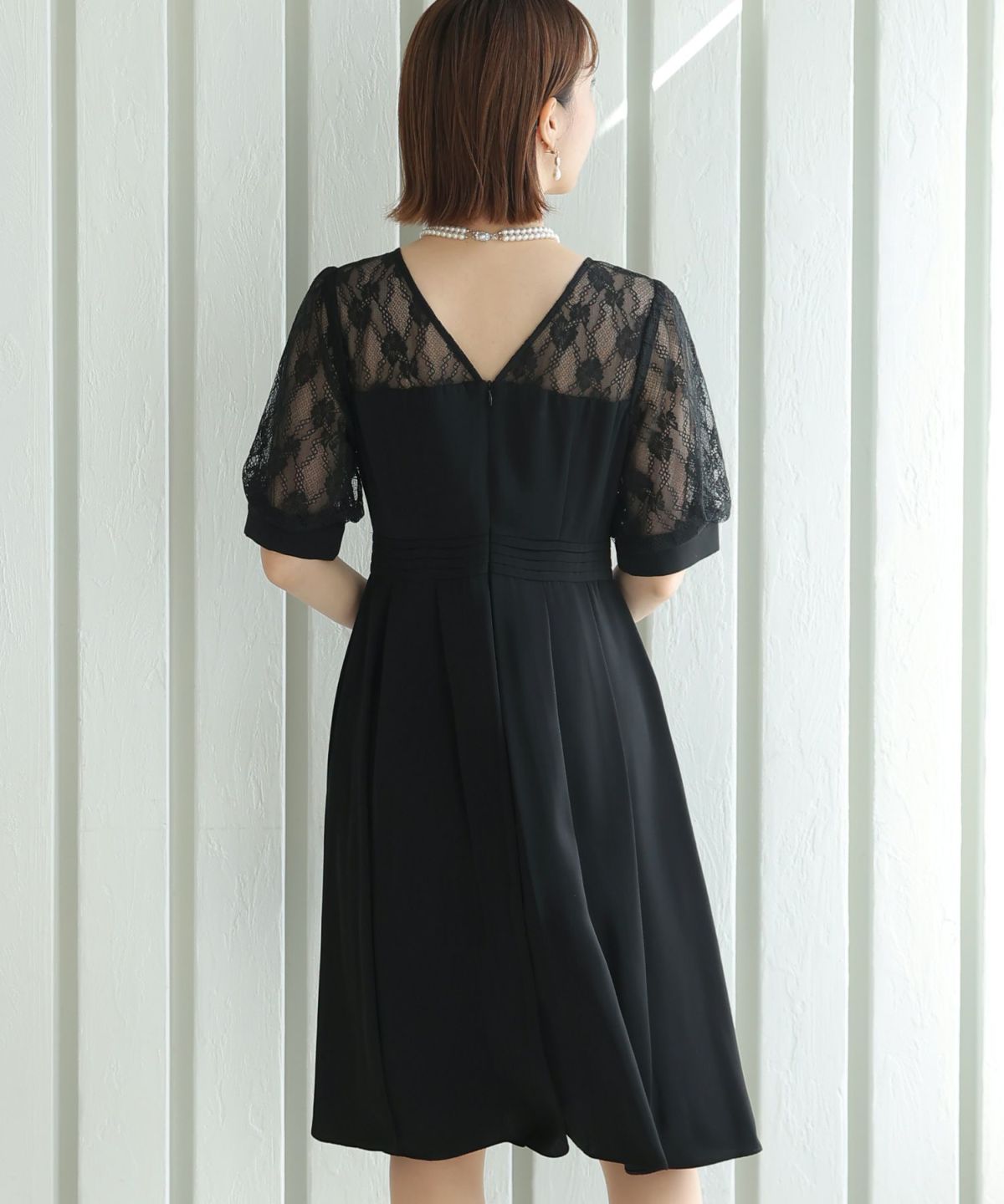 袖の程よい透け感で上品な印象に レースハイウエスト切替えマーメイドワンピース