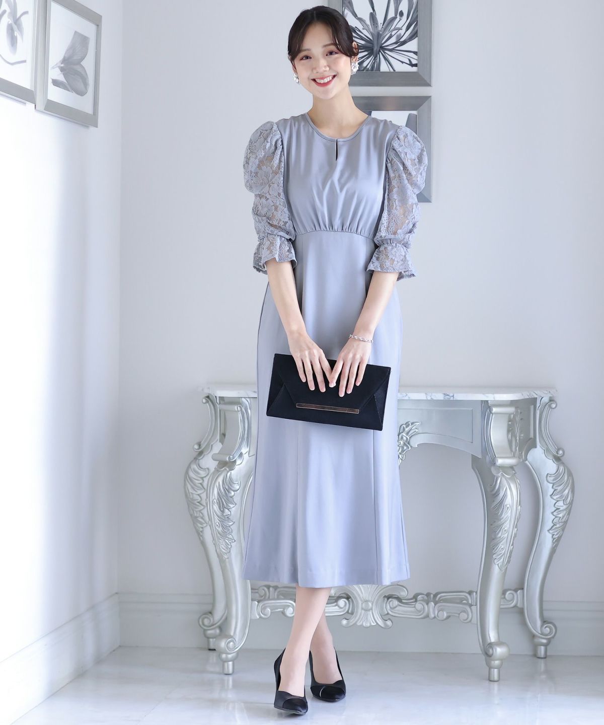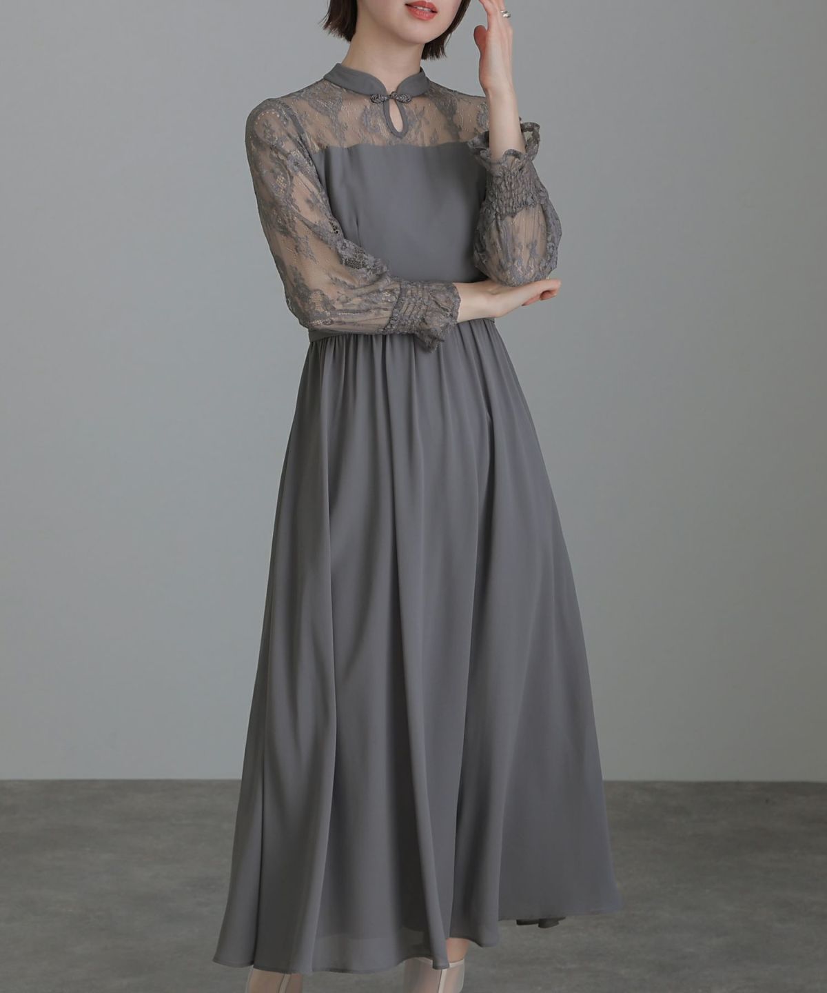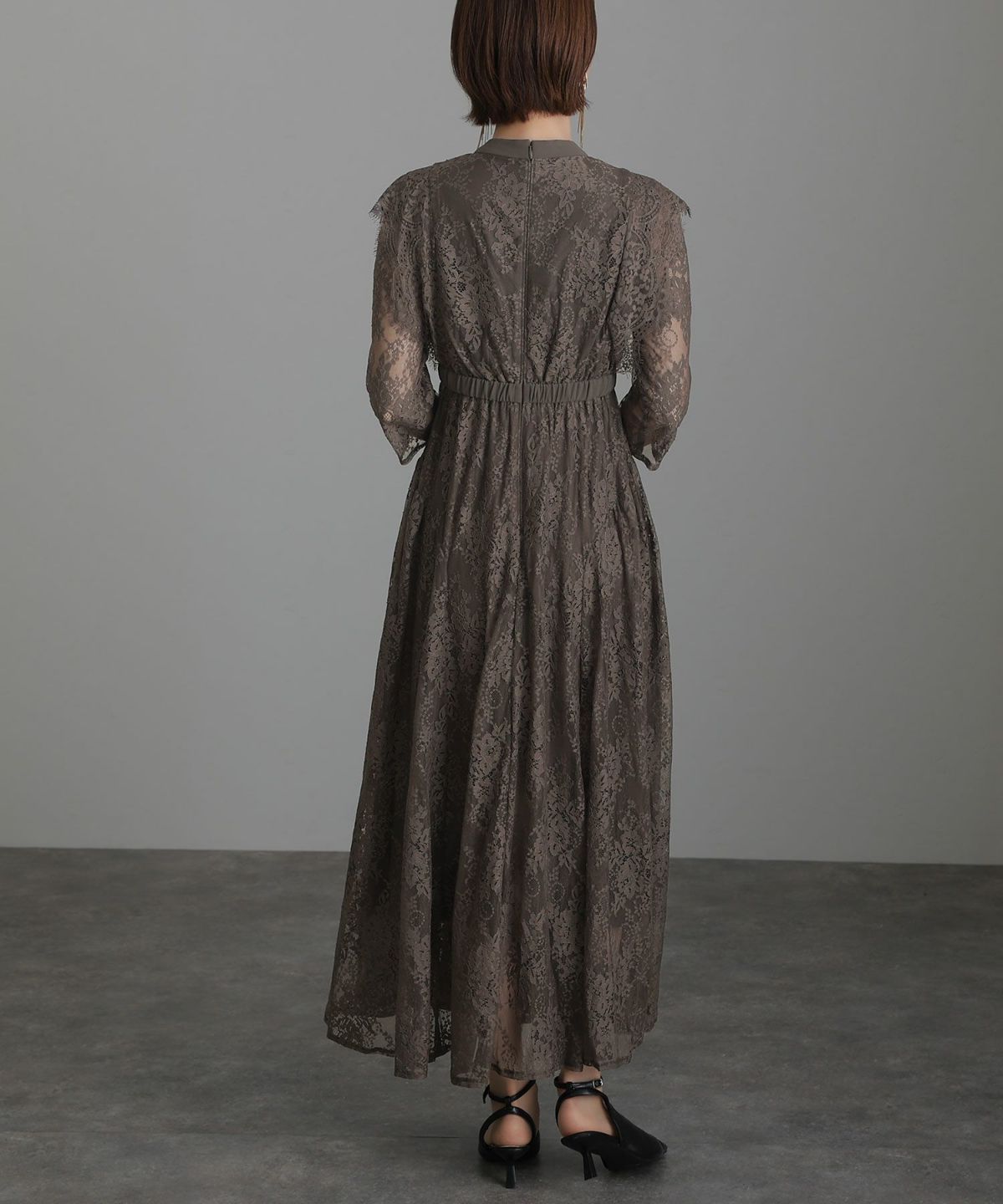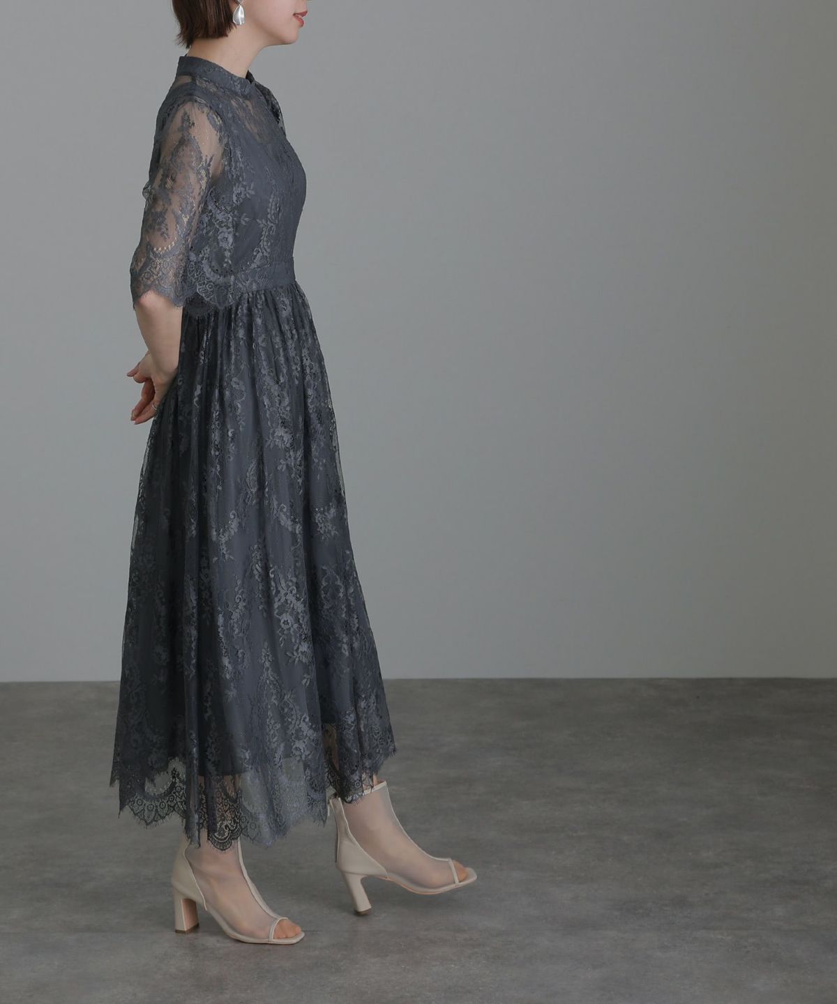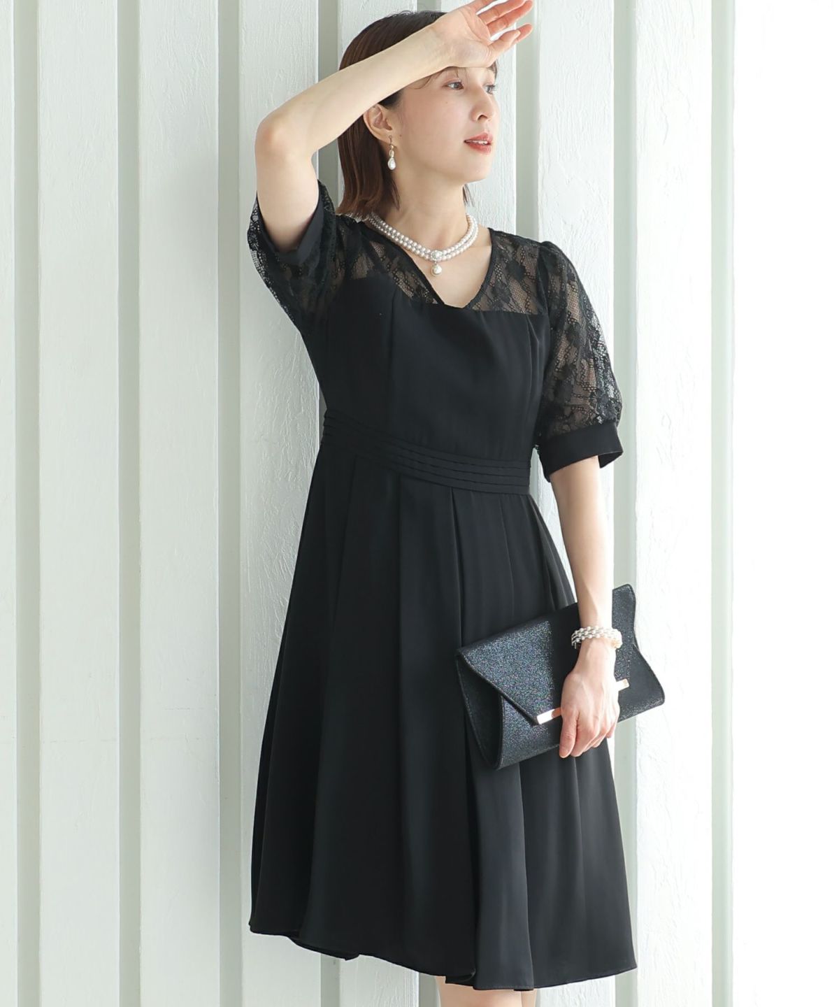 袖の程よい透け感で上品な印象に レースハイウエスト切替えマーメイドワンピース