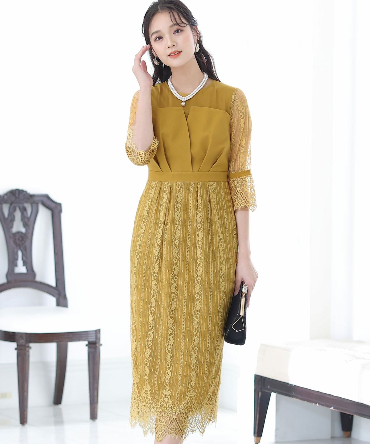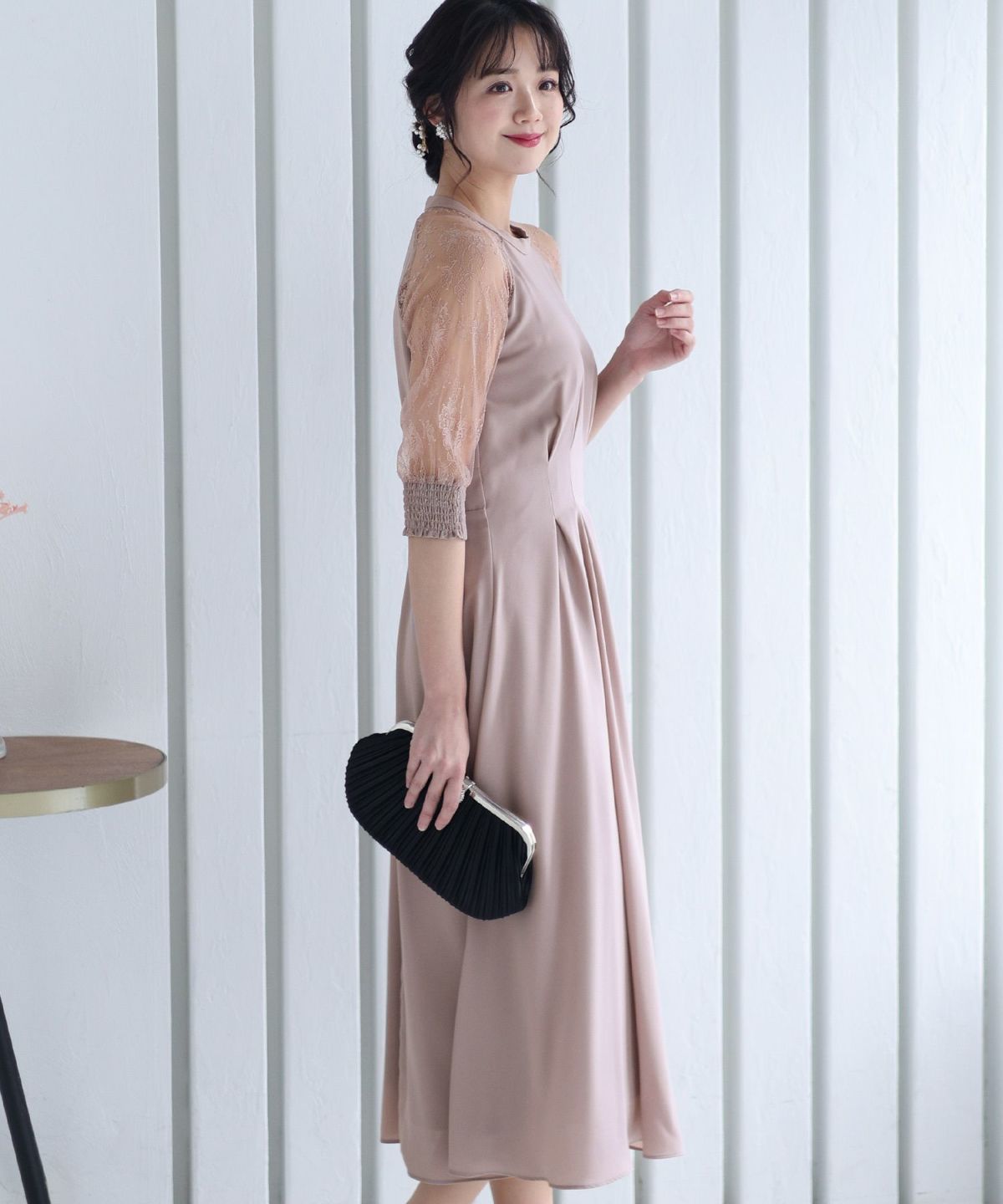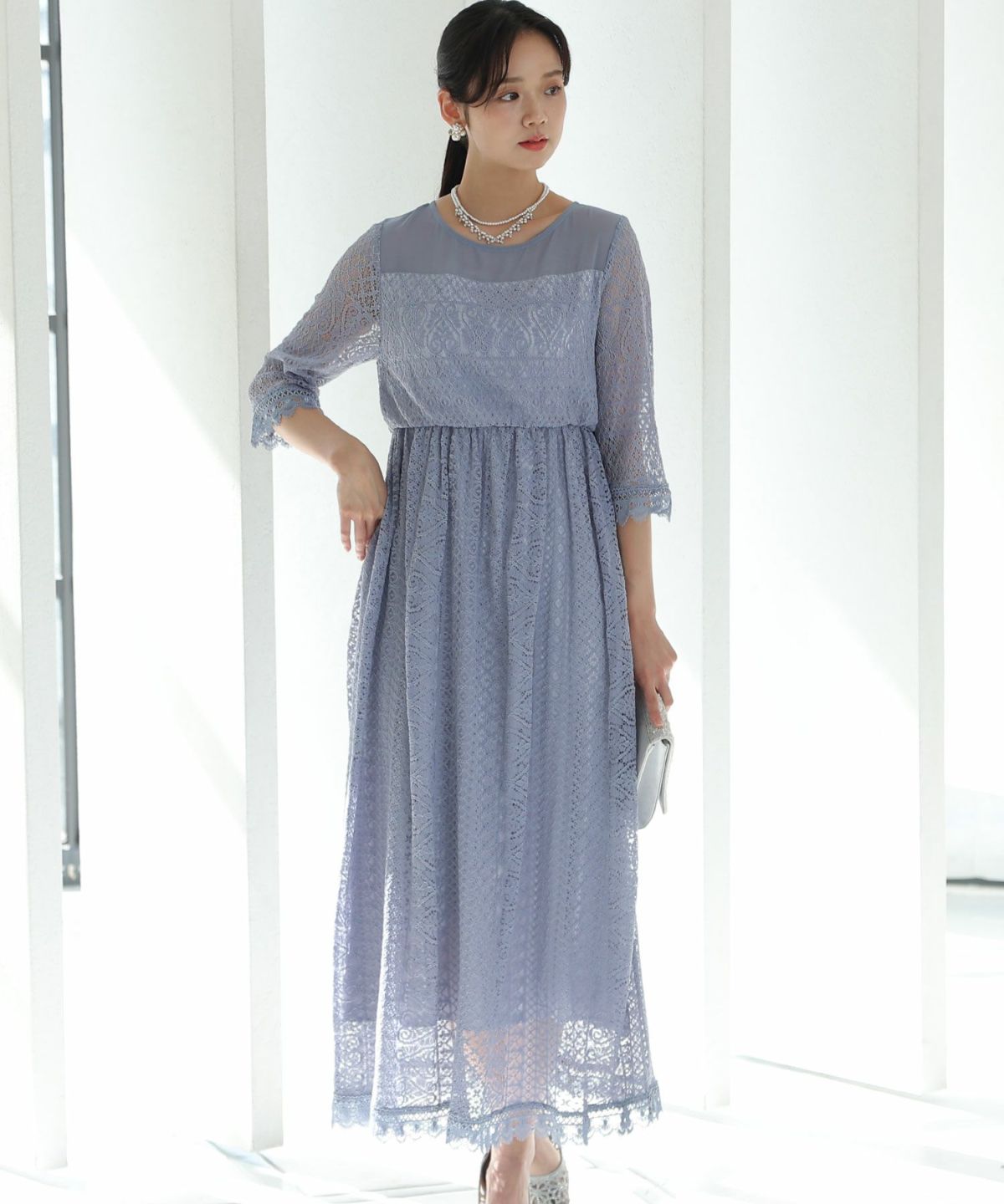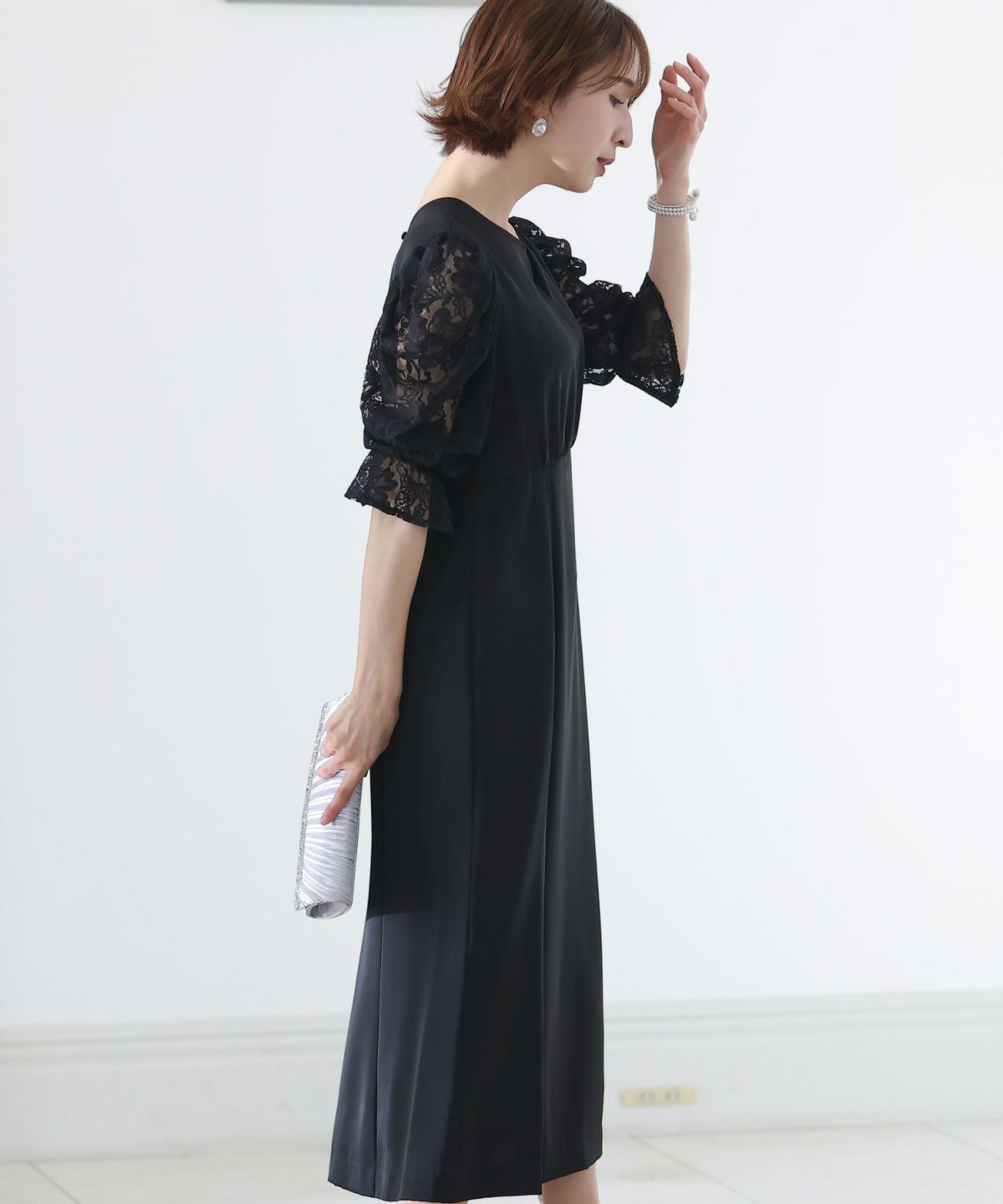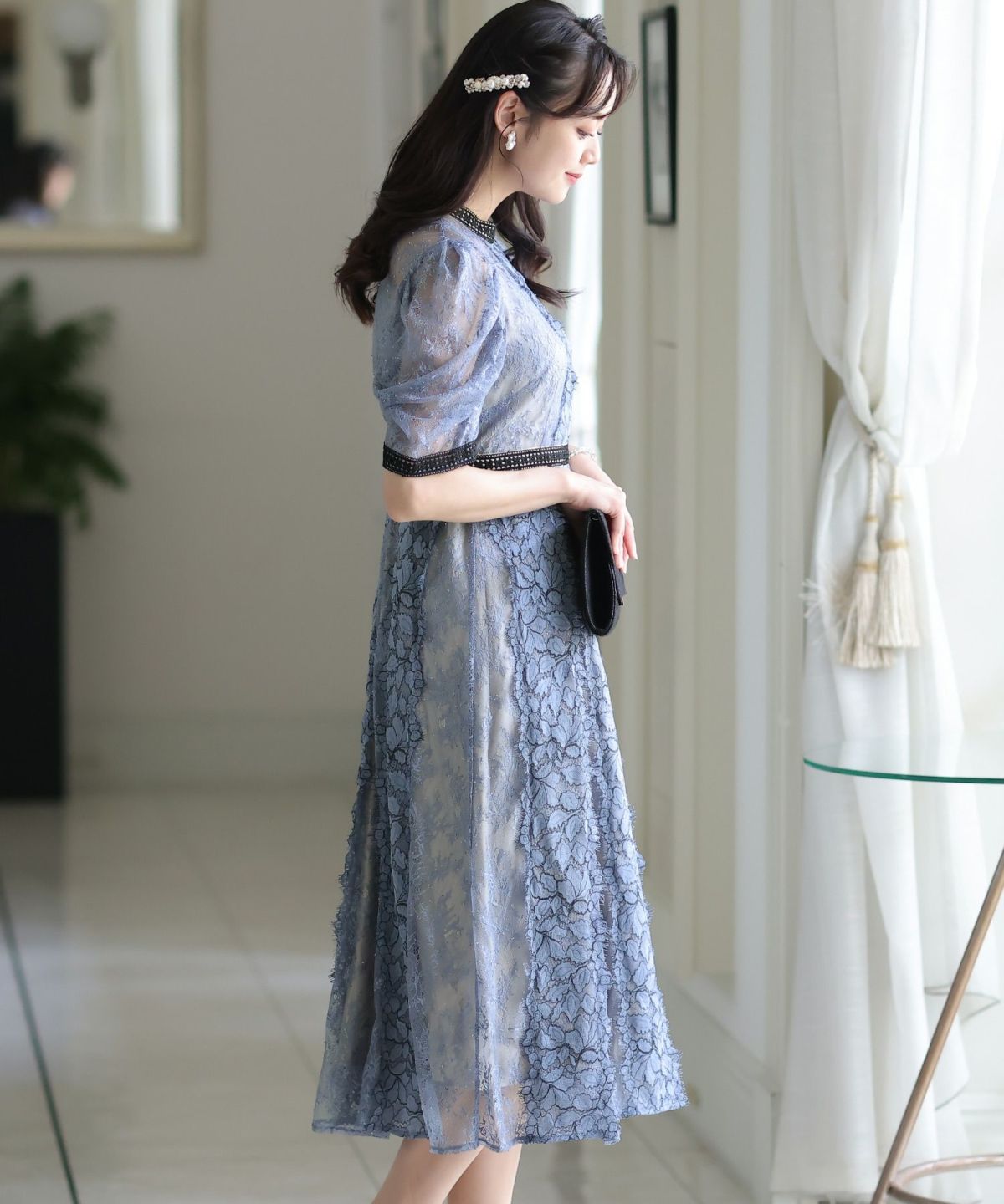 袖の程よい透け感で上品な印象に レースハイウエスト切替えマーメイドワンピース