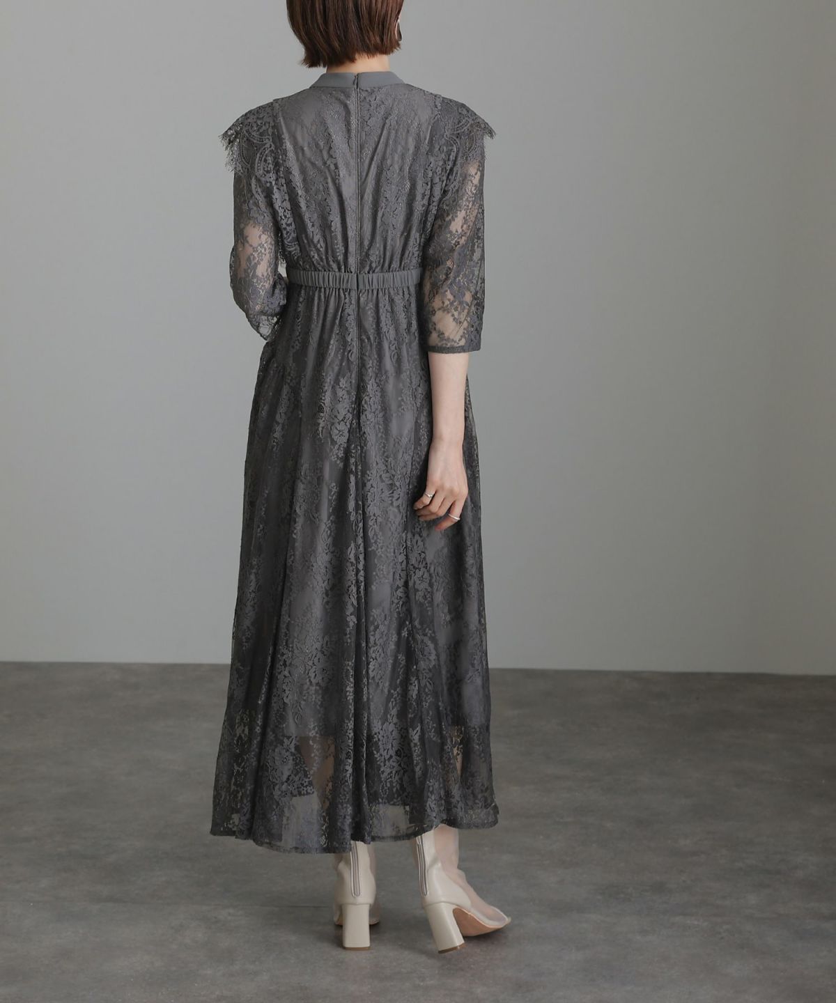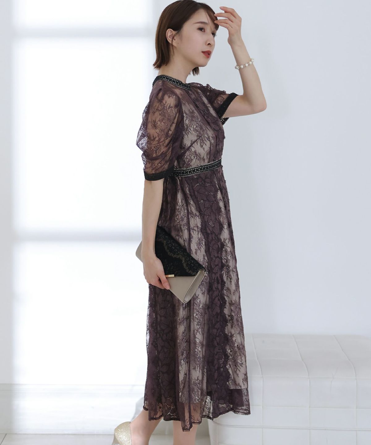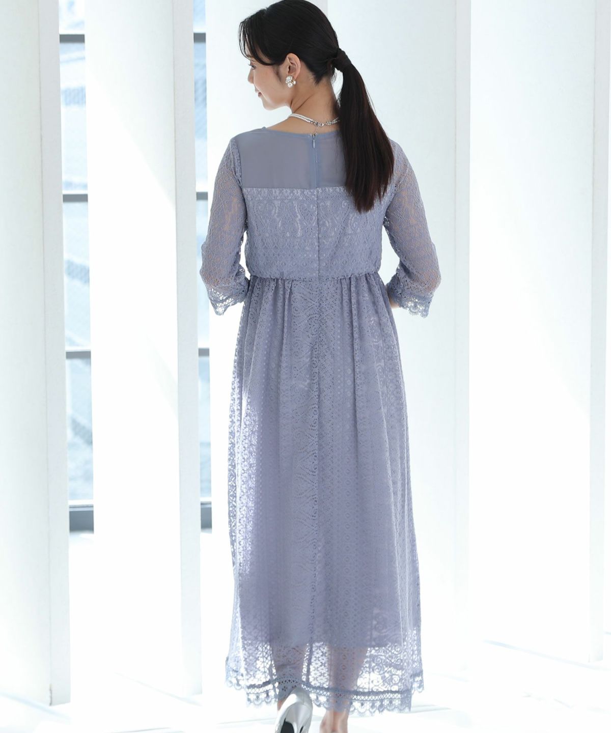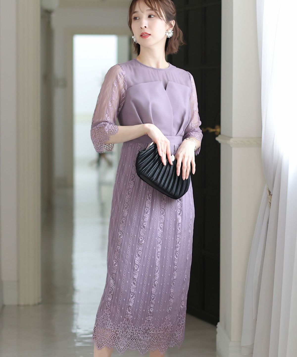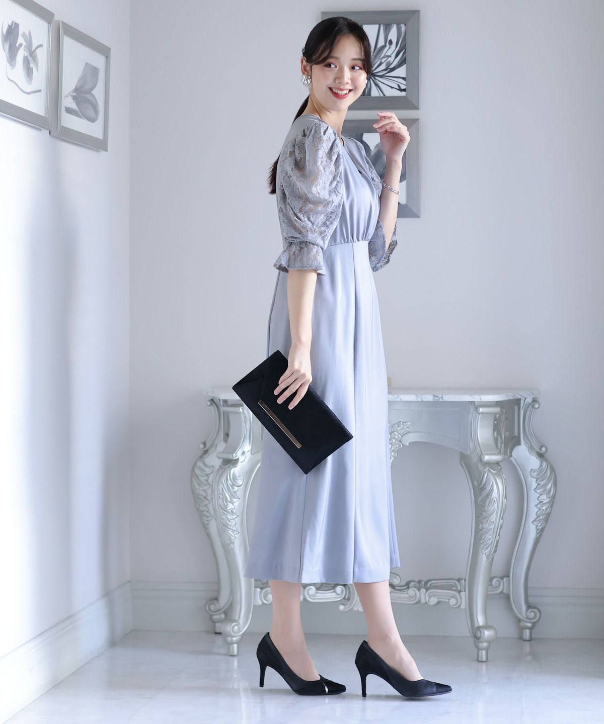 袖の程よい透け感で上品な印象に レースハイウエスト切替えマーメイドワンピース