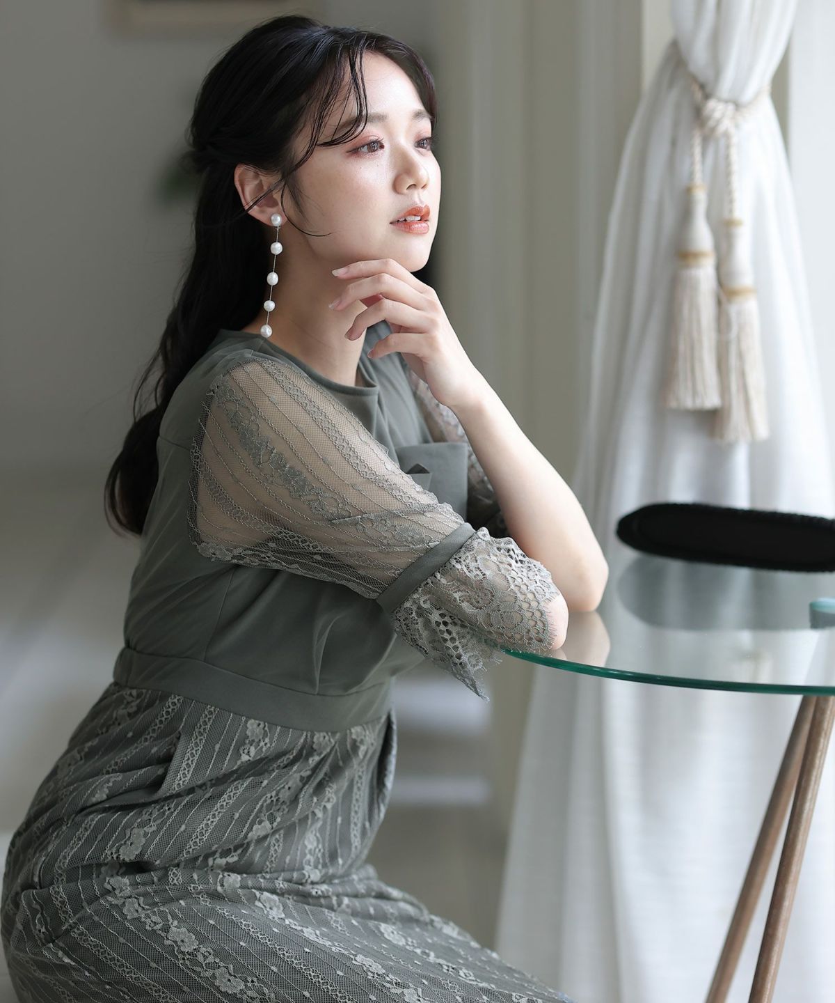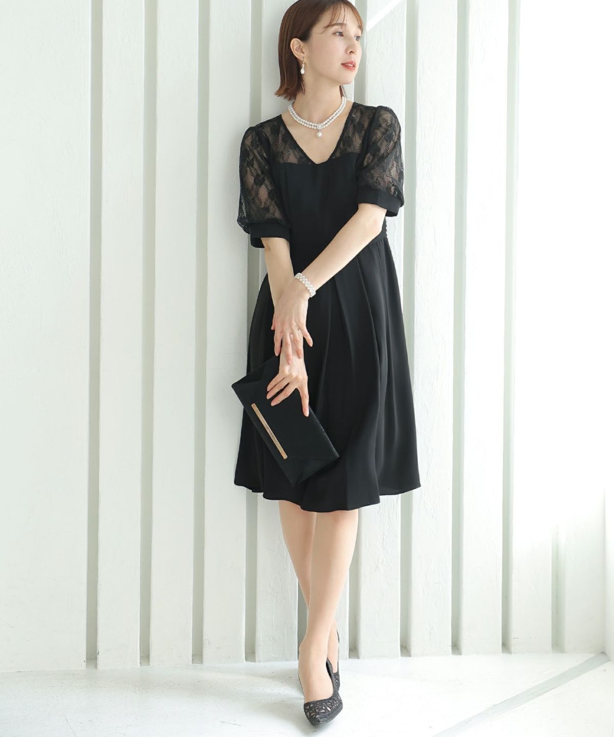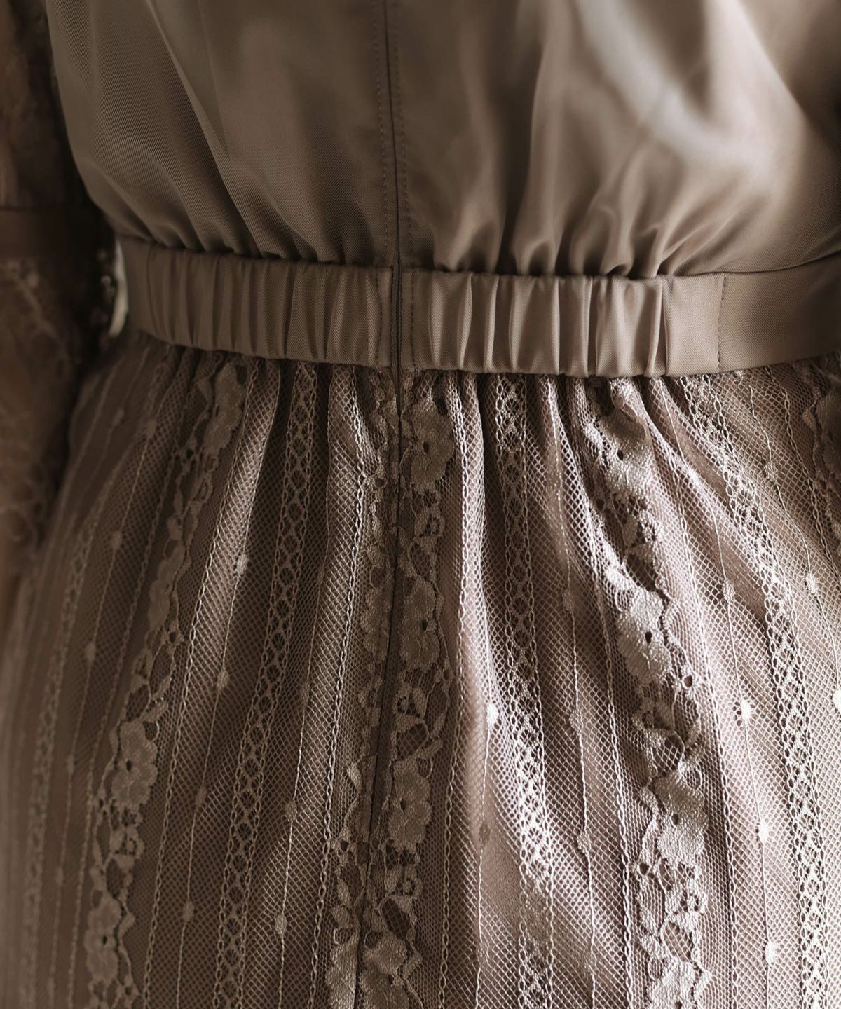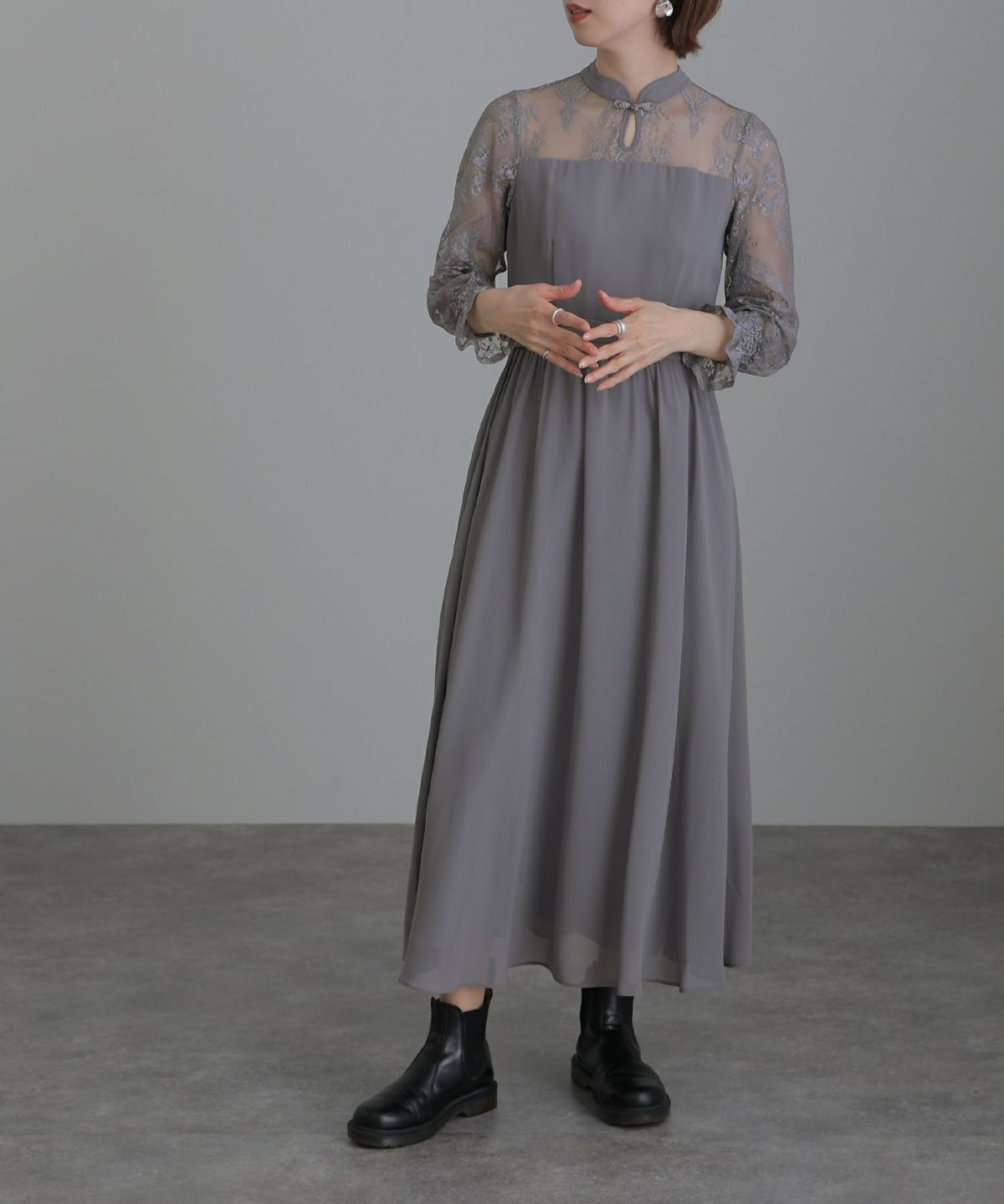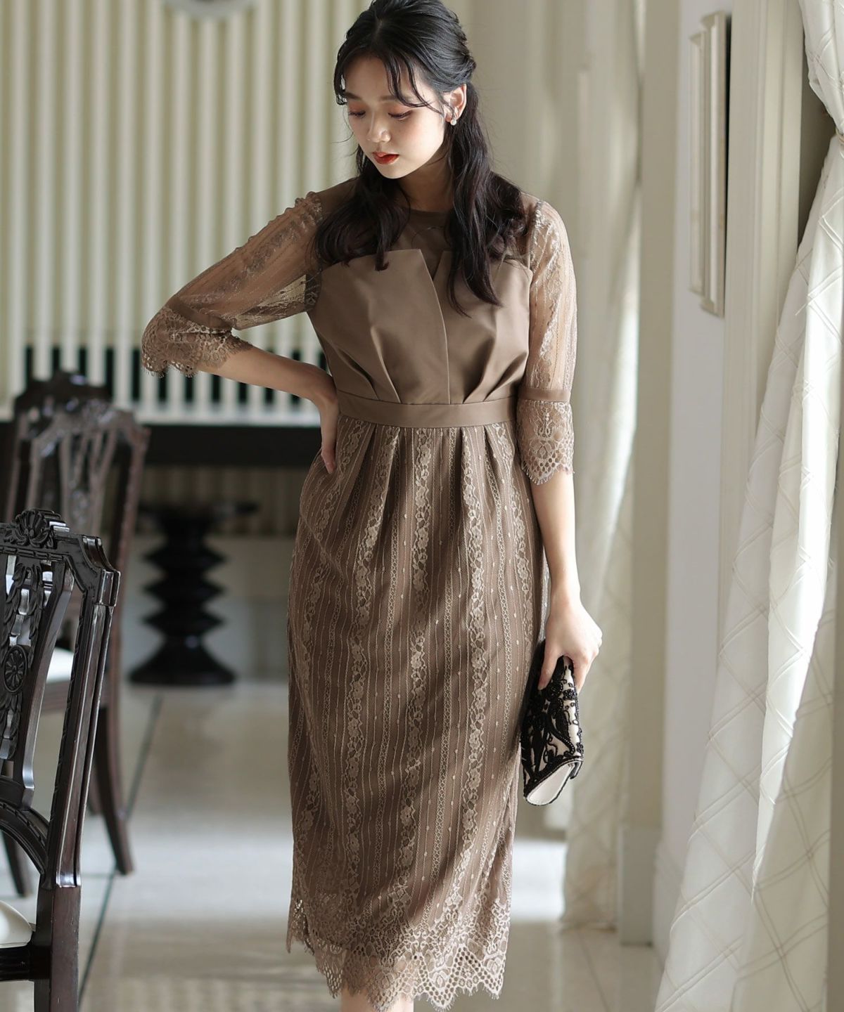 袖の程よい透け感で上品な印象に レースハイウエスト切替えマーメイドワンピース