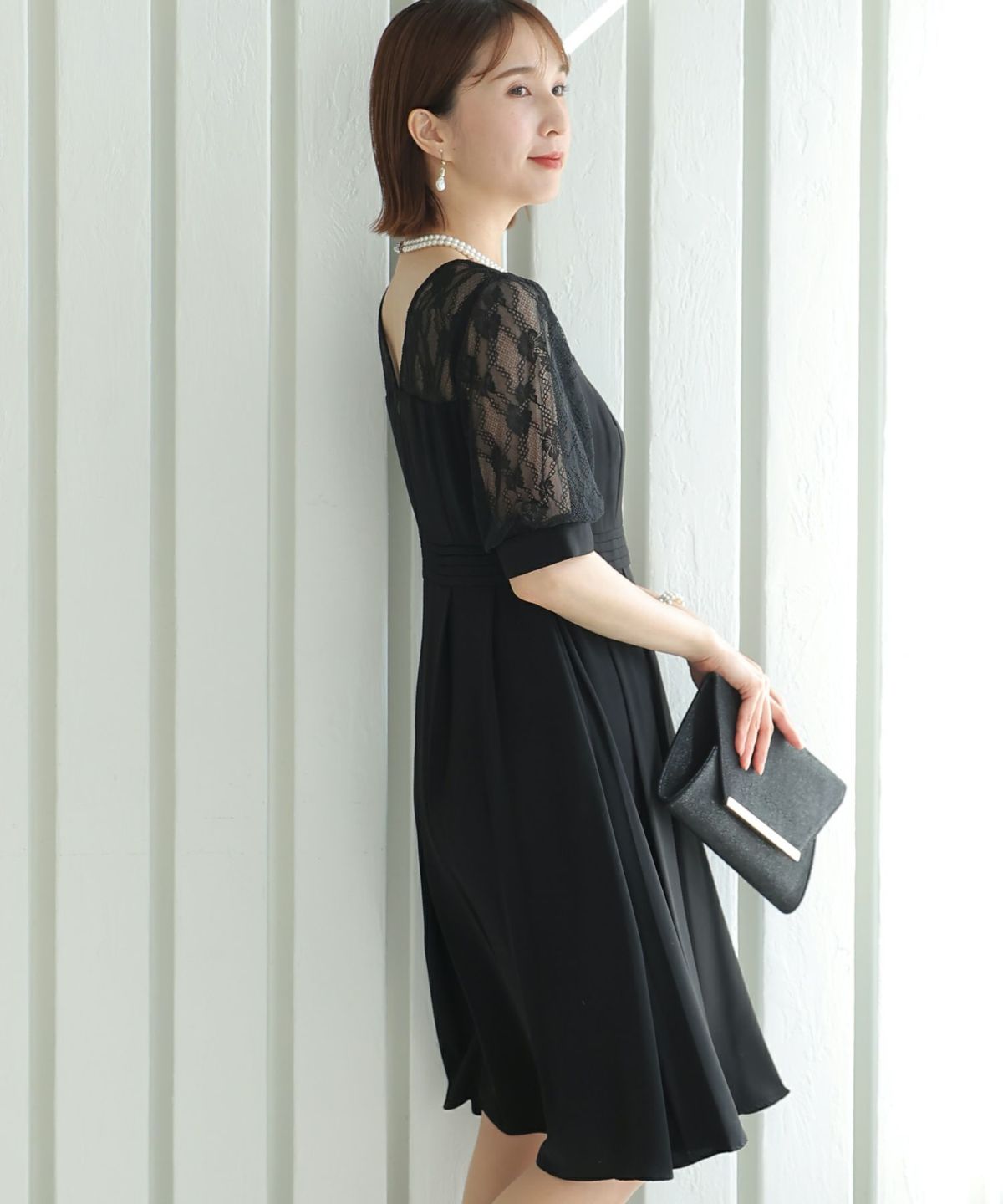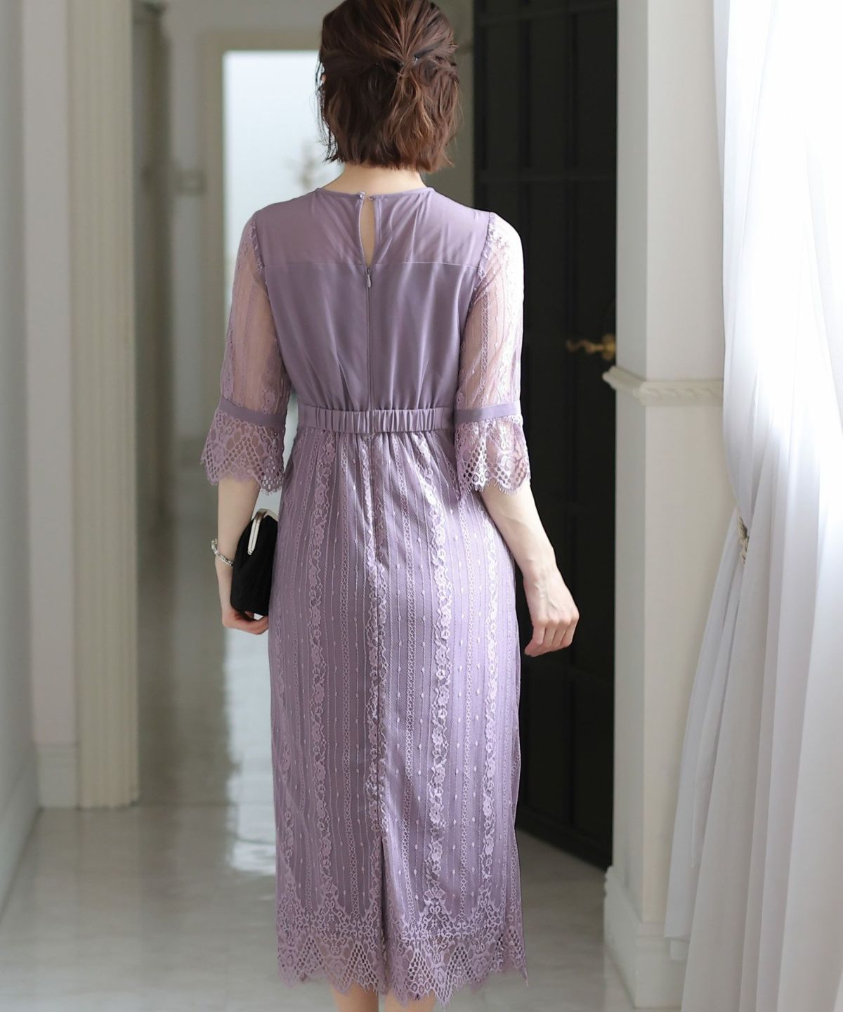 デコルテからスリーブにかけての透け感が上品で大人っぽい印象に フレア袖レースタイトワンピース