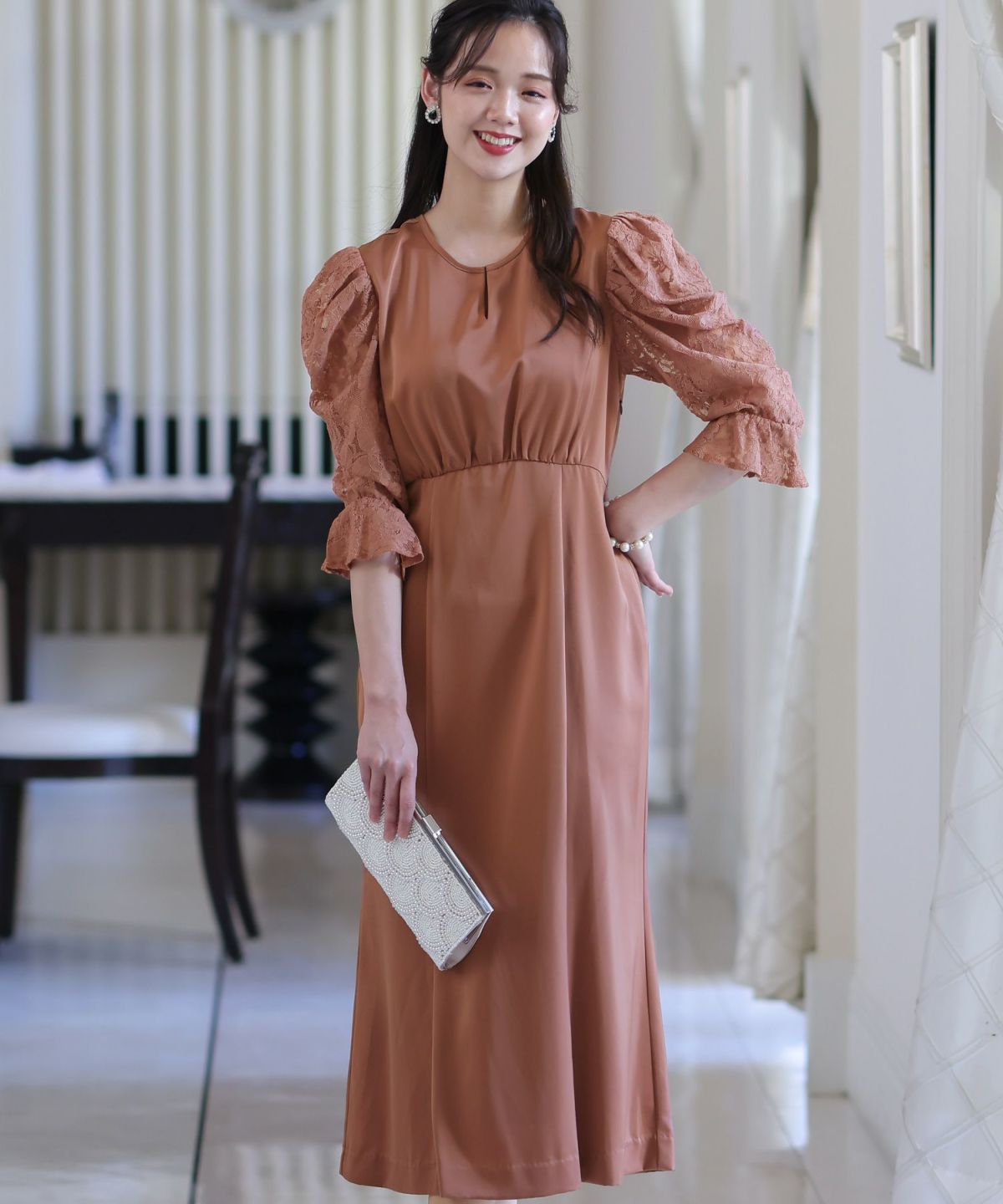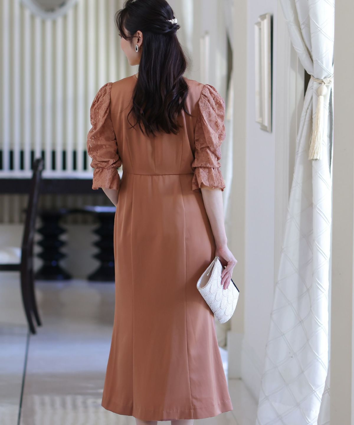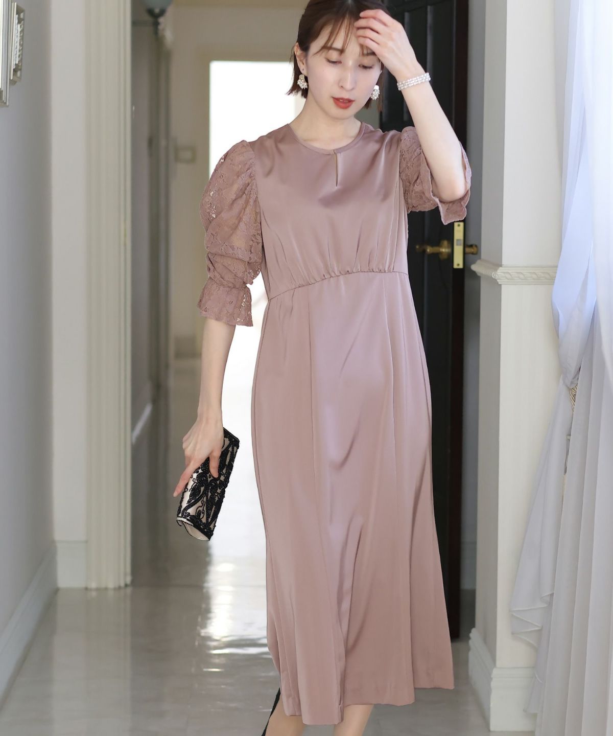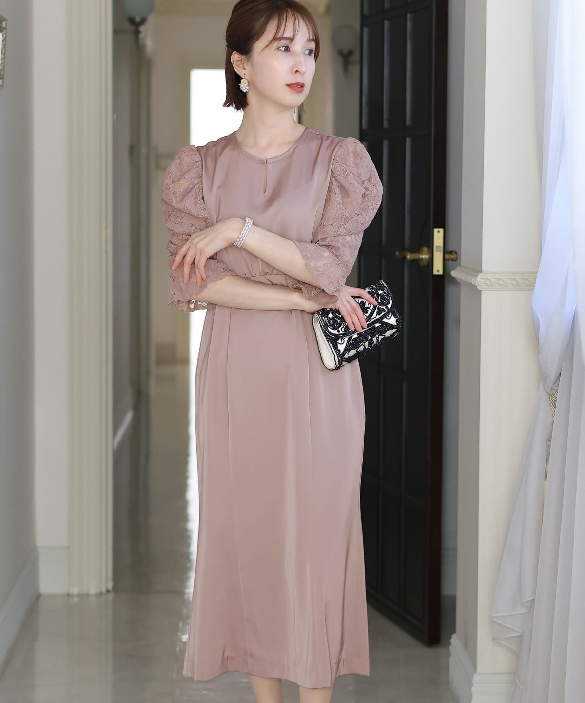 マーメイドラインのスカートで女性らしさをプラス ヴィンテージサテン×レーススリーブワンピース