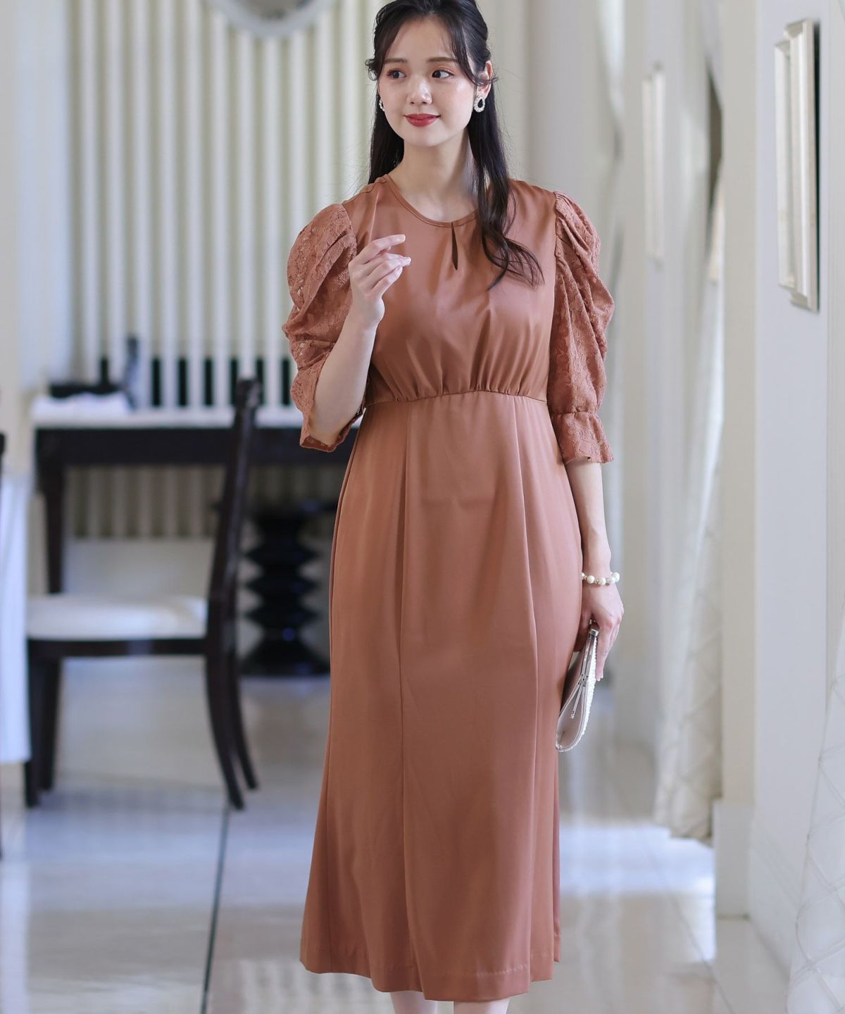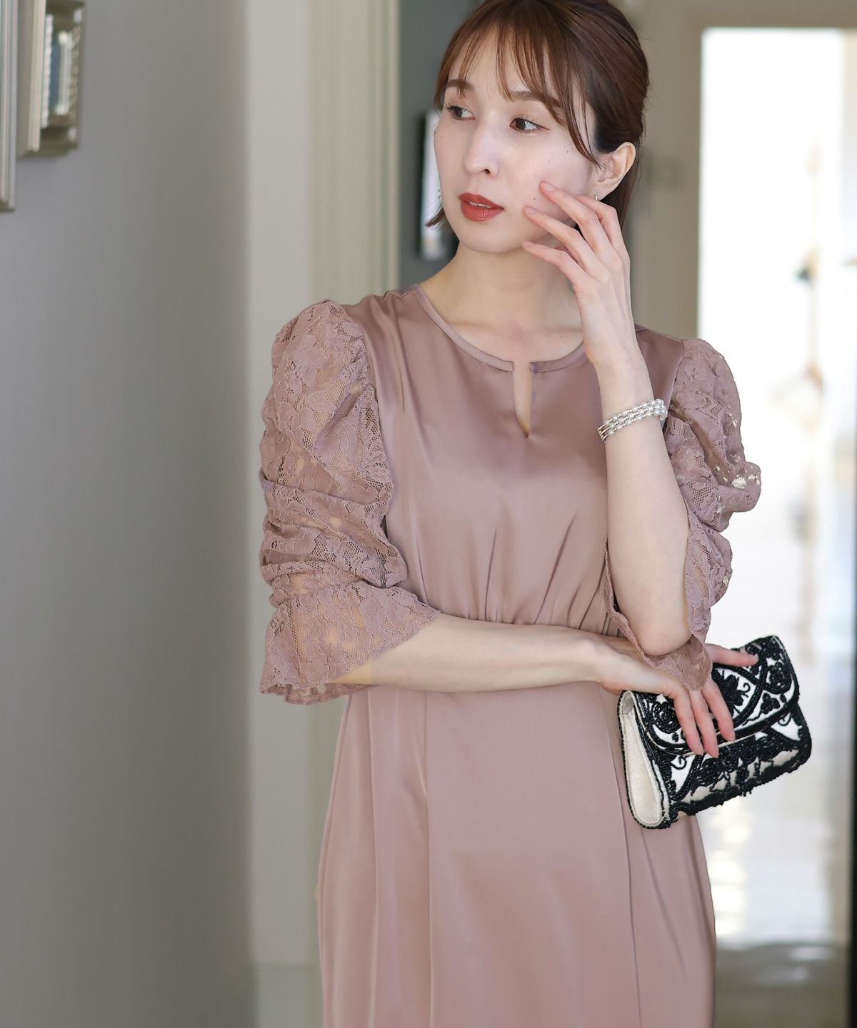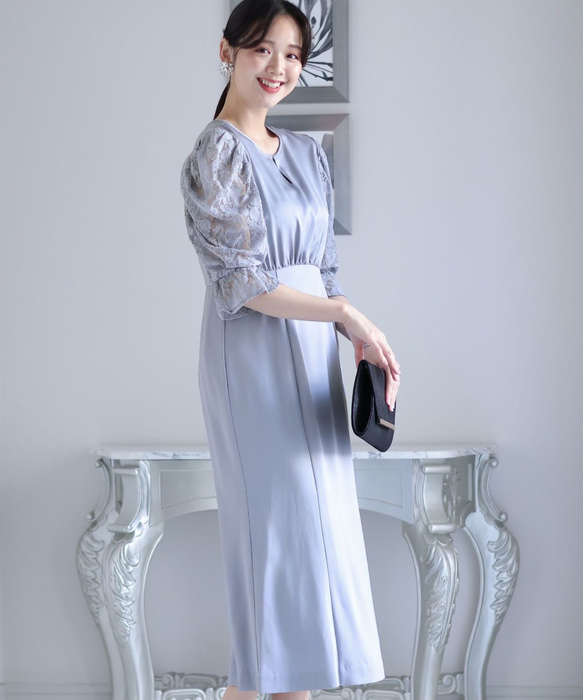 マーメイドラインのスカートで女性らしさをプラス ヴィンテージサテン×レーススリーブワンピース