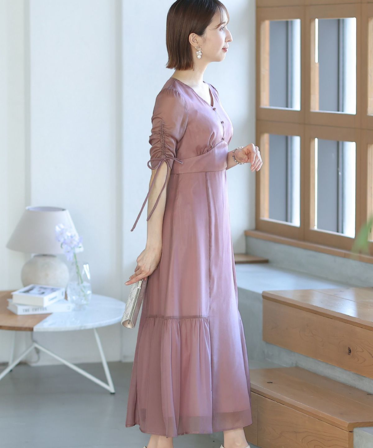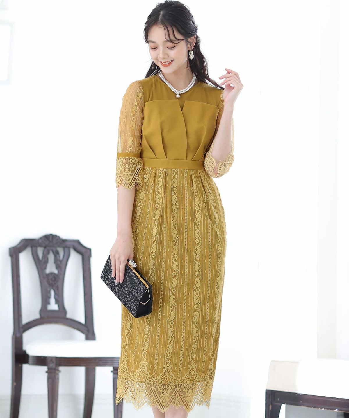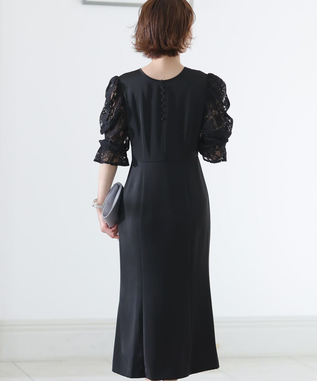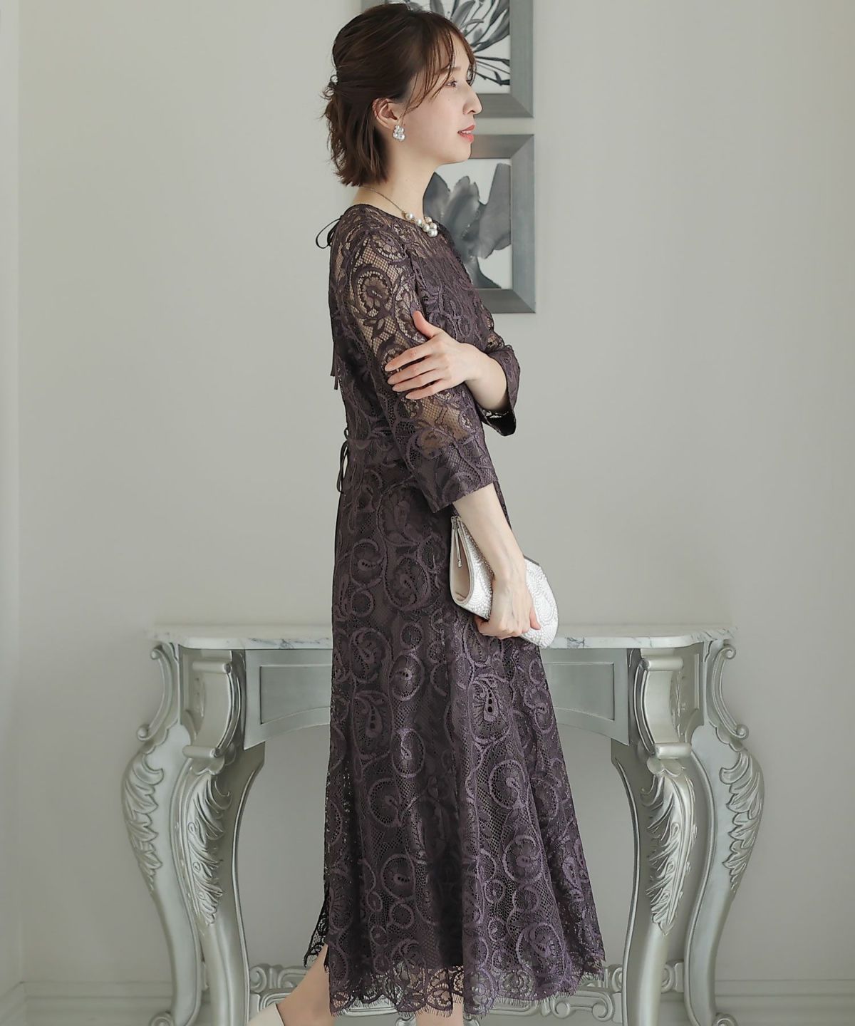 マーメイドラインのスカートで女性らしさをプラス ヴィンテージサテン×レーススリーブワンピース