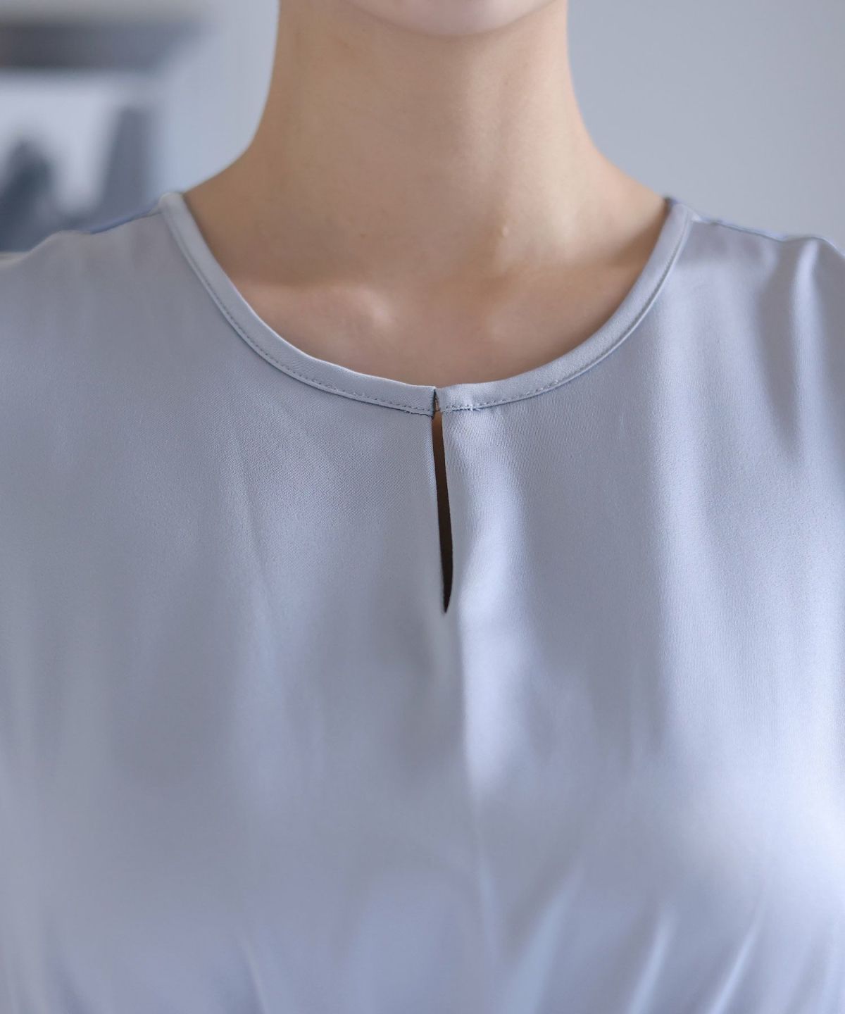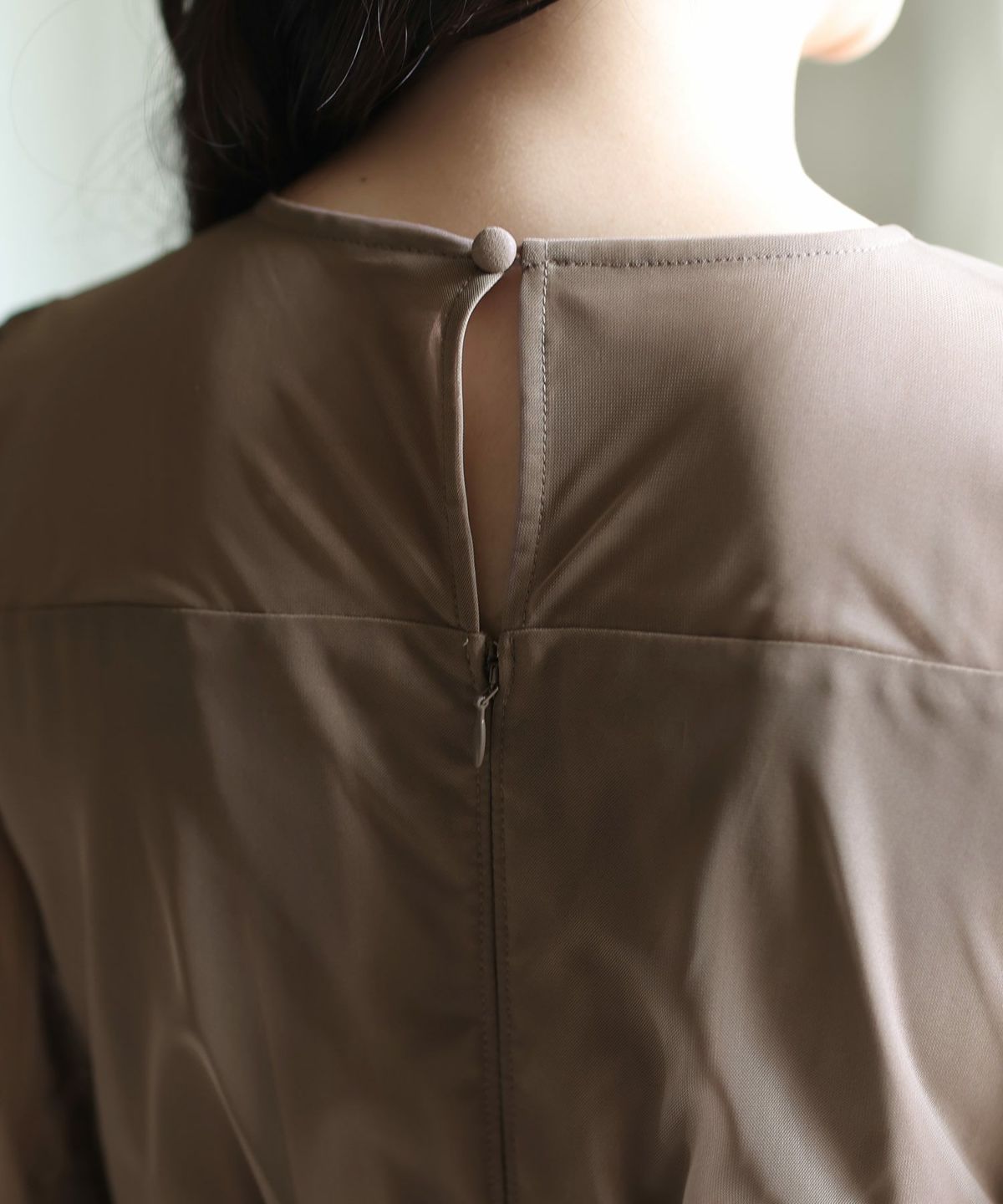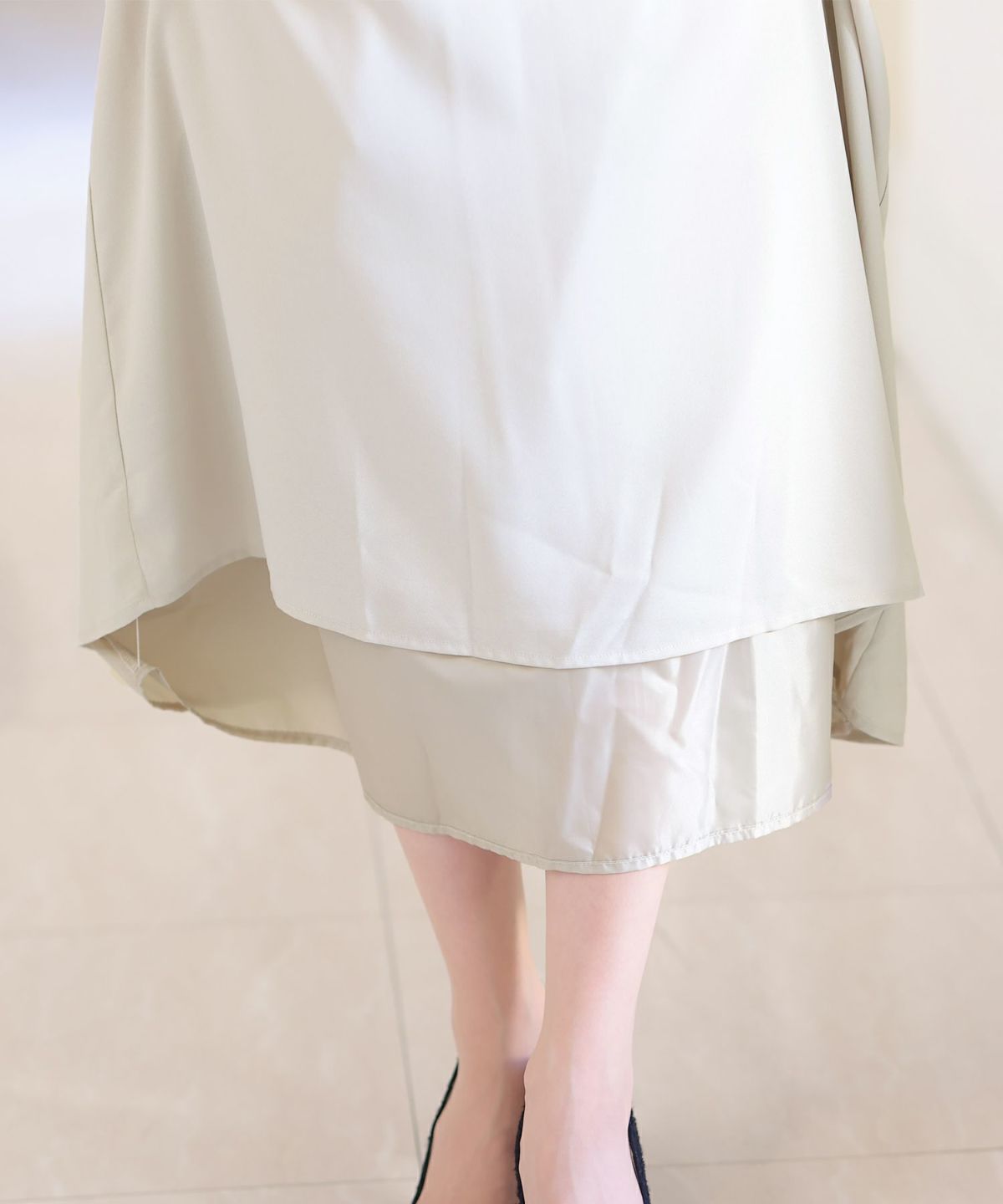 光沢感がある生地を使用した上品な印象のワンピース ウエストシャーリングイレギュラーヘムシアーワンピース