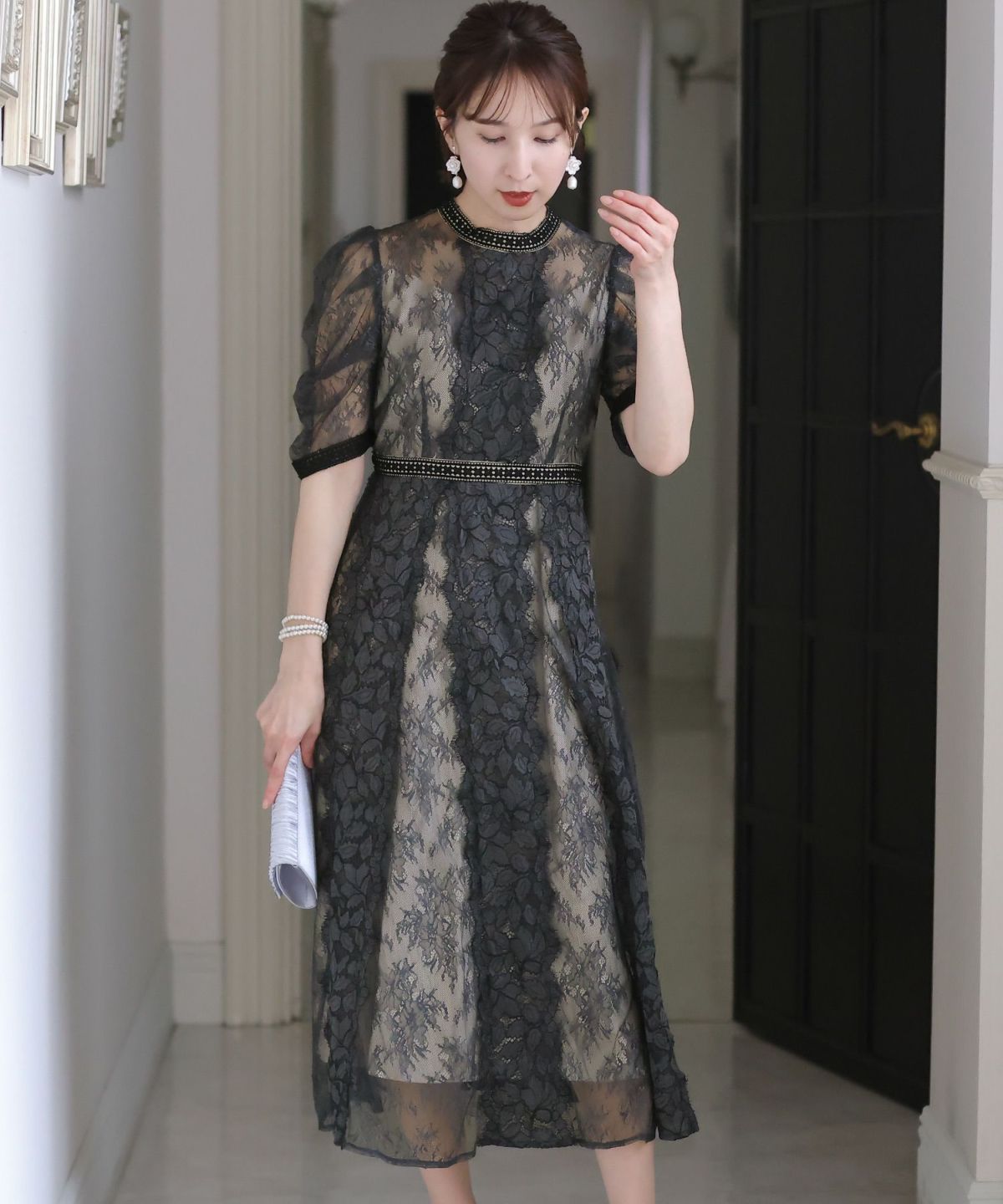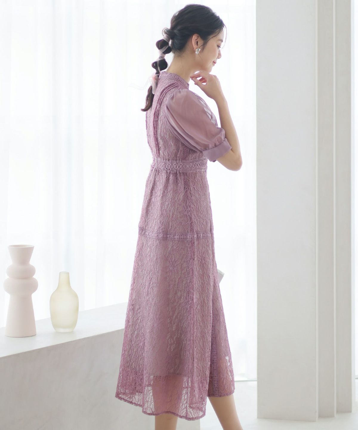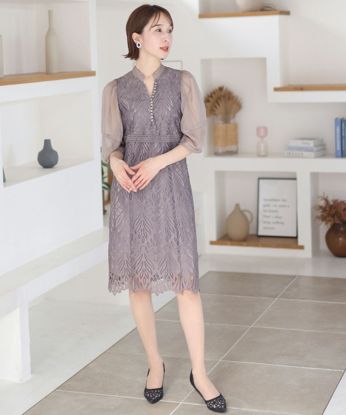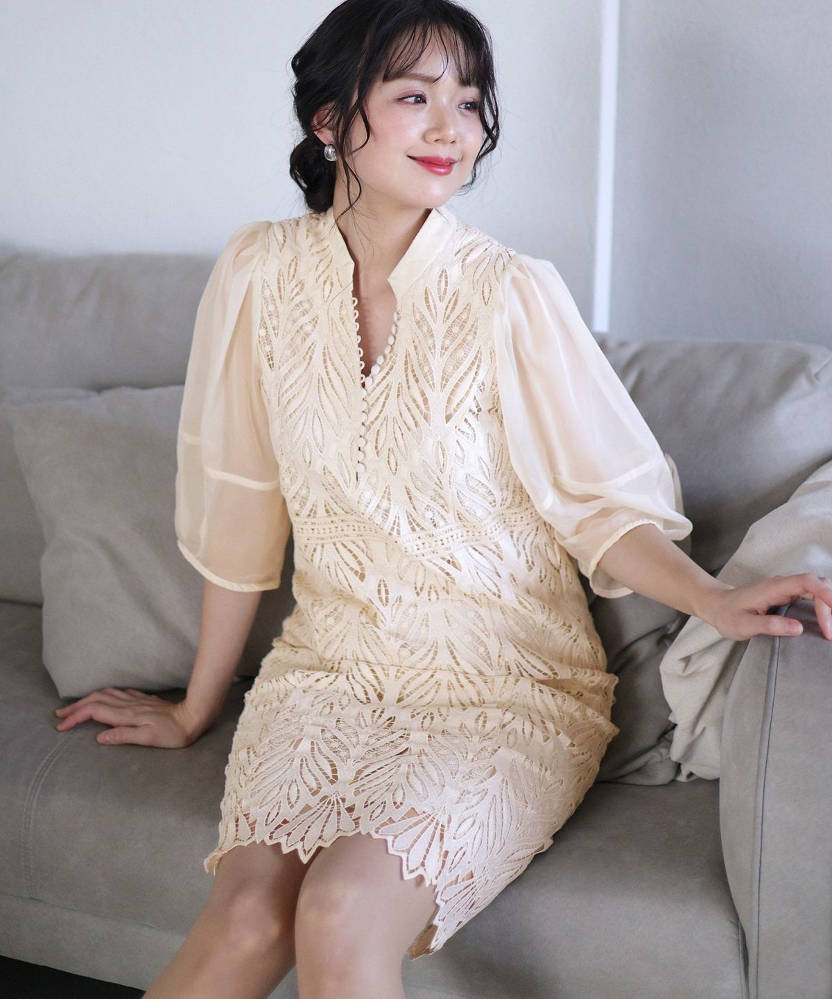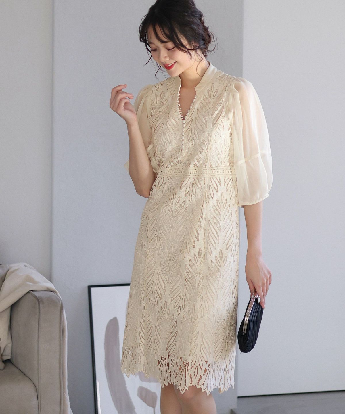 繊細な総レースが華やか ボリュームスリーブ総レースワンピース