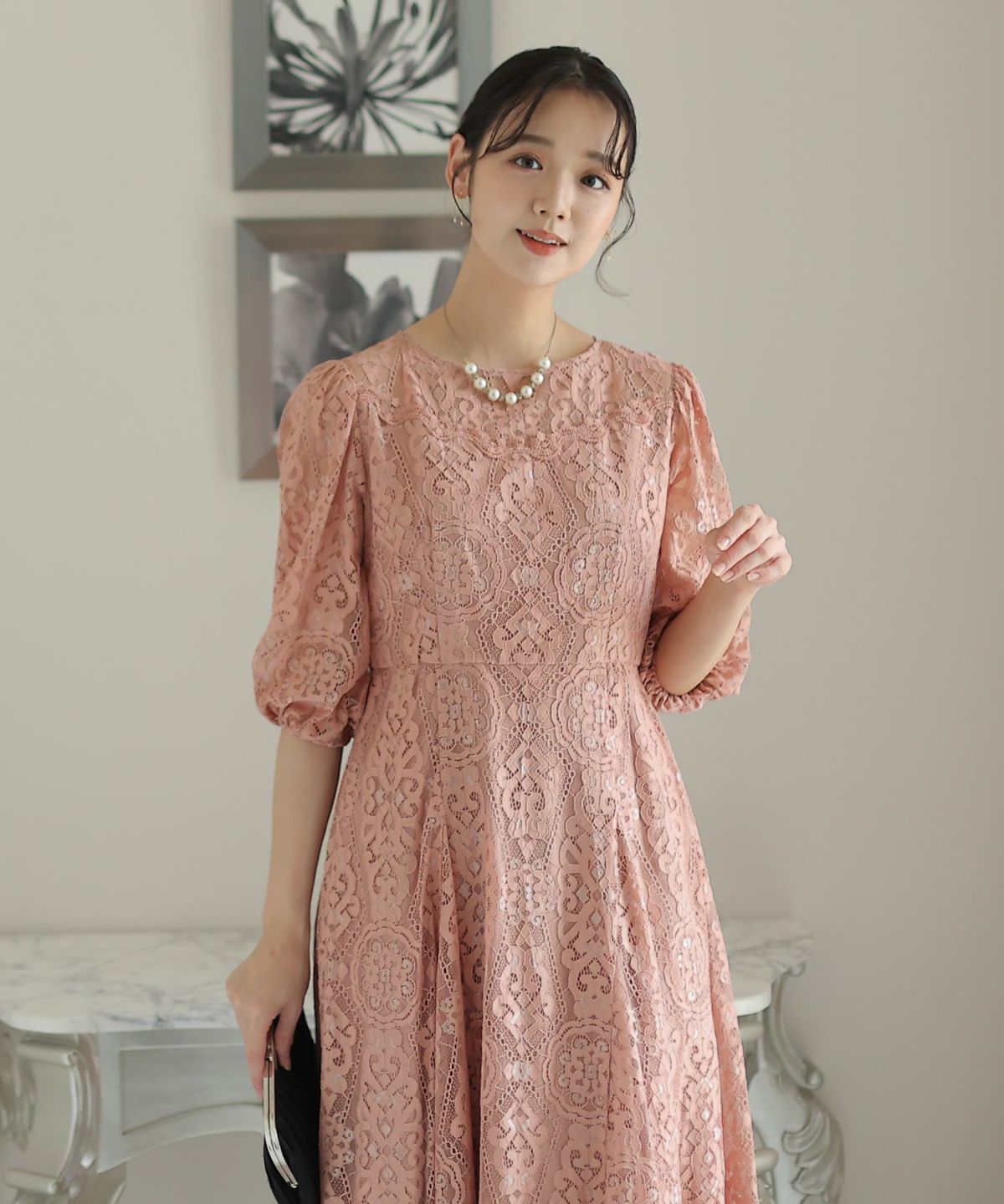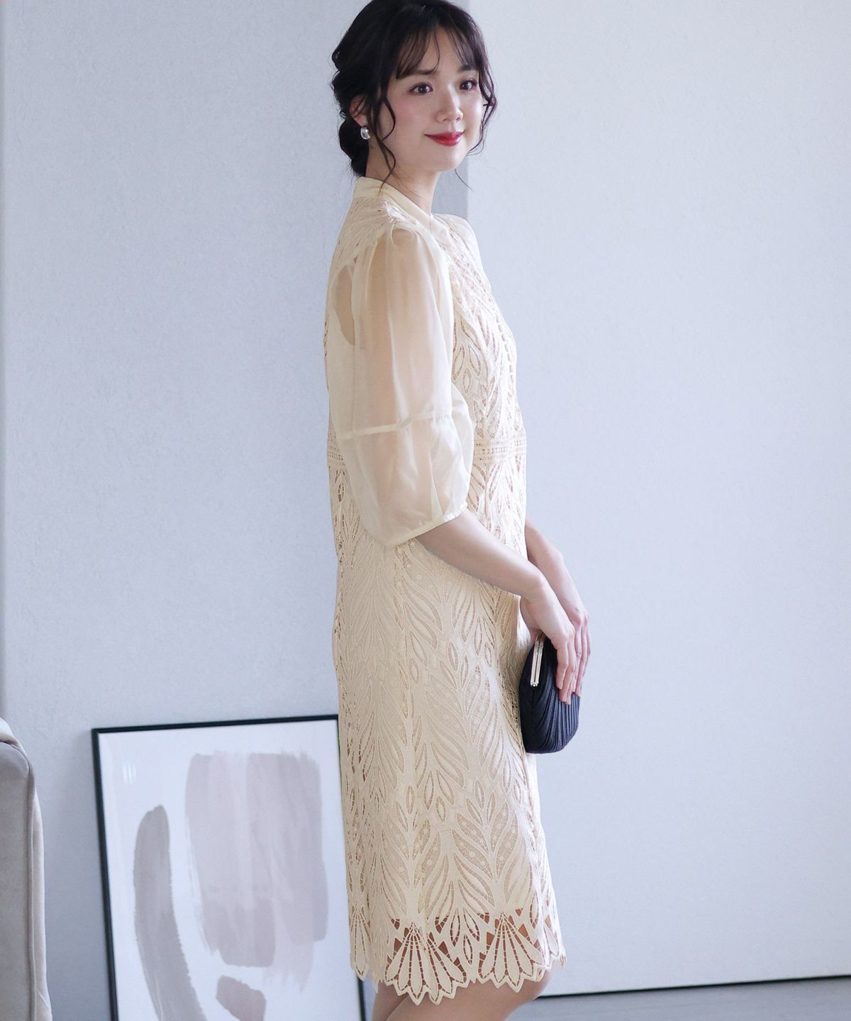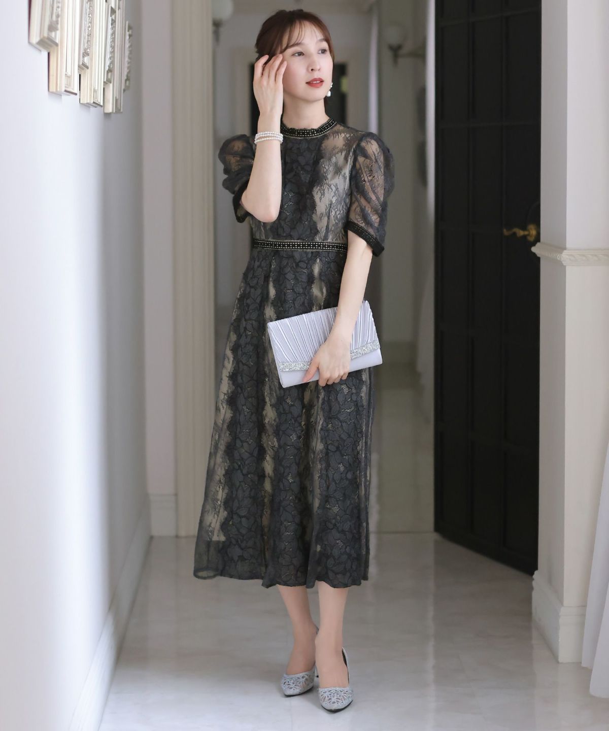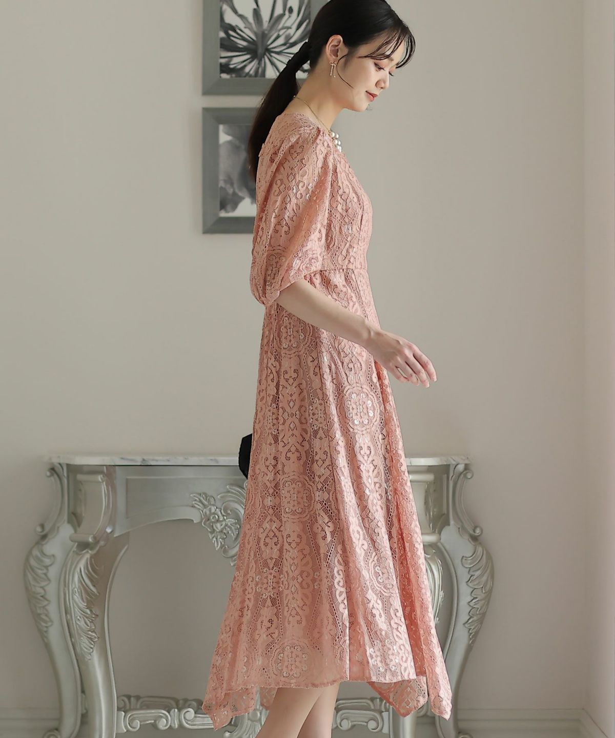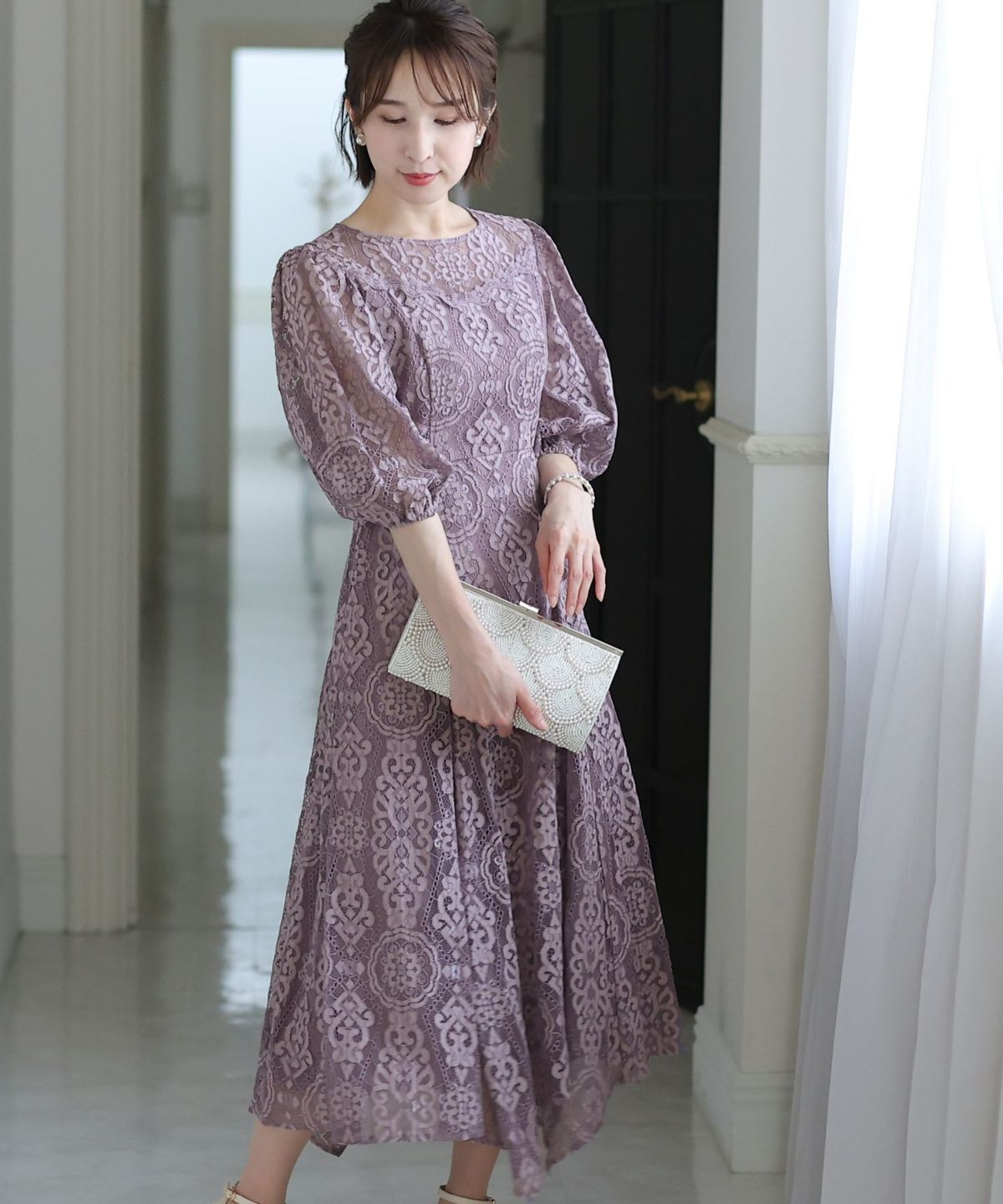 繊細な総レースが華やか ボリュームスリーブ総レースワンピース