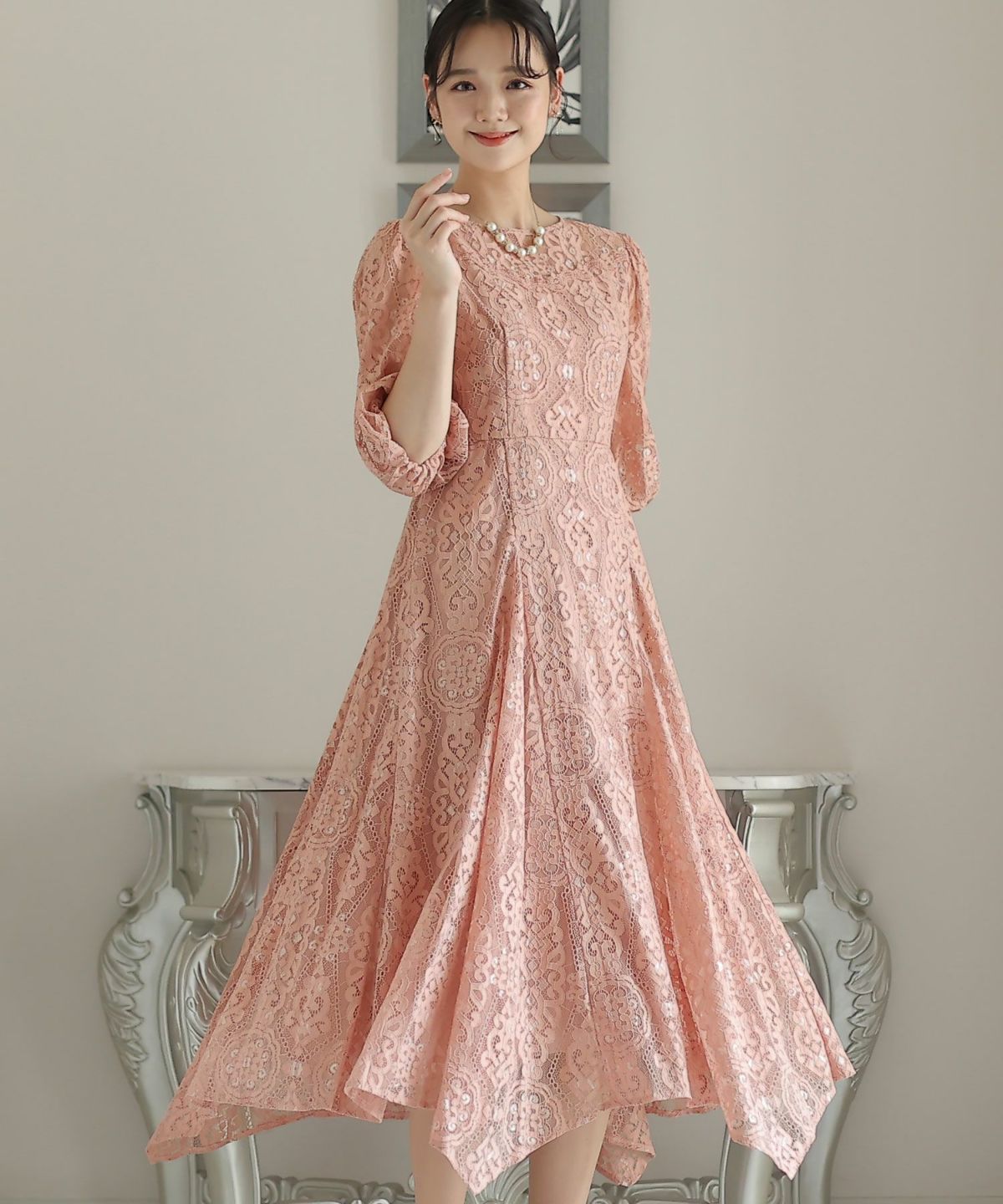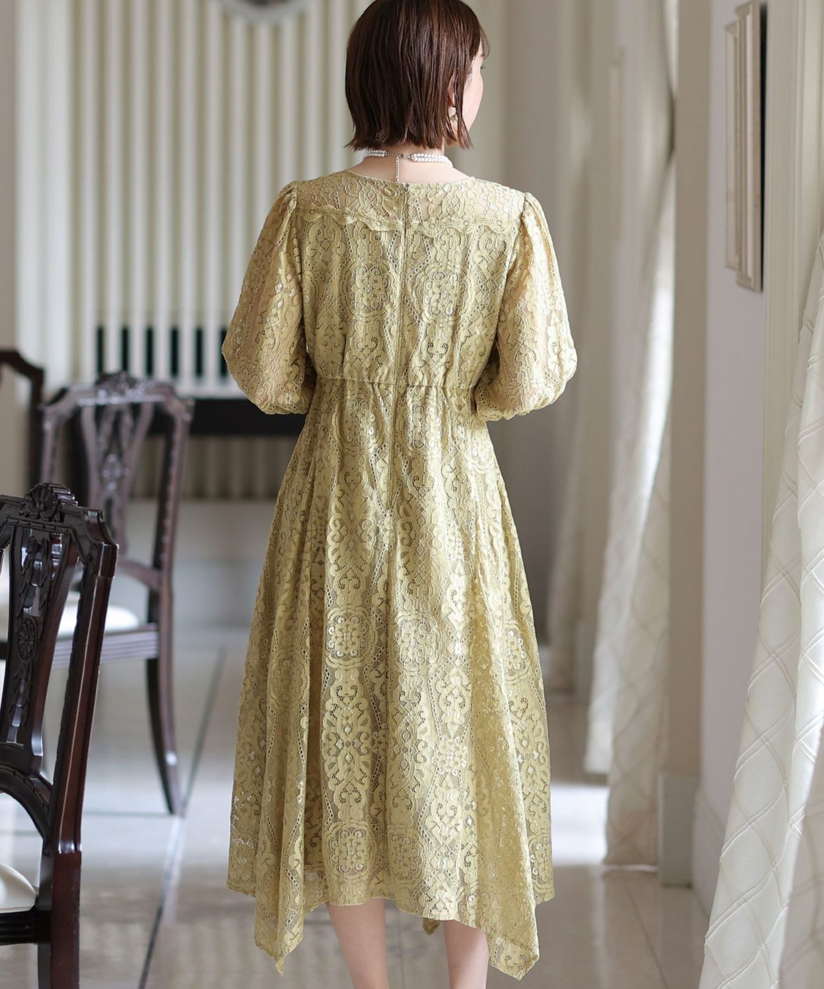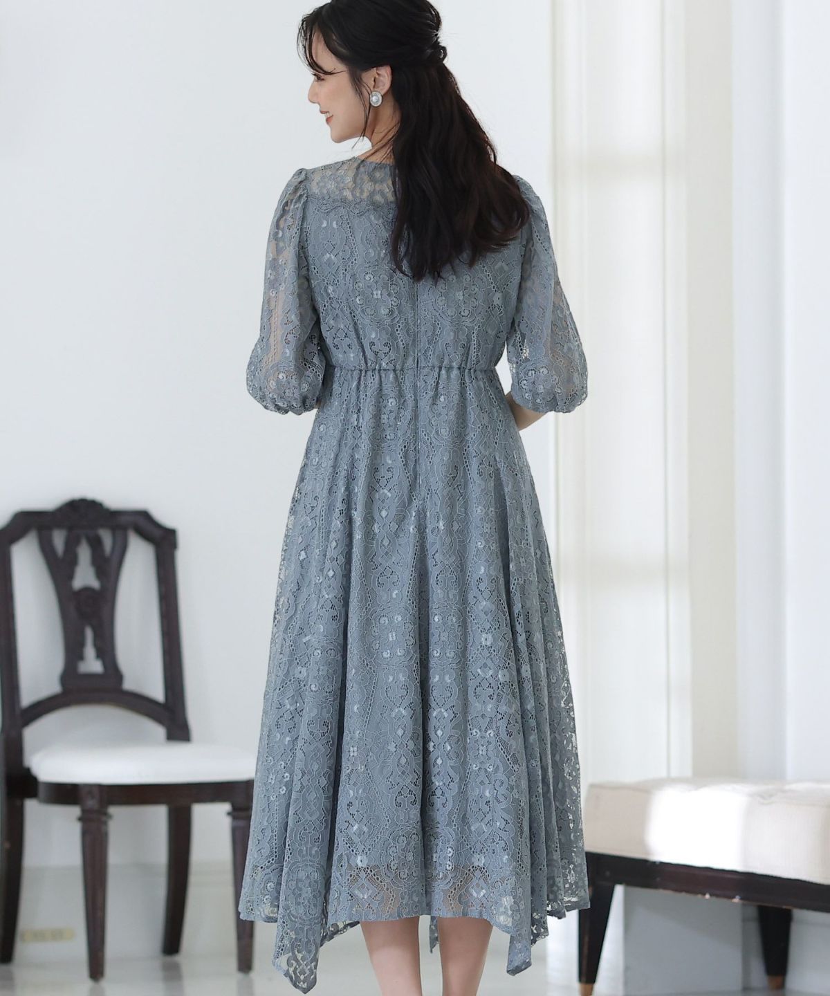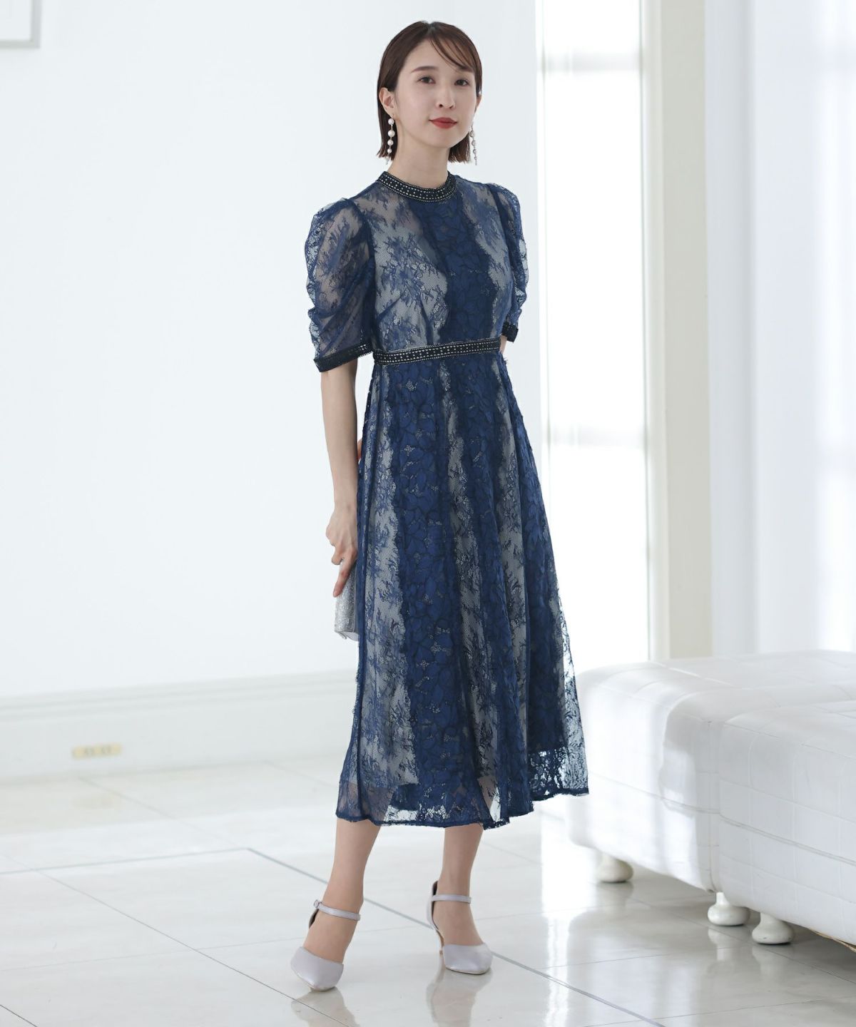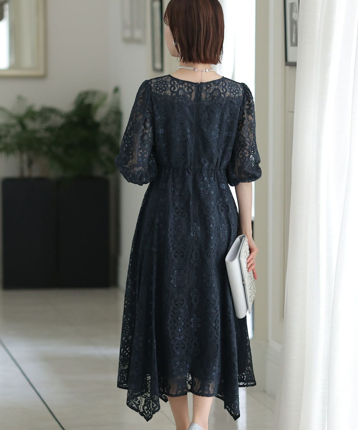 繊細な総レースが華やか ボリュームスリーブ総レースワンピース