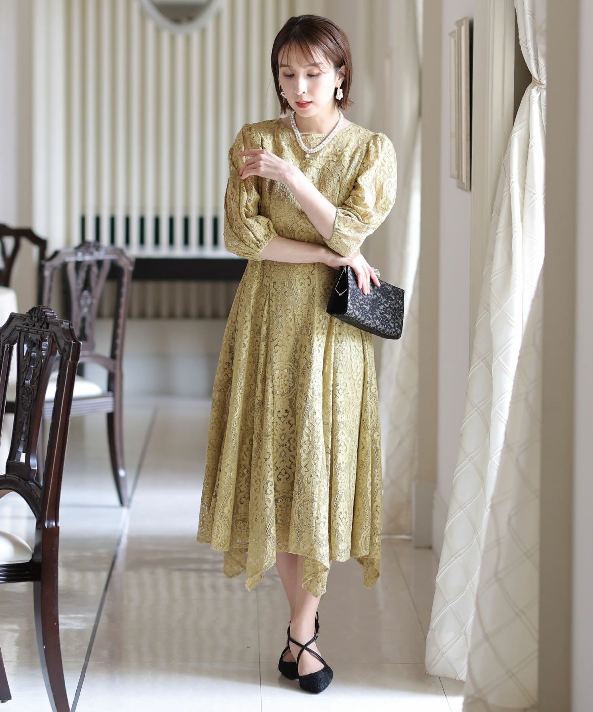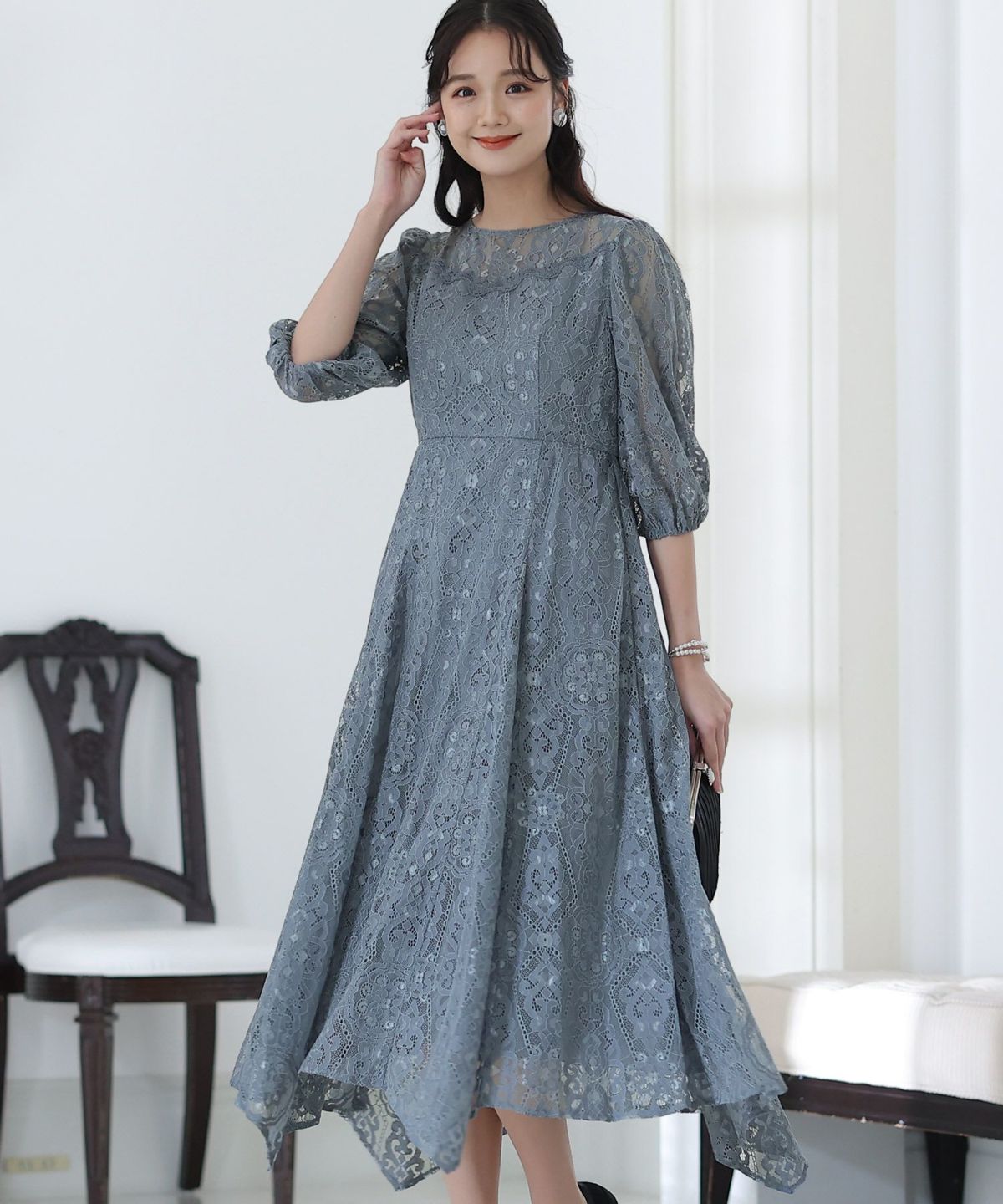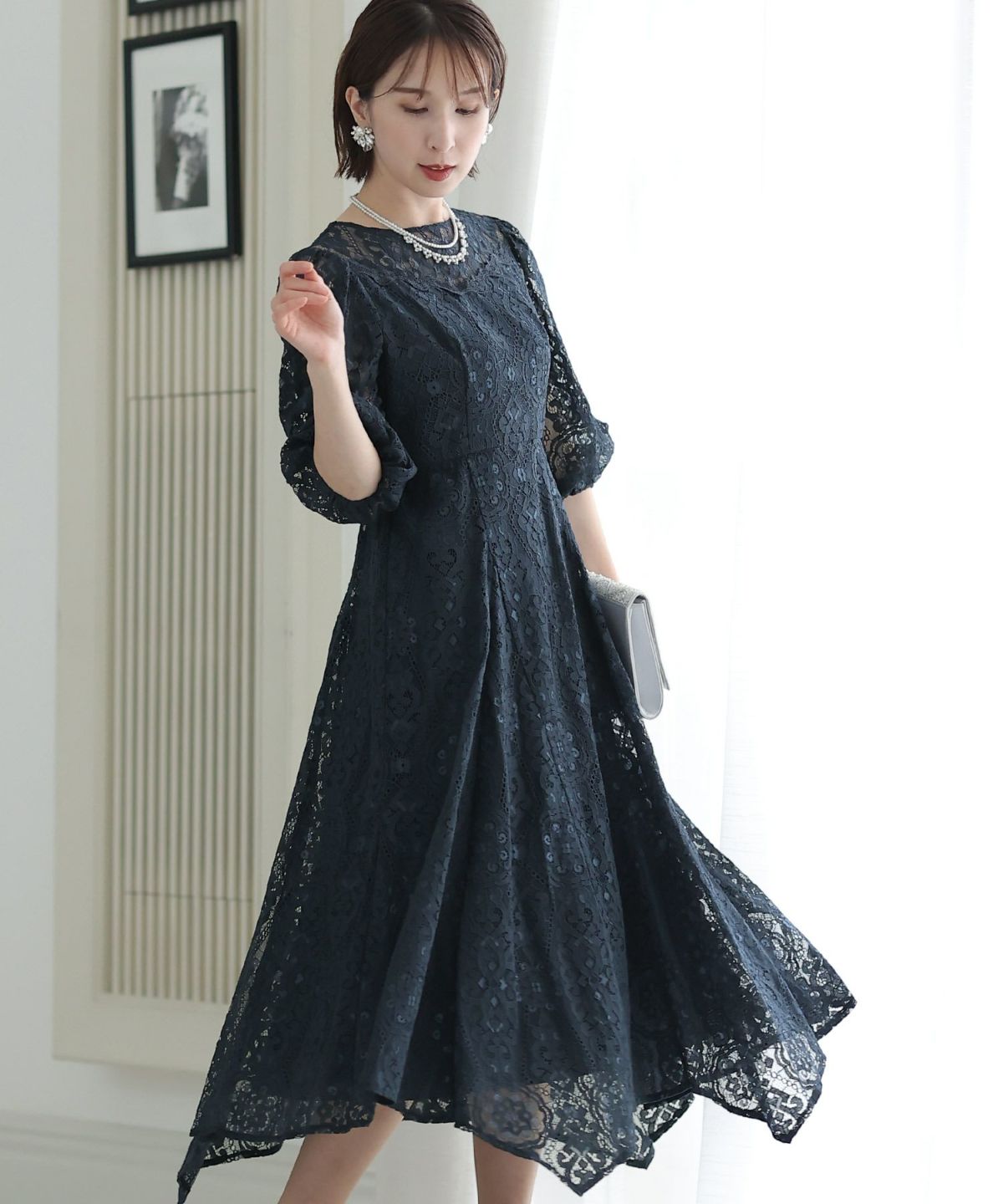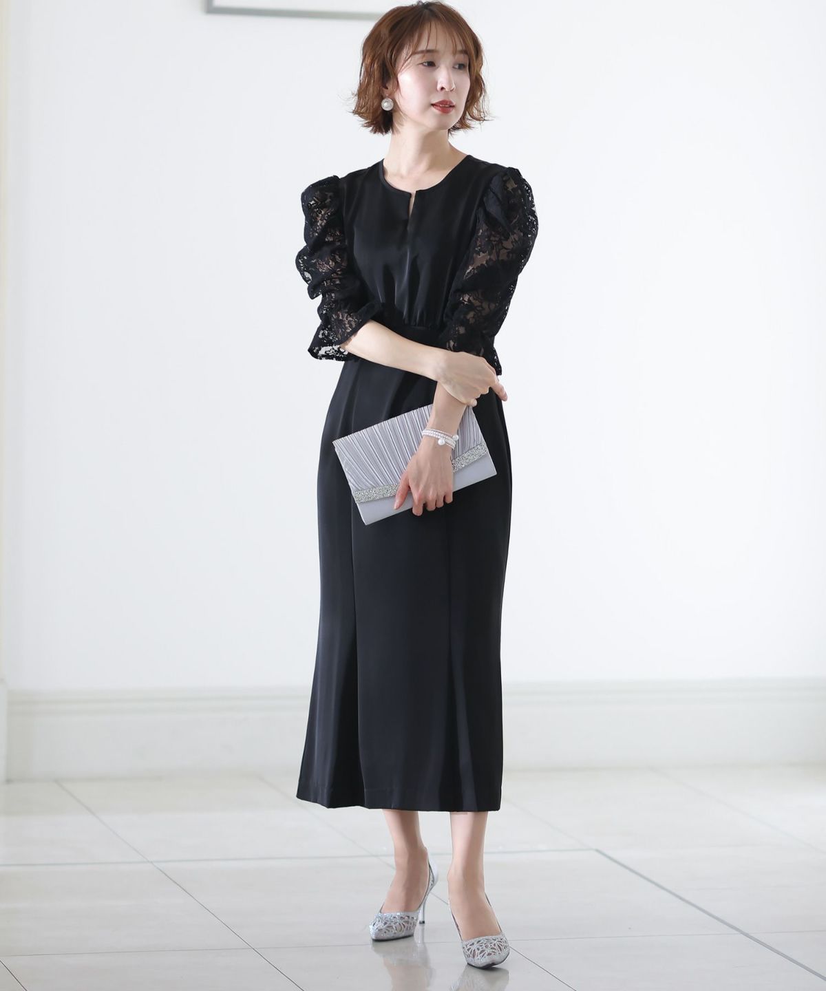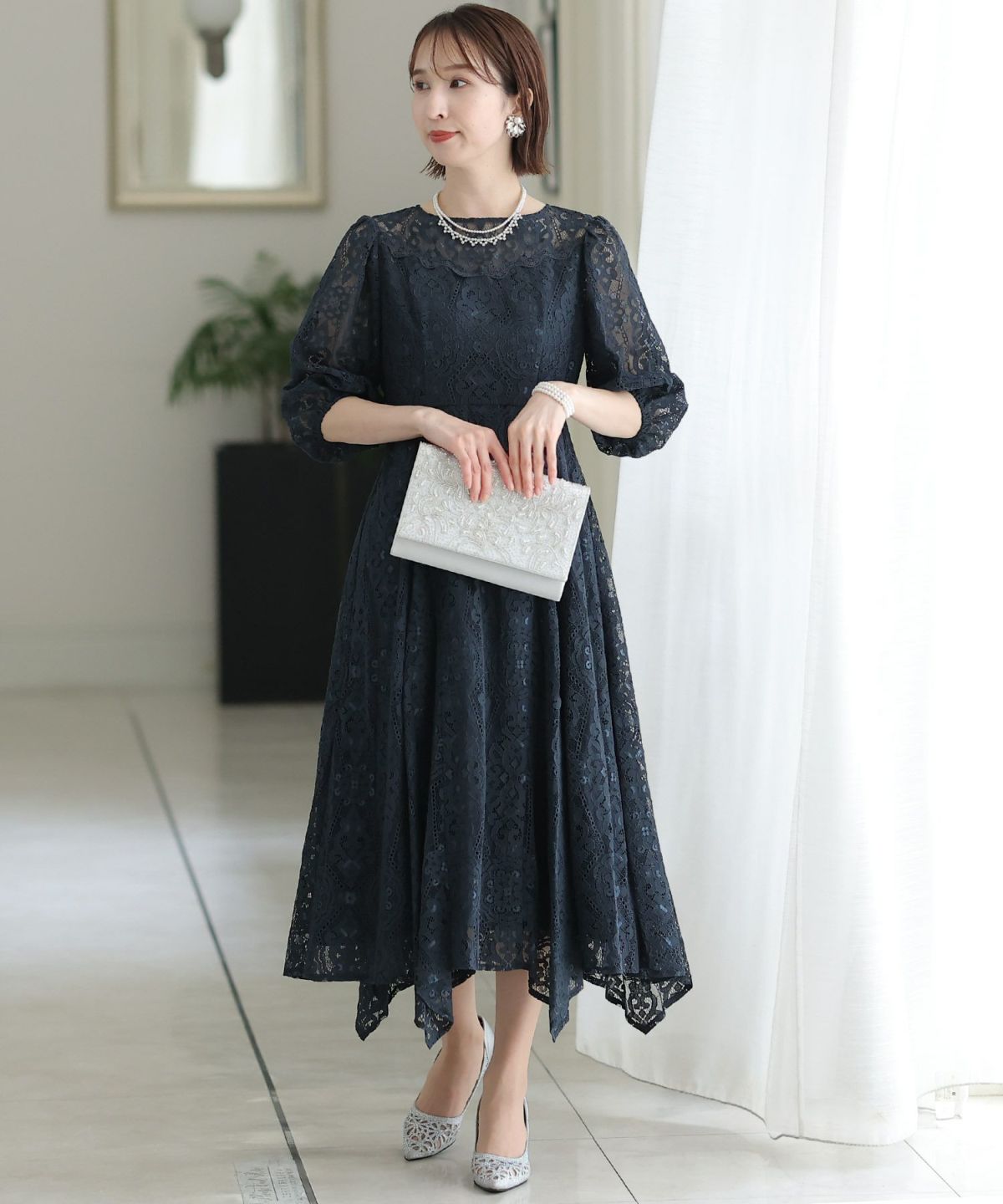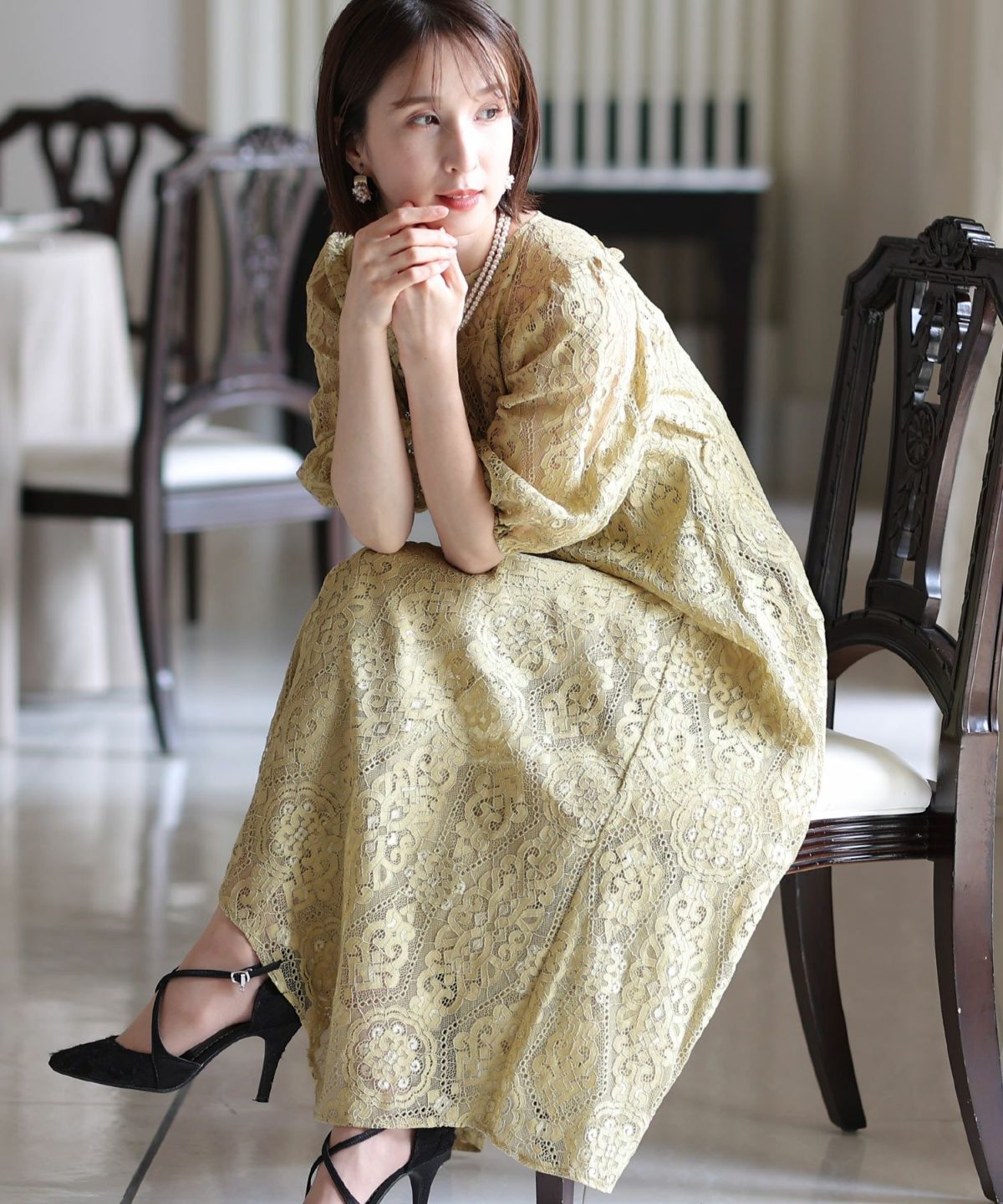 繊細な総レースが華やか ボリュームスリーブ総レースワンピース