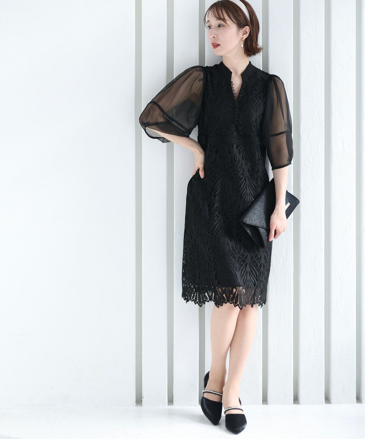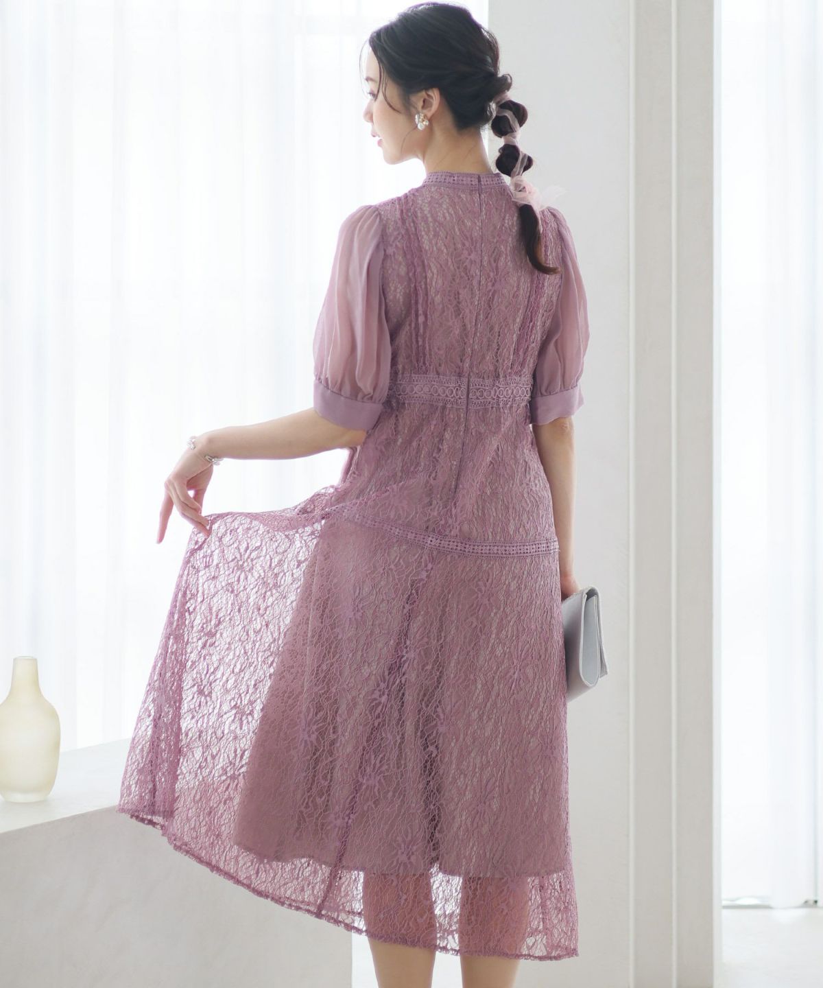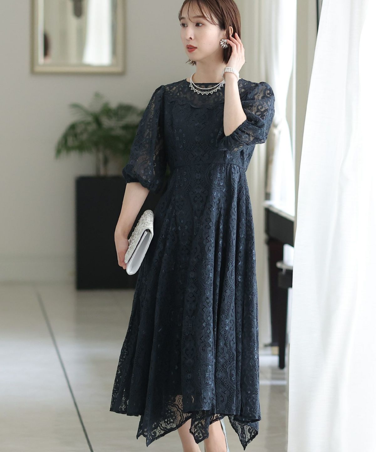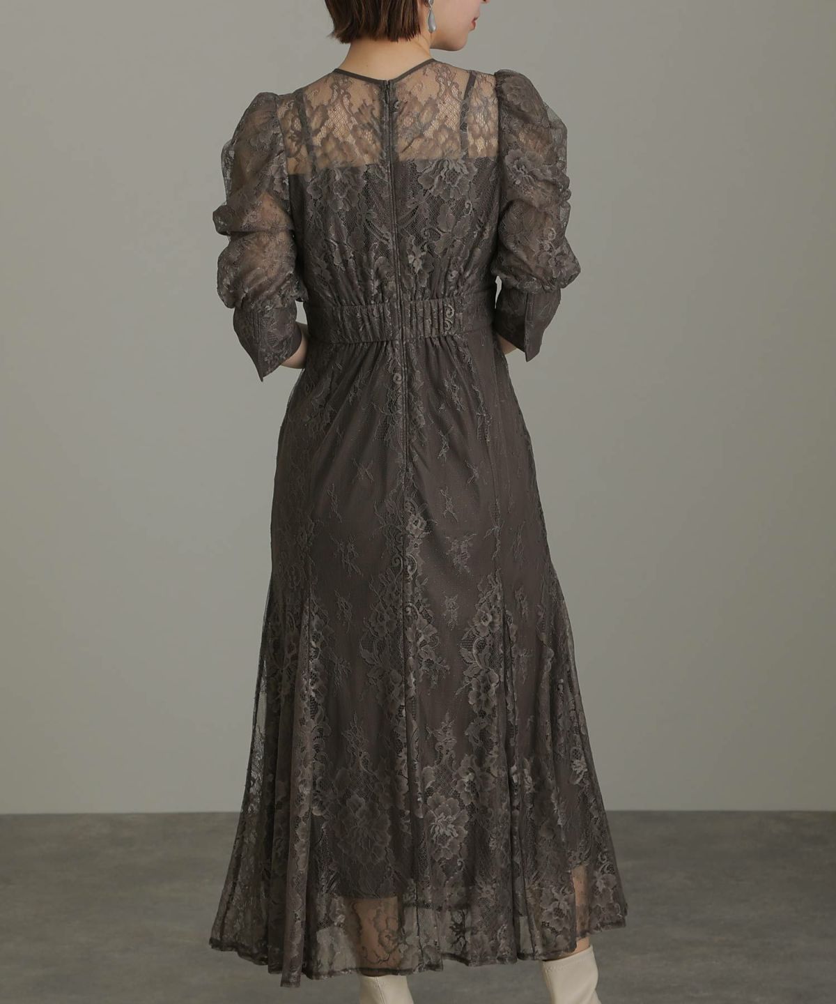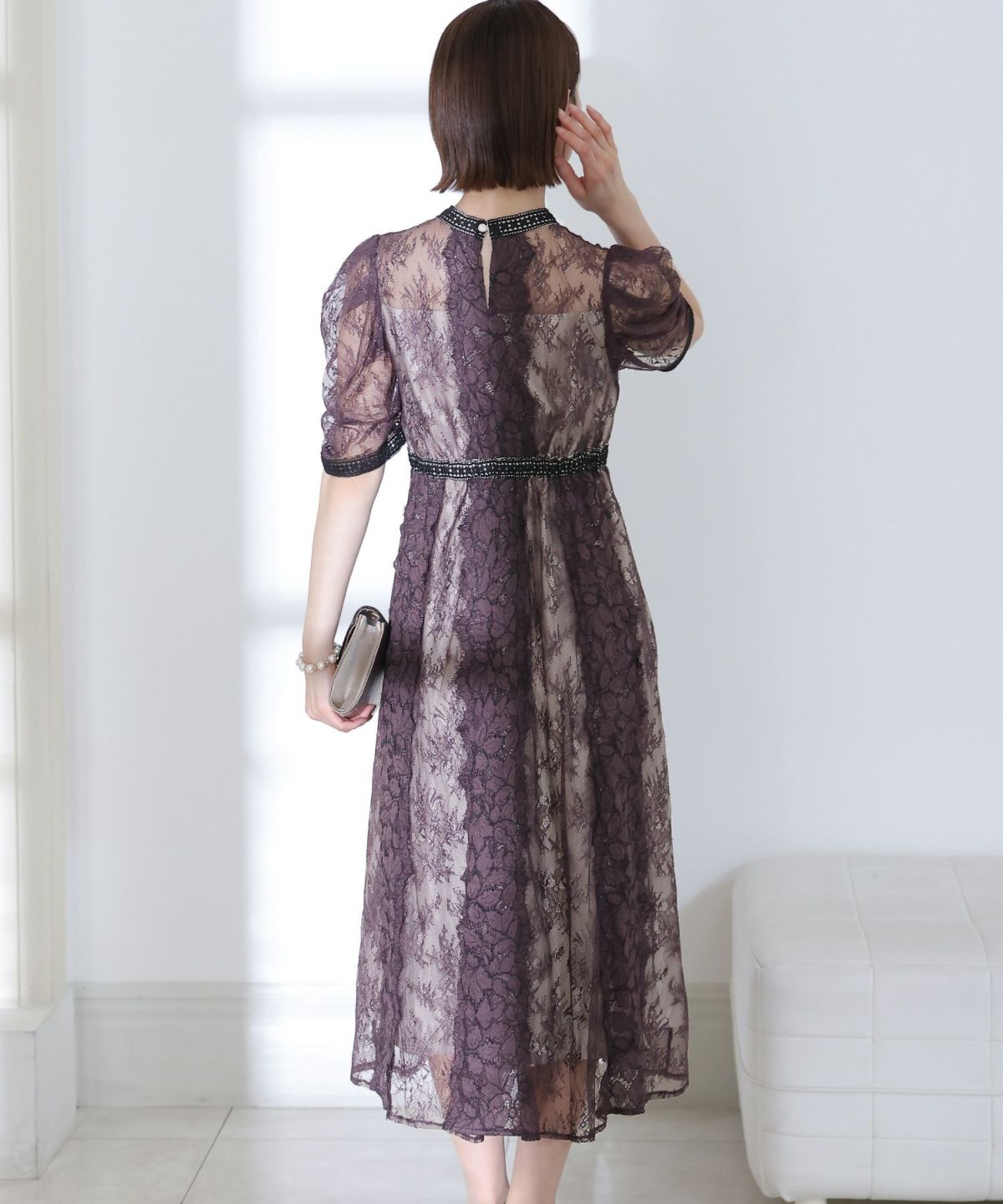 繊細な総レースが華やか ボリュームスリーブ総レースワンピース