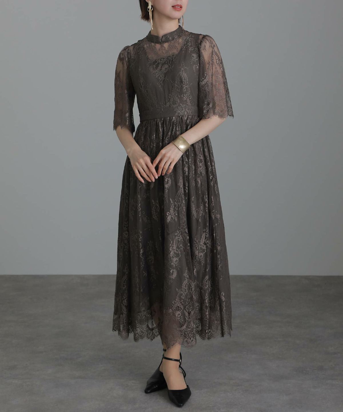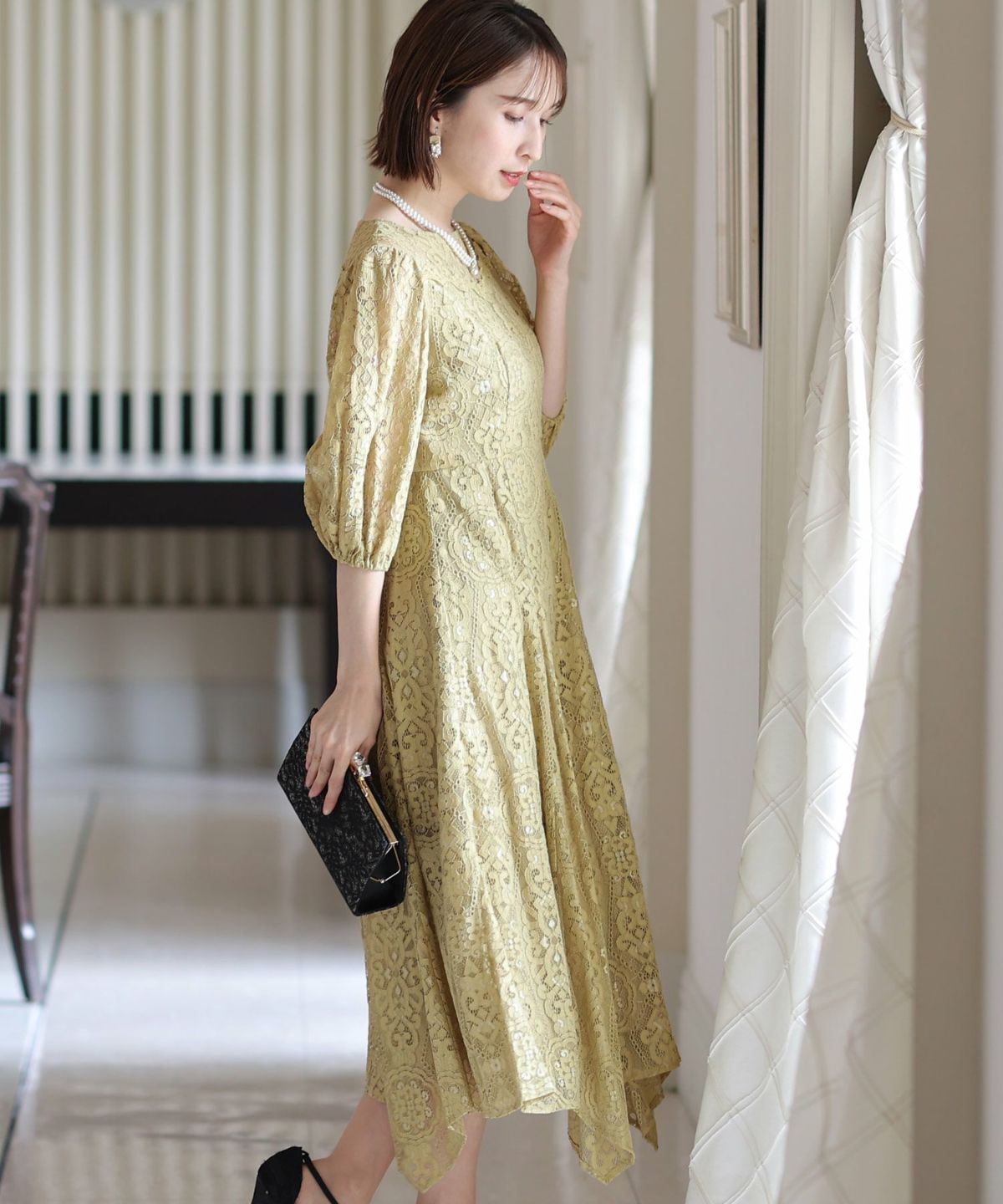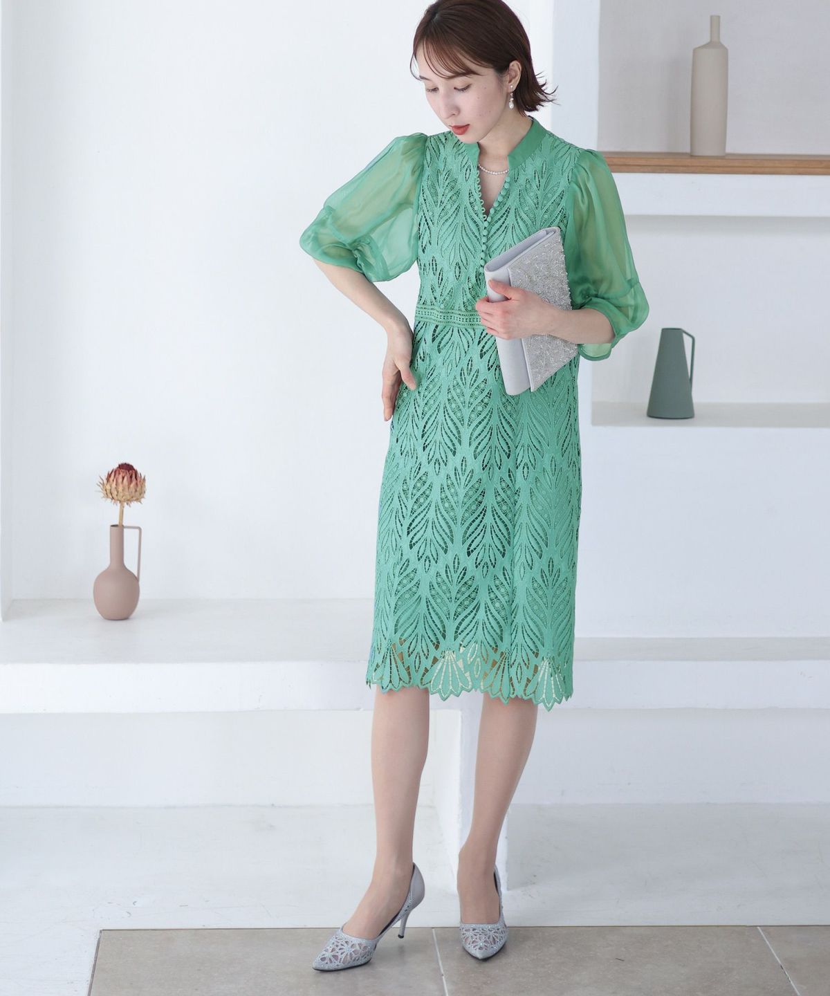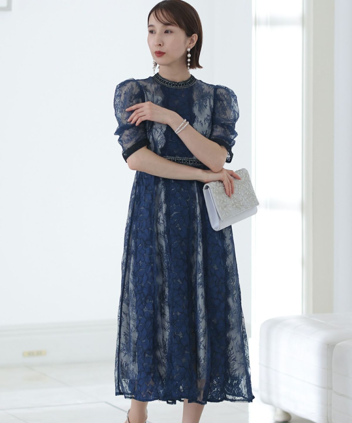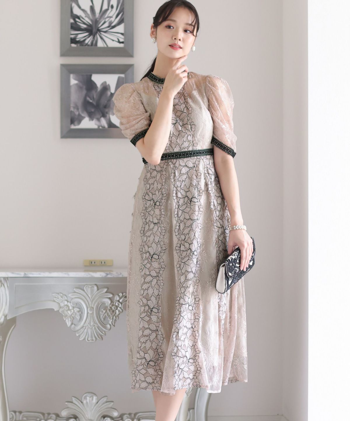 繊細な総レースが華やか ボリュームスリーブ総レースワンピース
