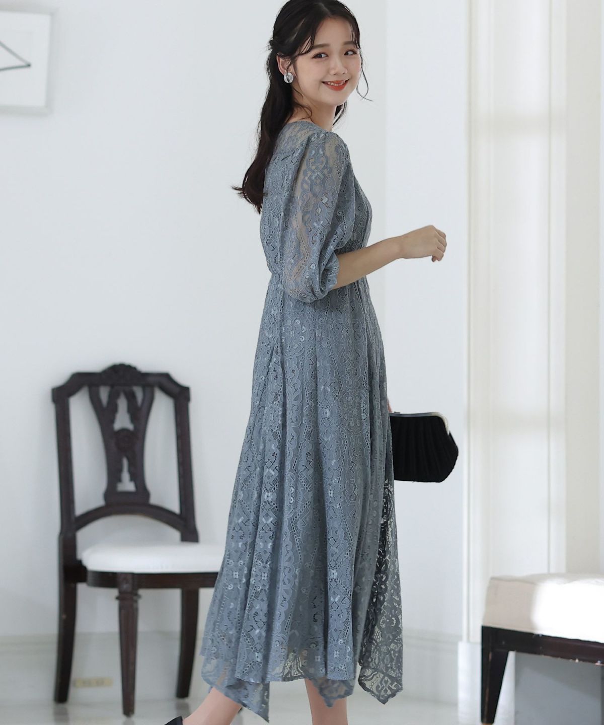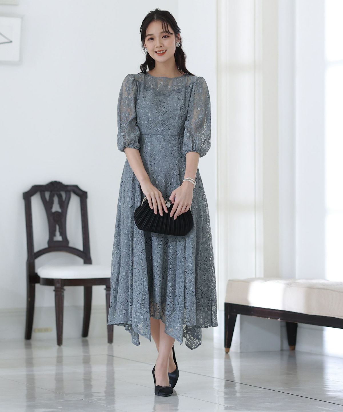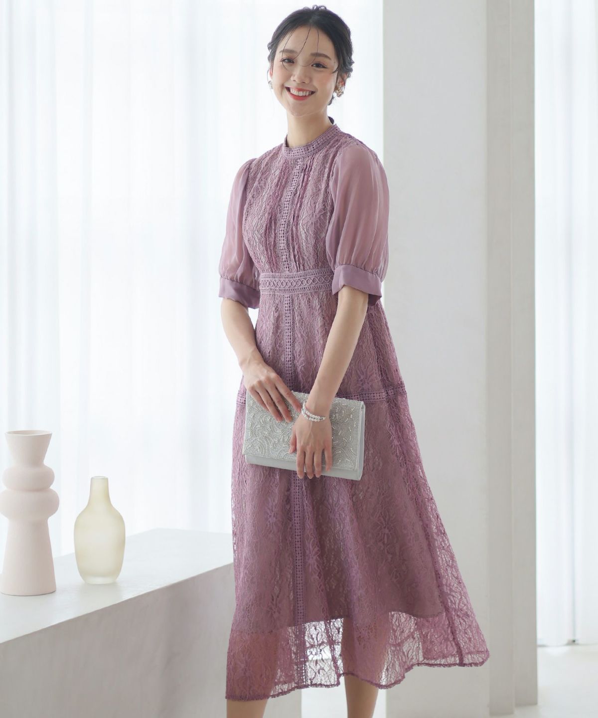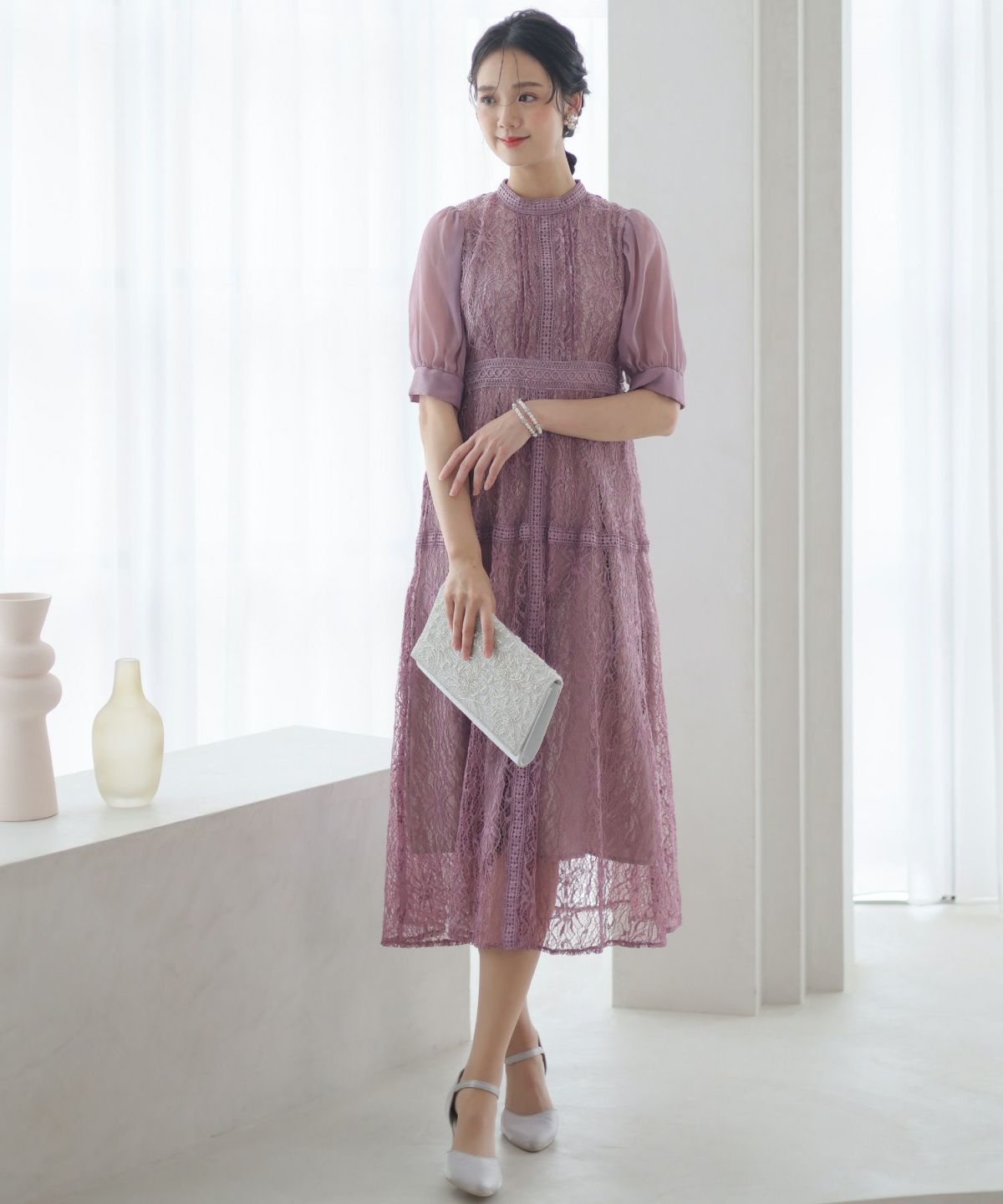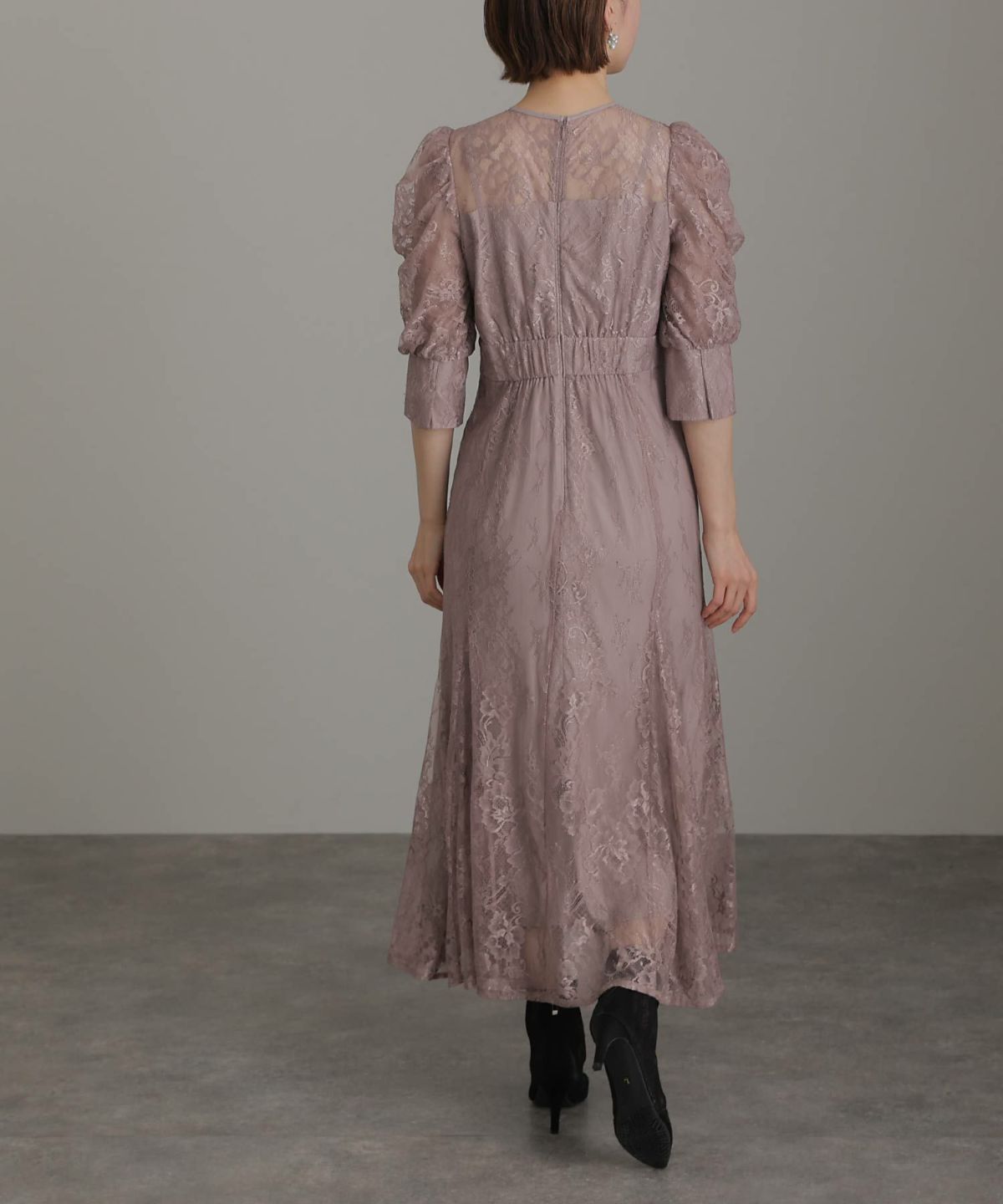 繊細な総レースが華やか ボリュームスリーブ総レースワンピース
