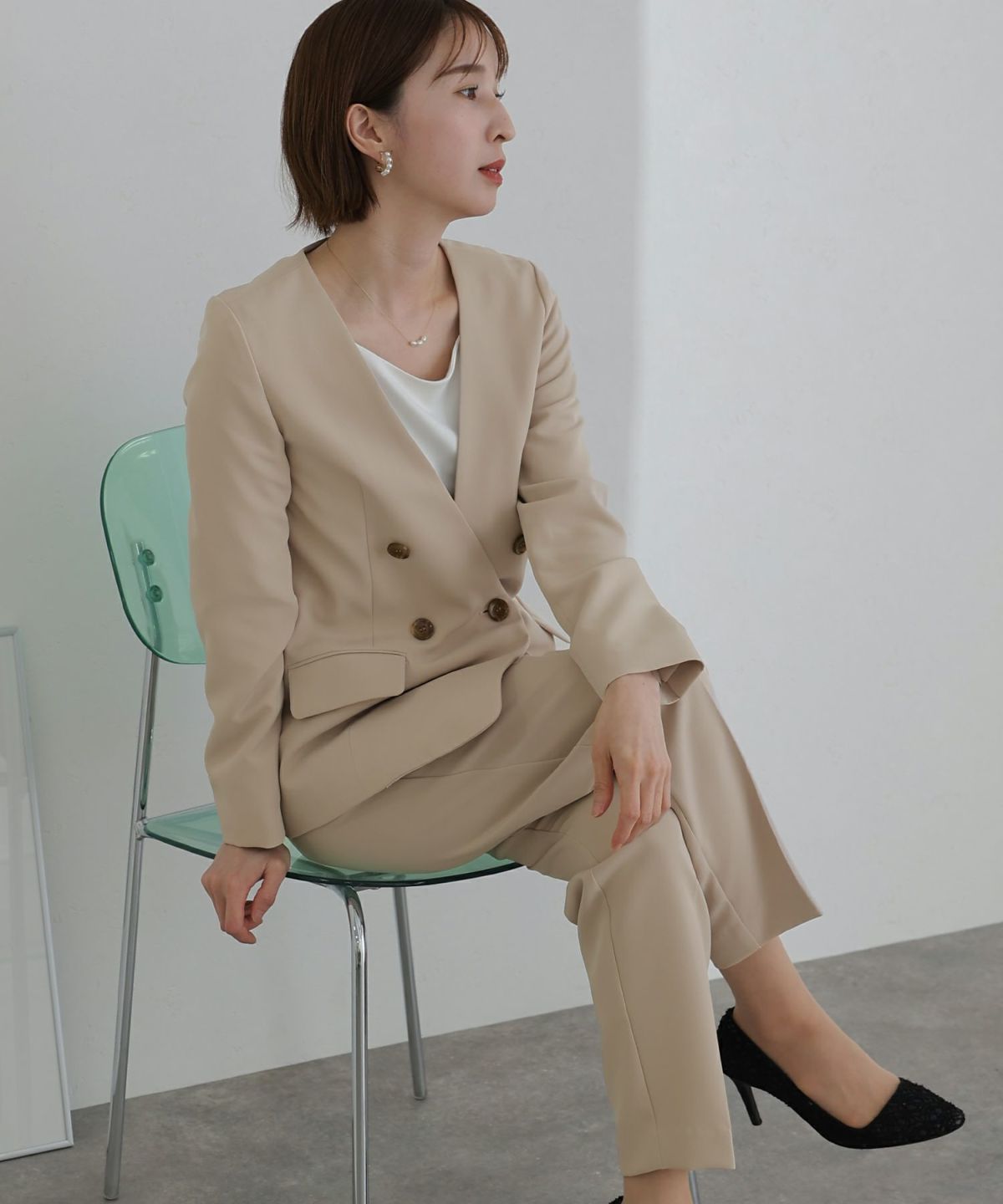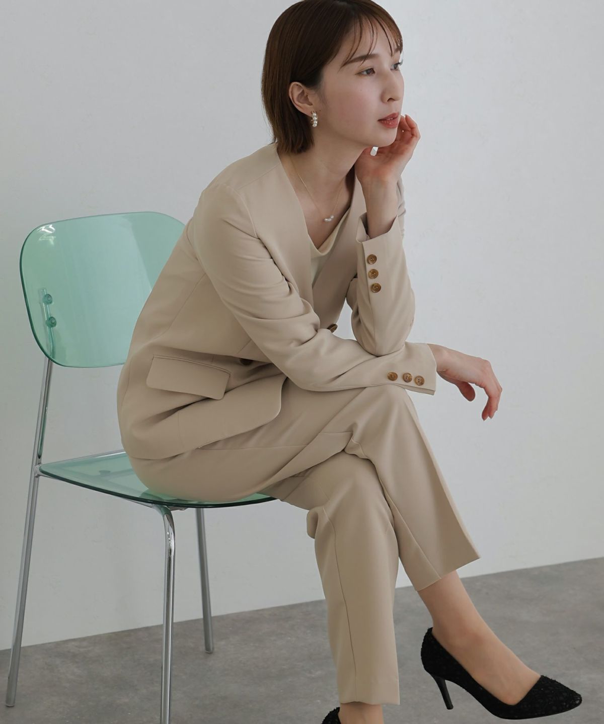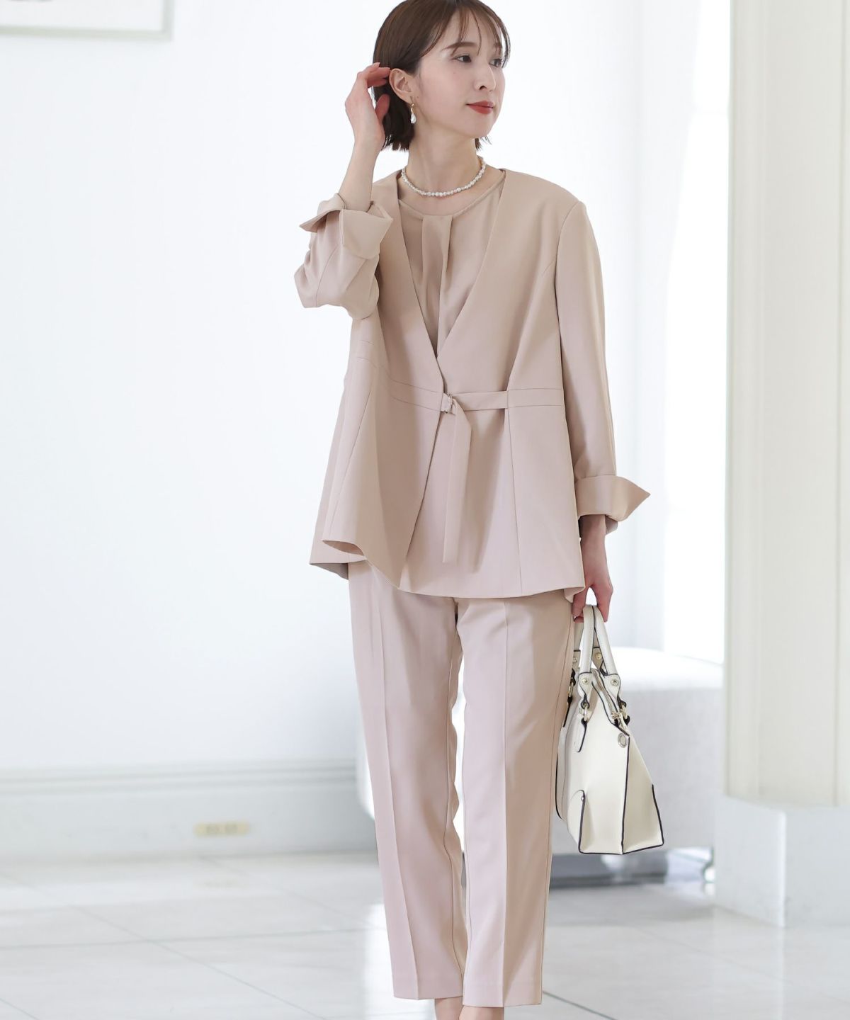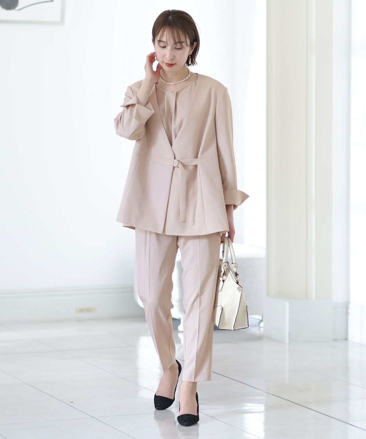 女性らしい柔らかくふんわりとした上品さを演出 ネックパールトップスセットアップスーツ