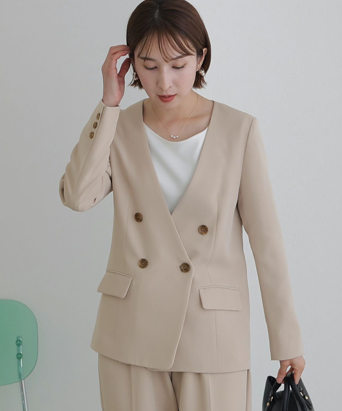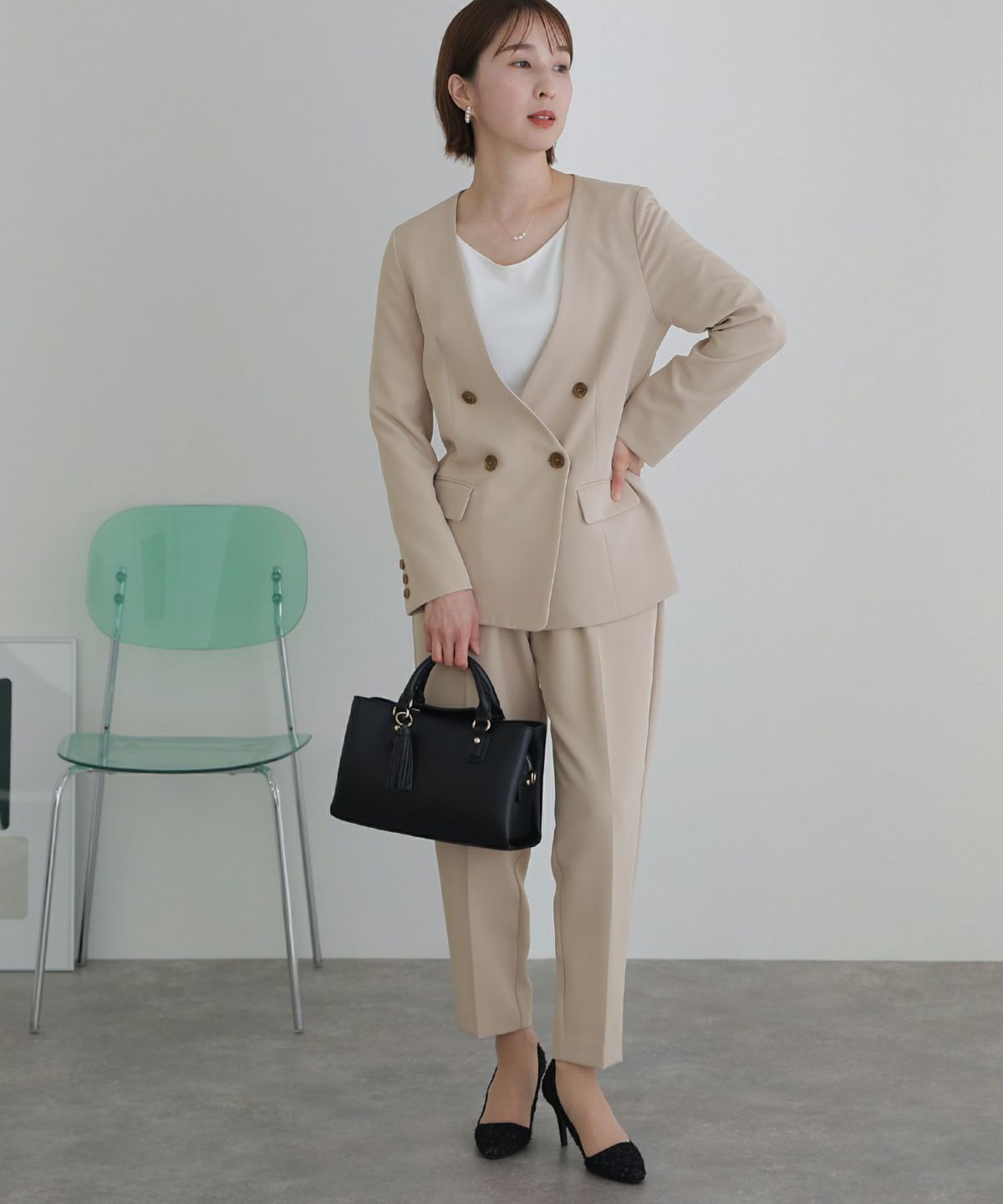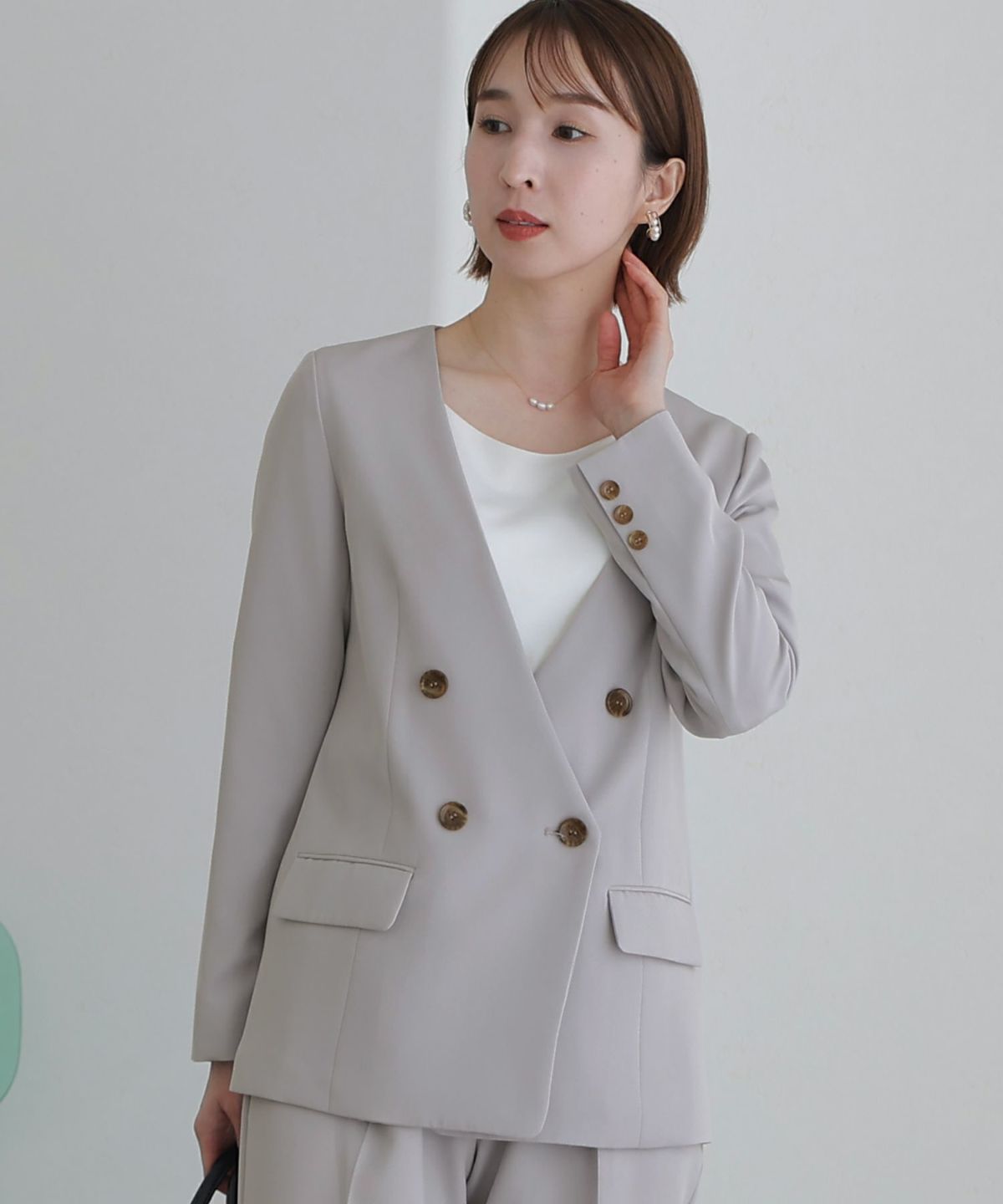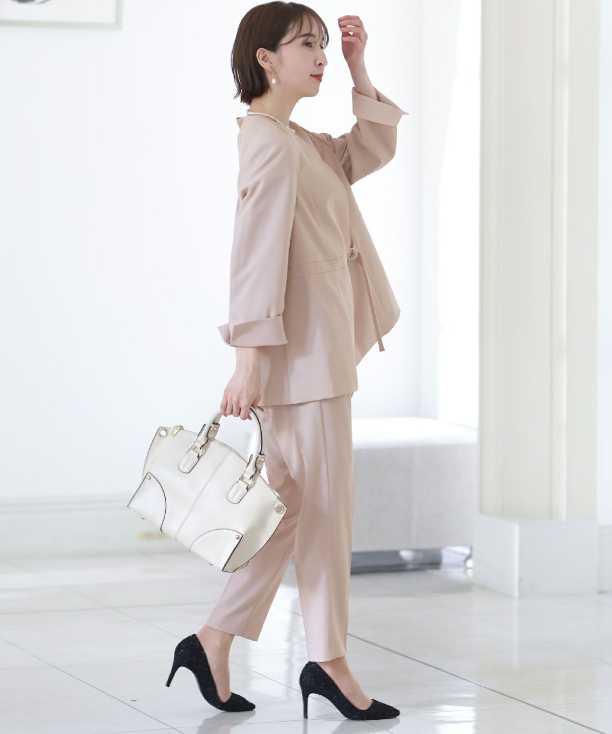 女性らしい柔らかくふんわりとした上品さを演出 ネックパールトップスセットアップスーツ