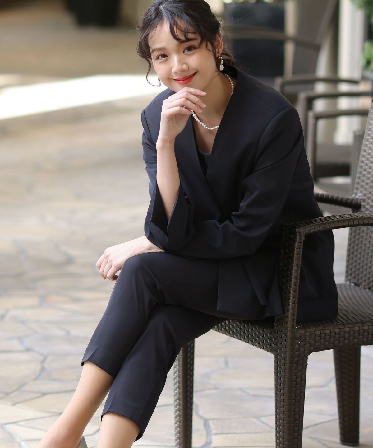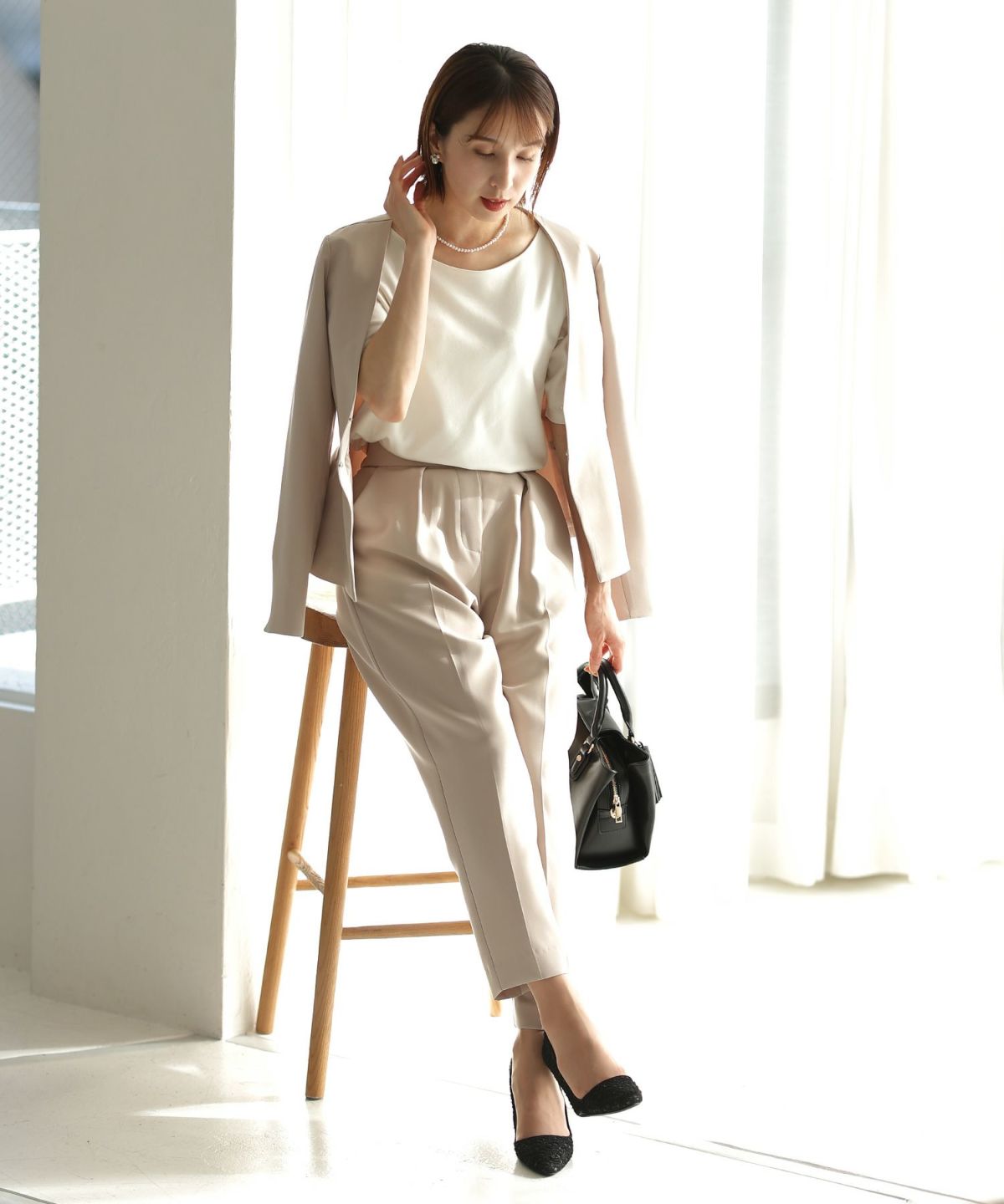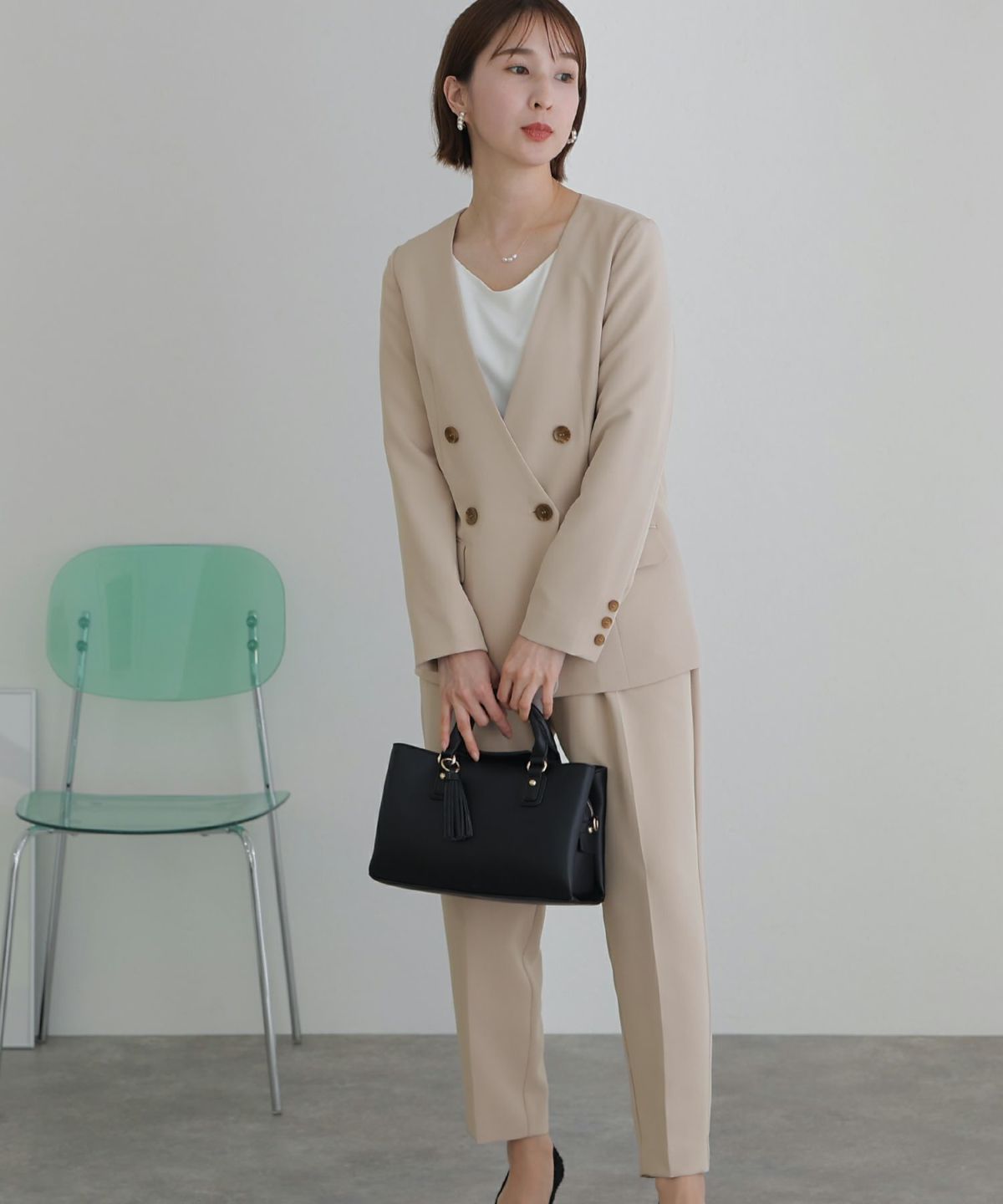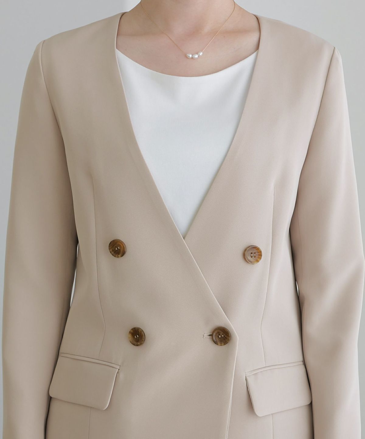 女性らしい柔らかくふんわりとした上品さを演出 ネックパールトップスセットアップスーツ