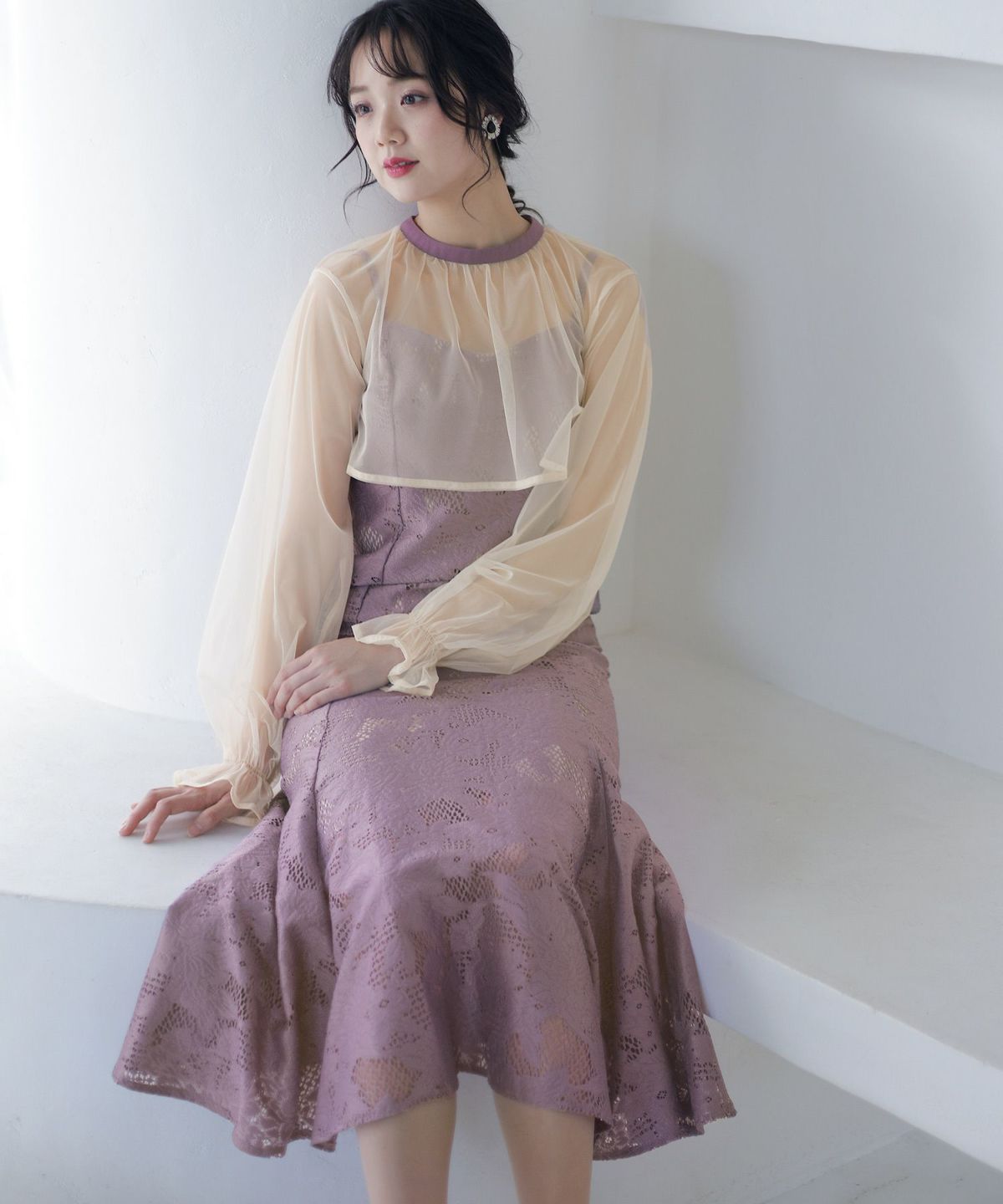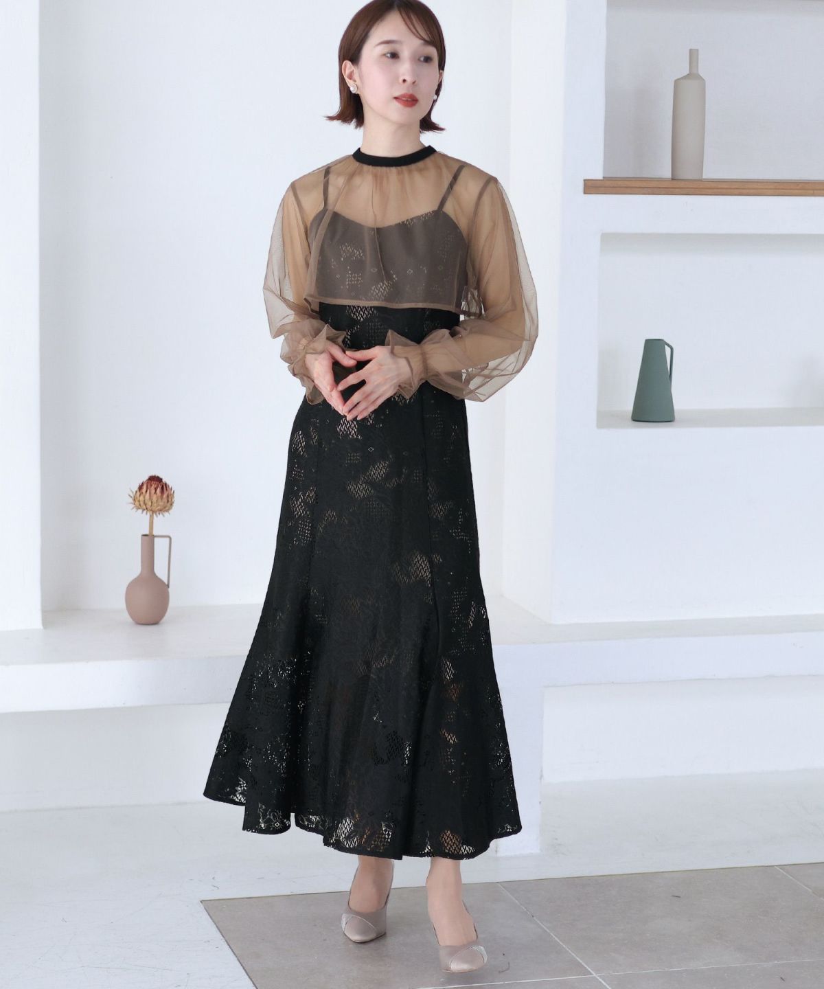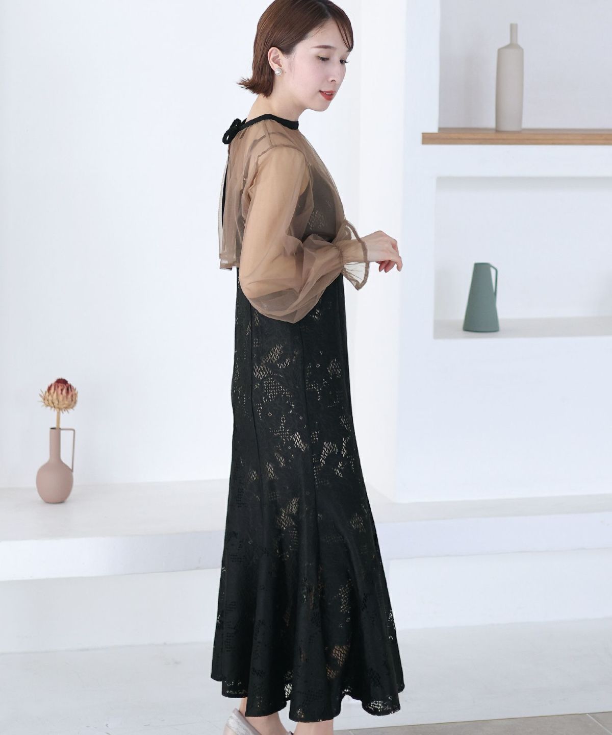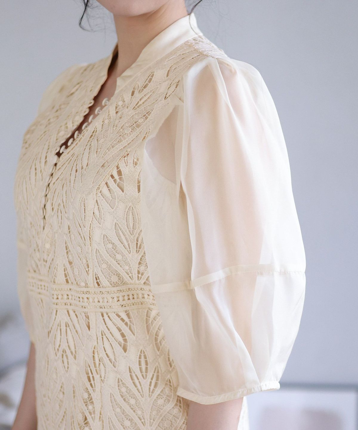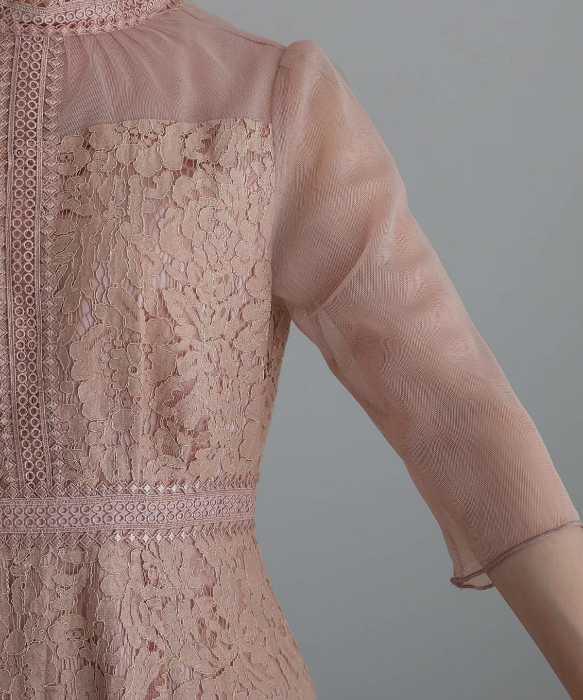 レースとオーガンジーの透け感が可愛い ケミカルレース×オーガンジースリーブワンピース