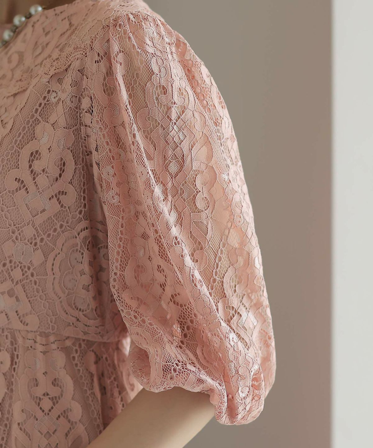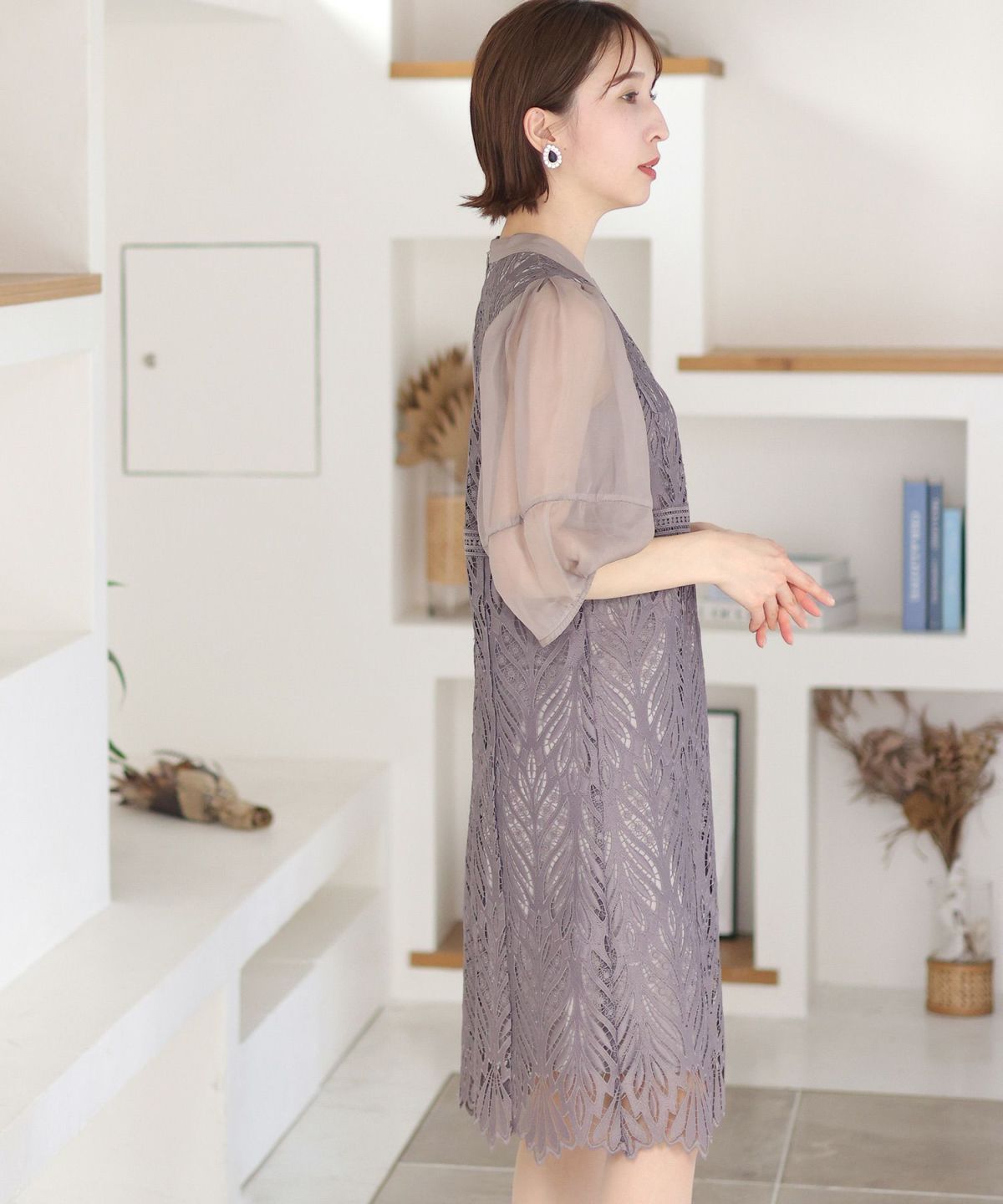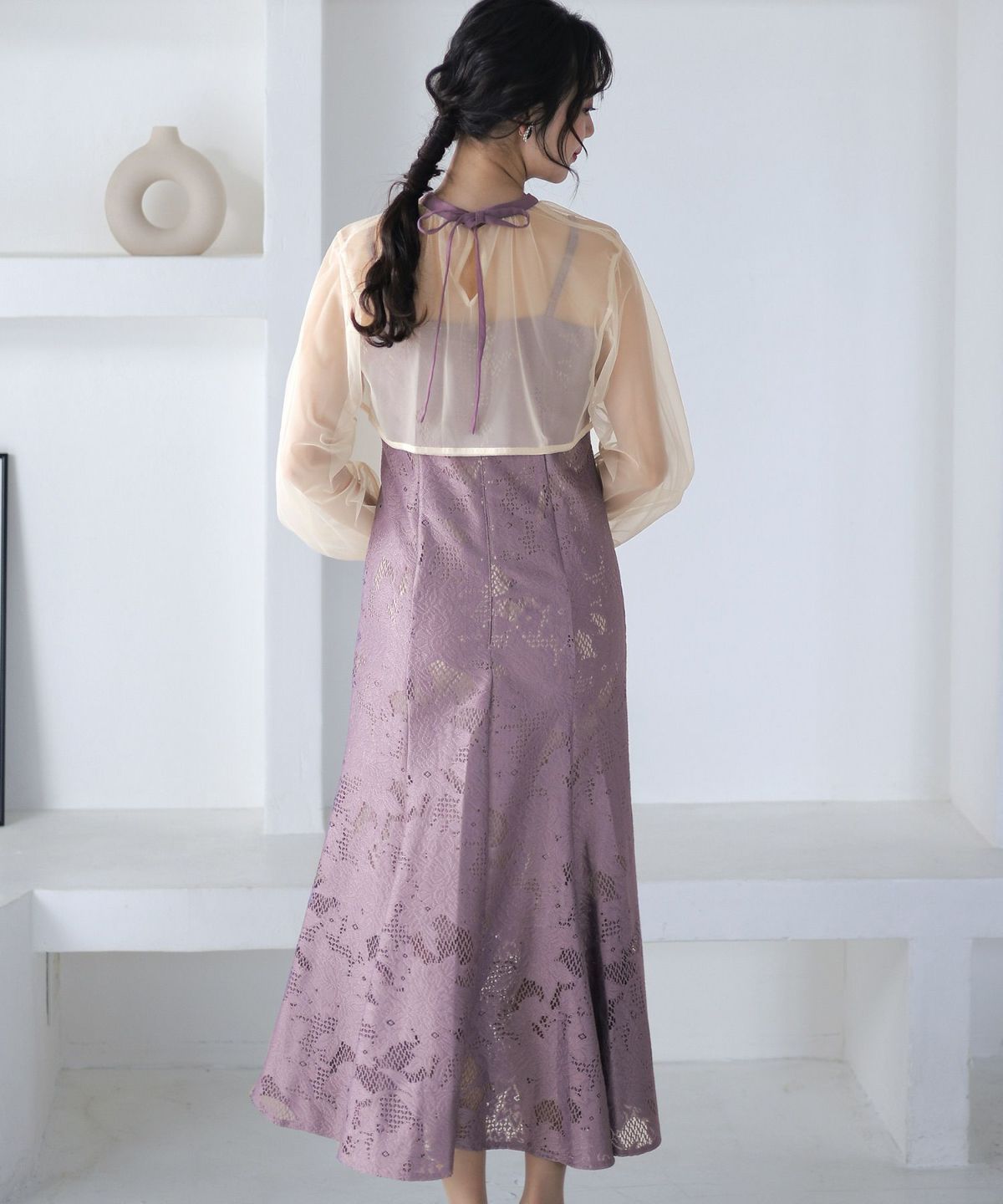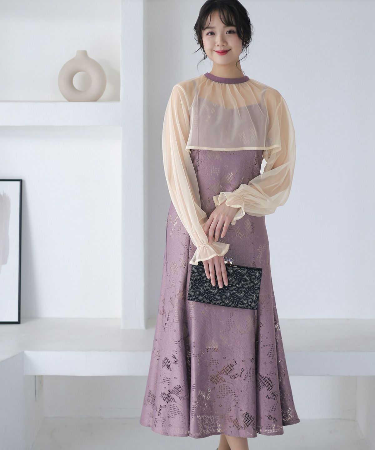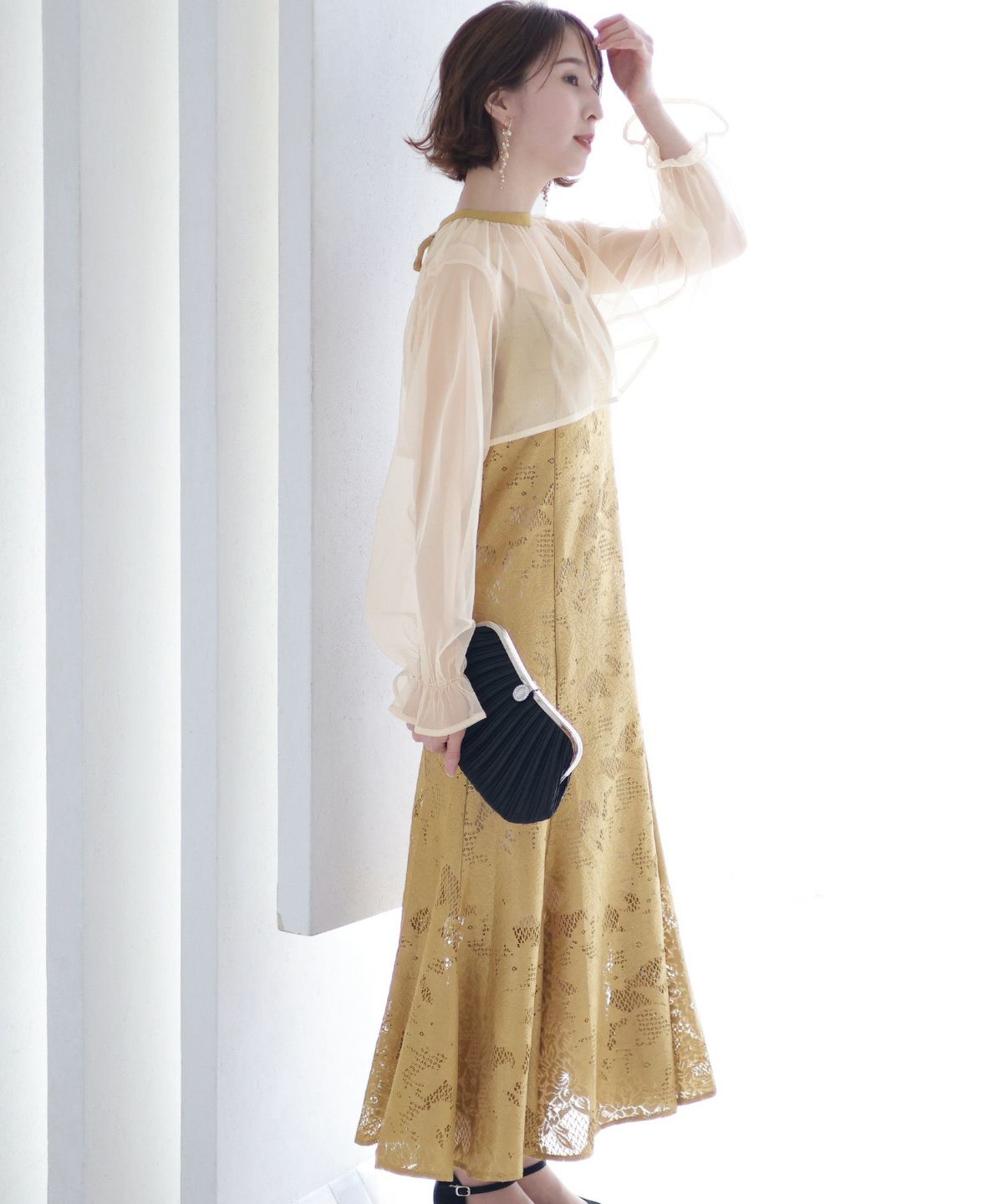 レースとオーガンジーの透け感が可愛い ケミカルレース×オーガンジースリーブワンピース