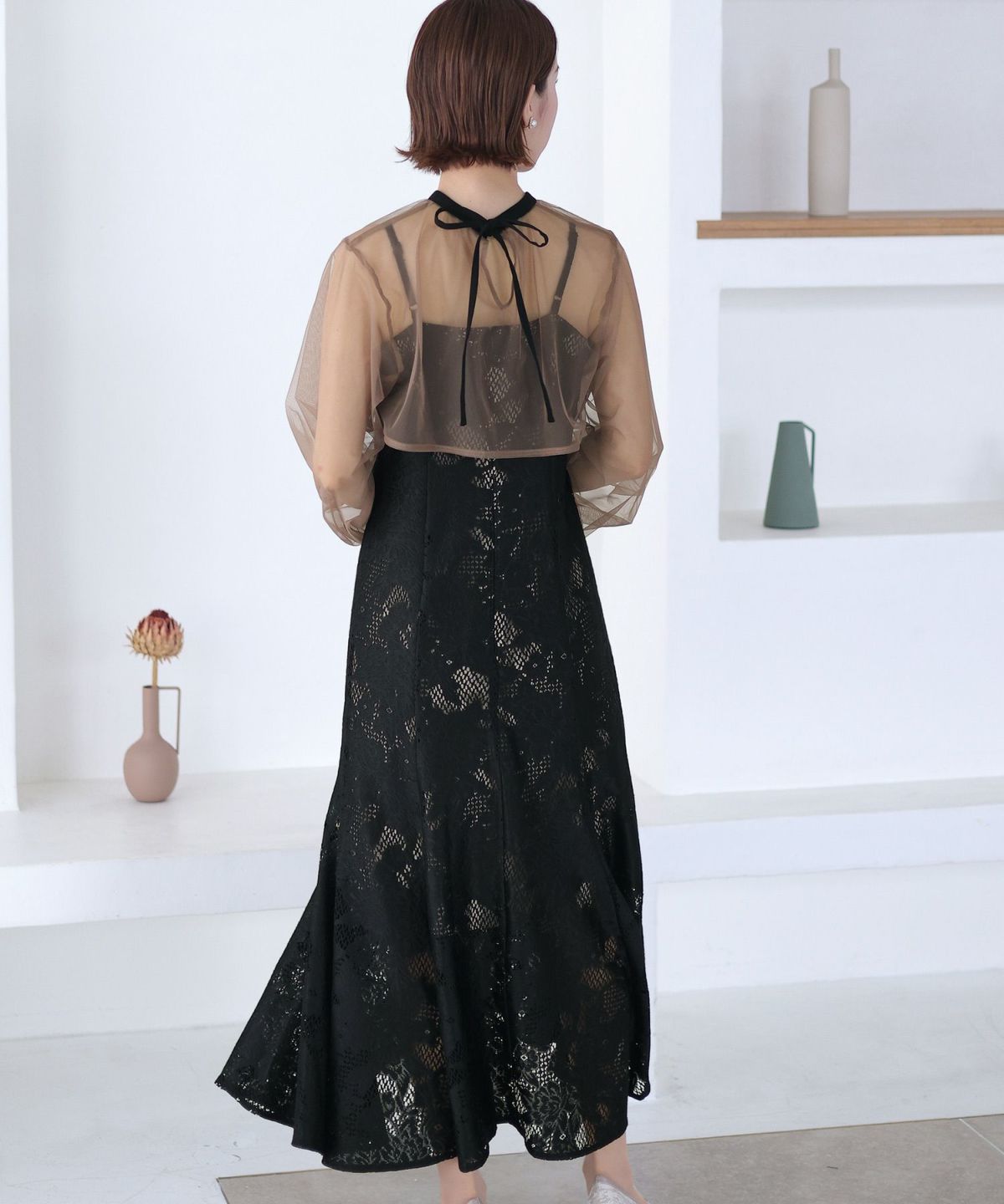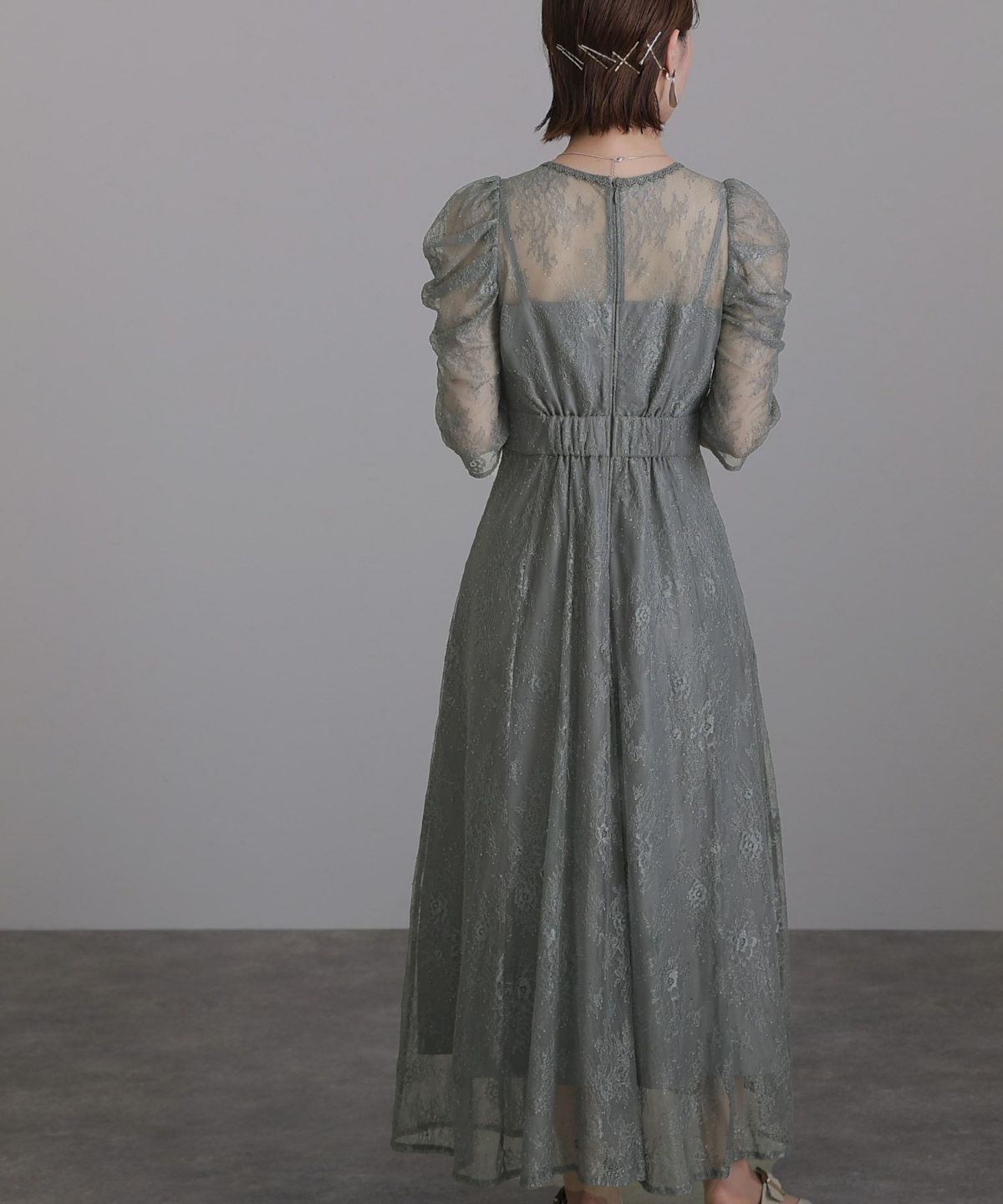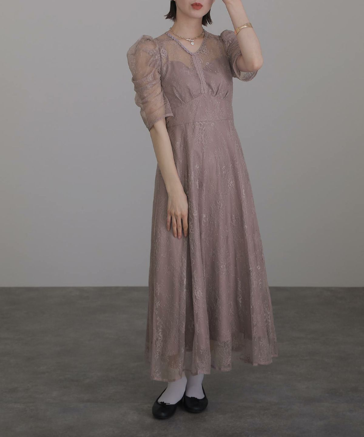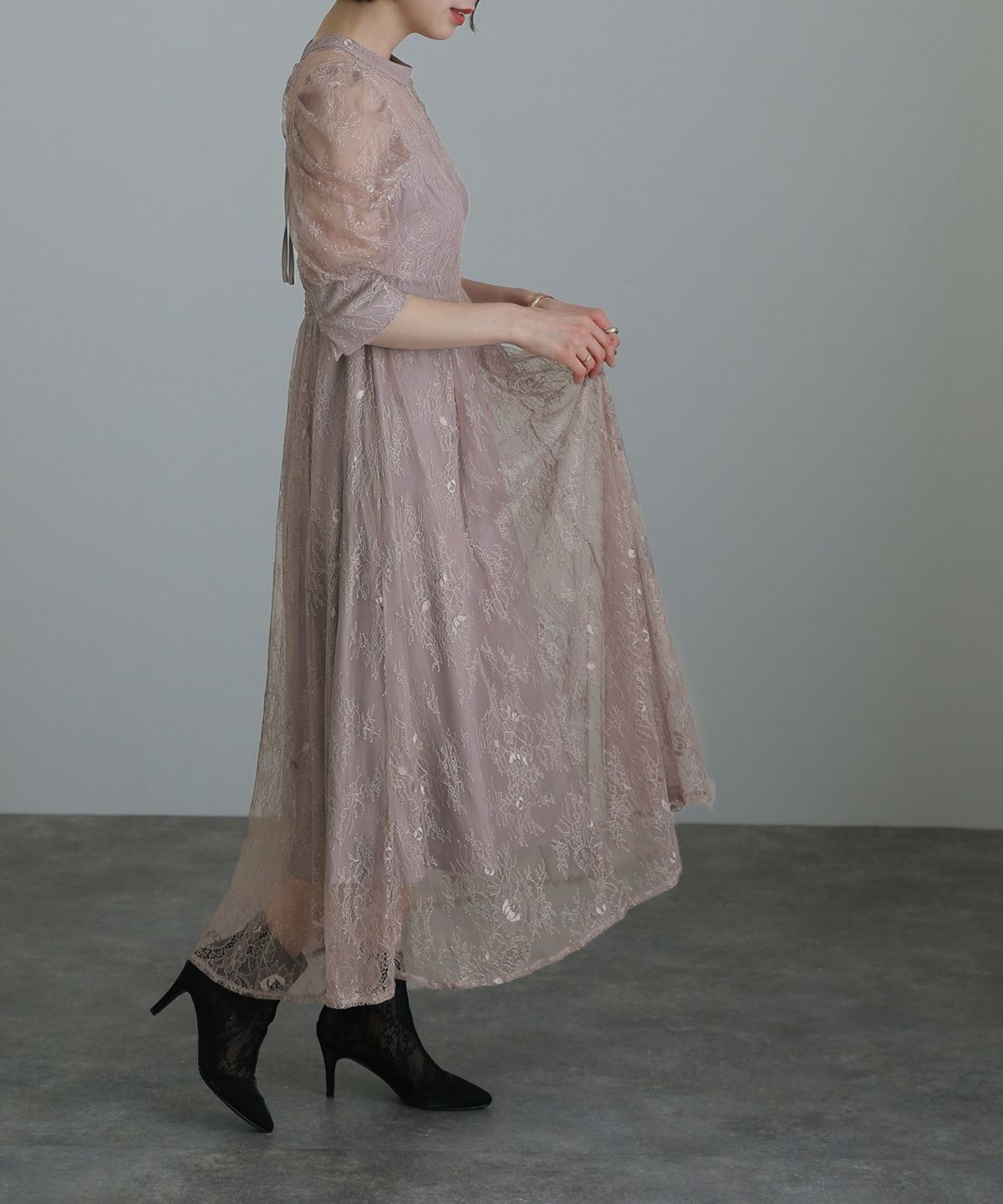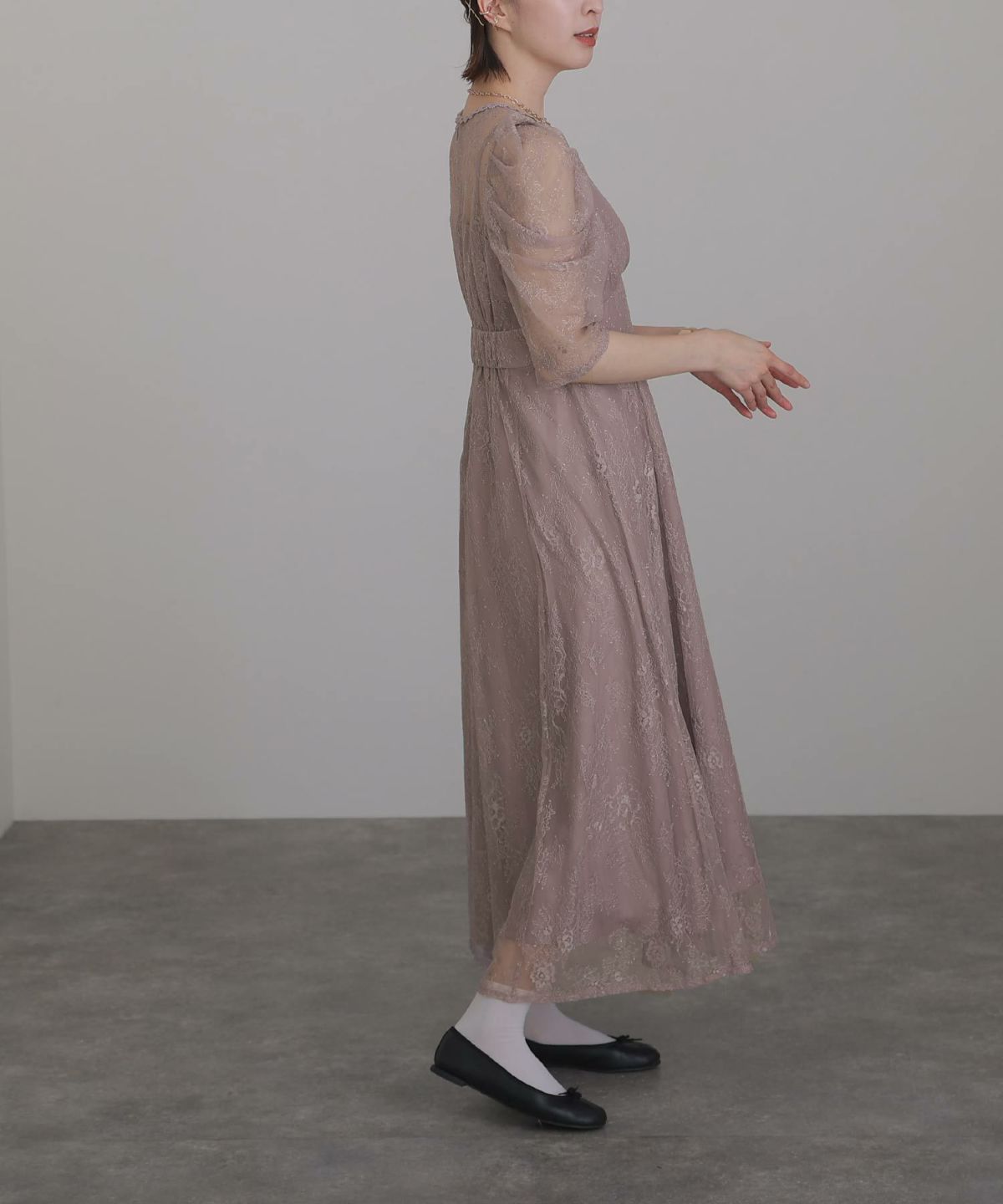 レースとオーガンジーの透け感が可愛い ケミカルレース×オーガンジースリーブワンピース