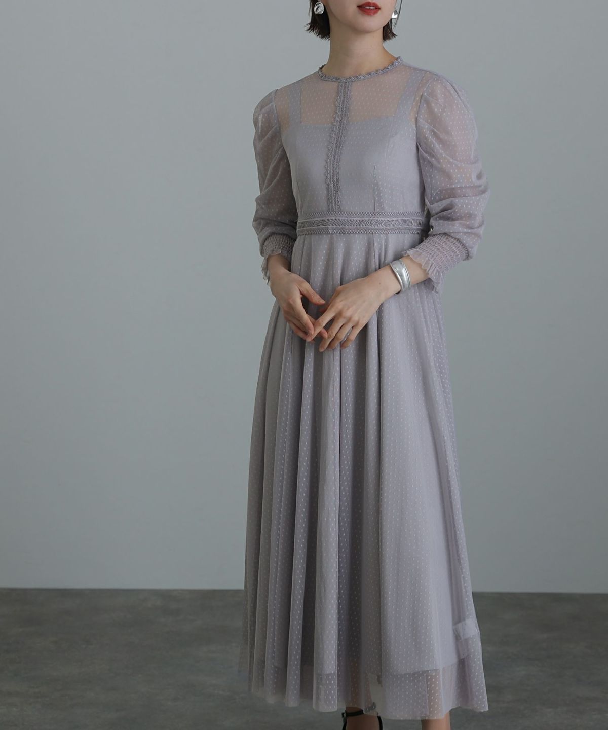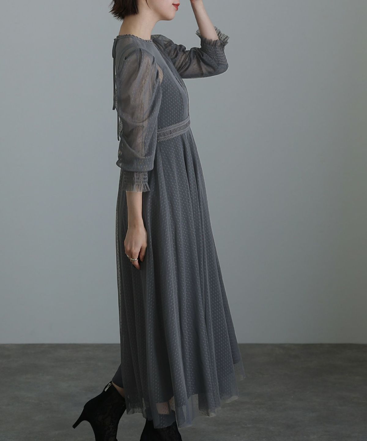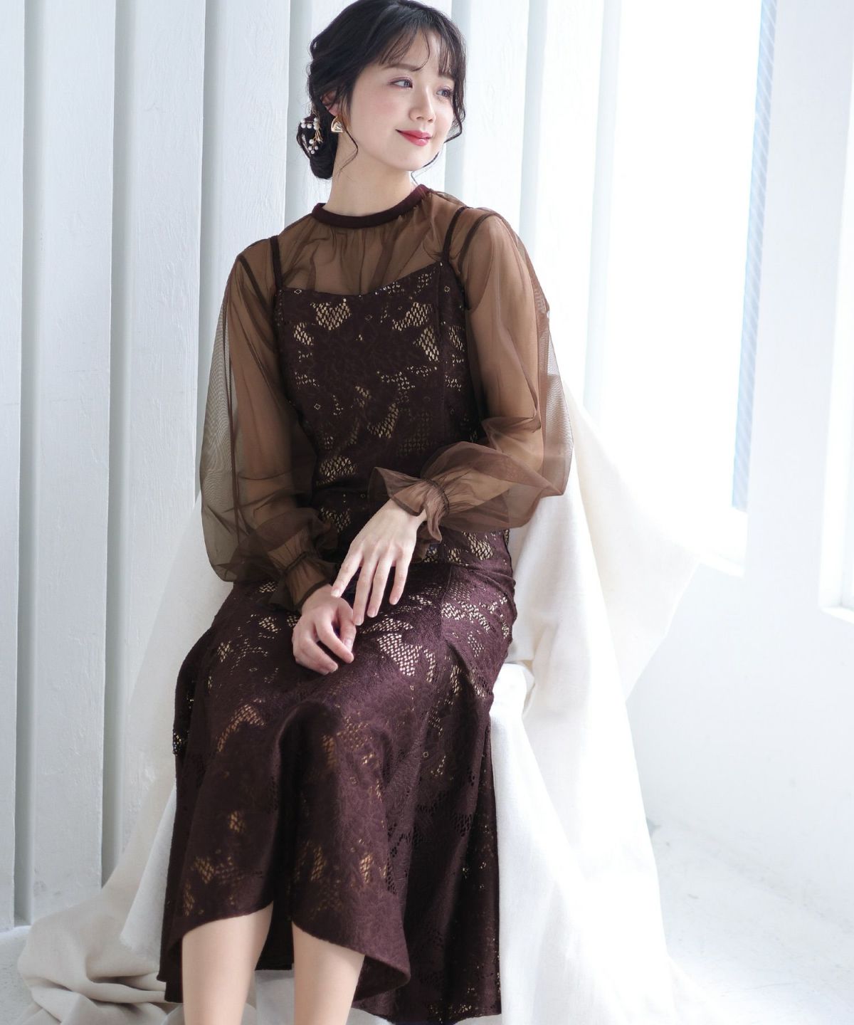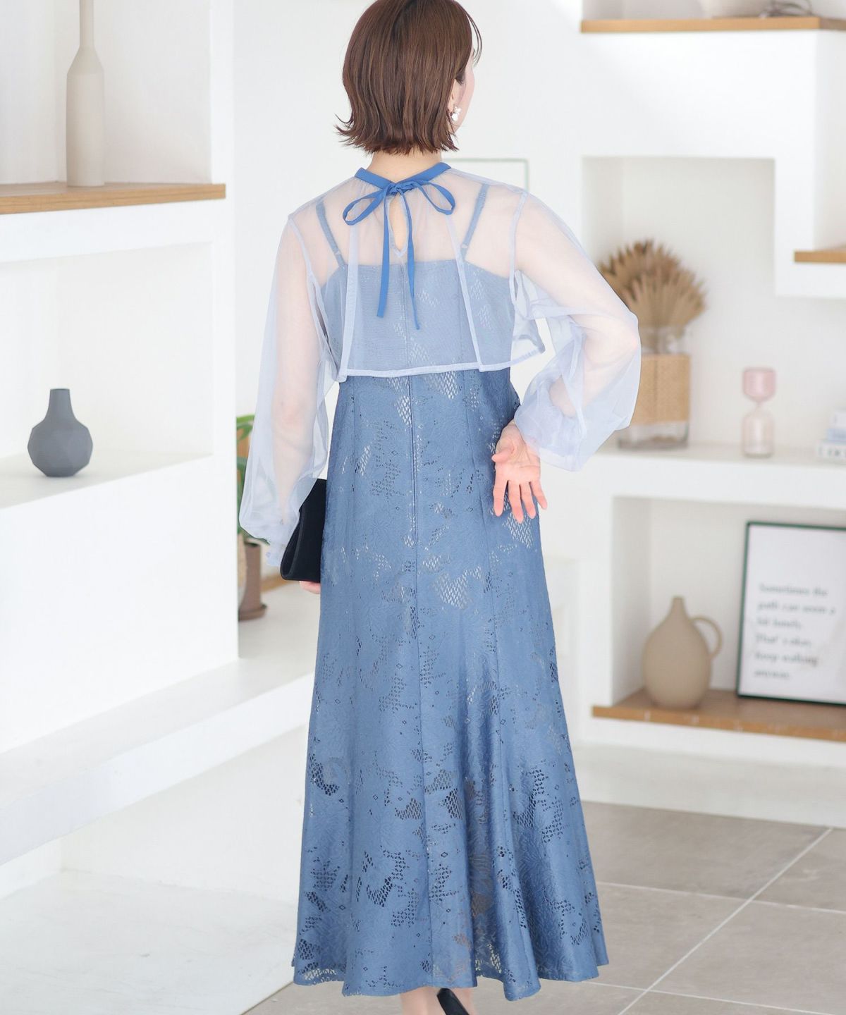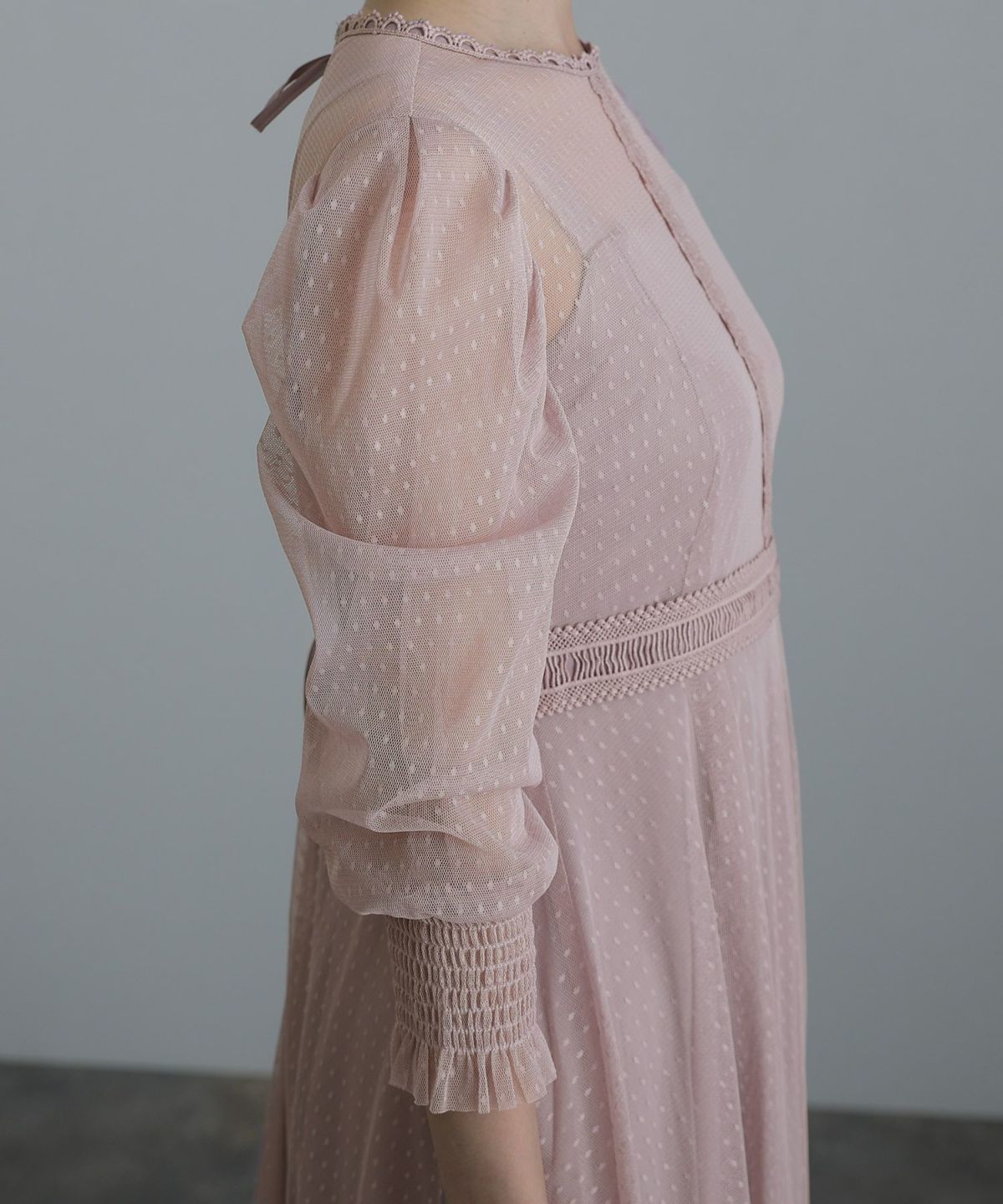レースとオーガンジーの透け感が可愛い ケミカルレース×オーガンジースリーブワンピース
