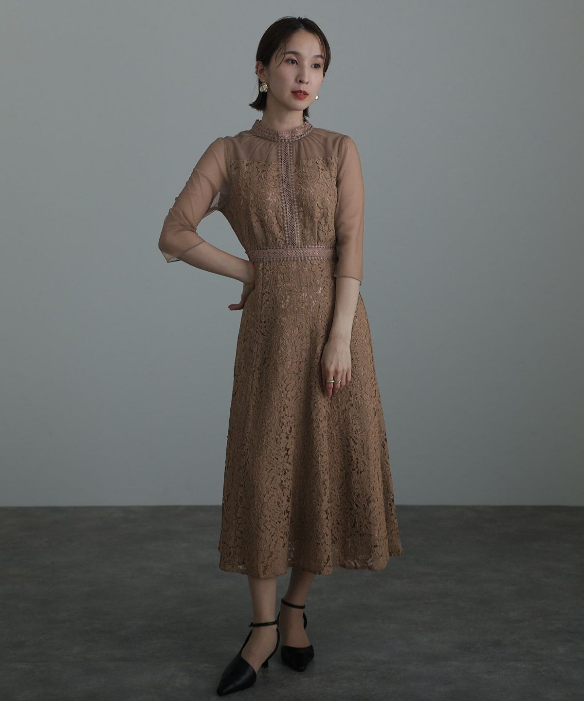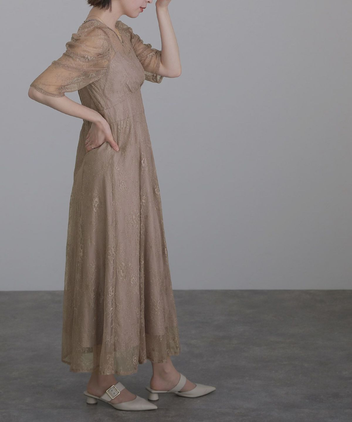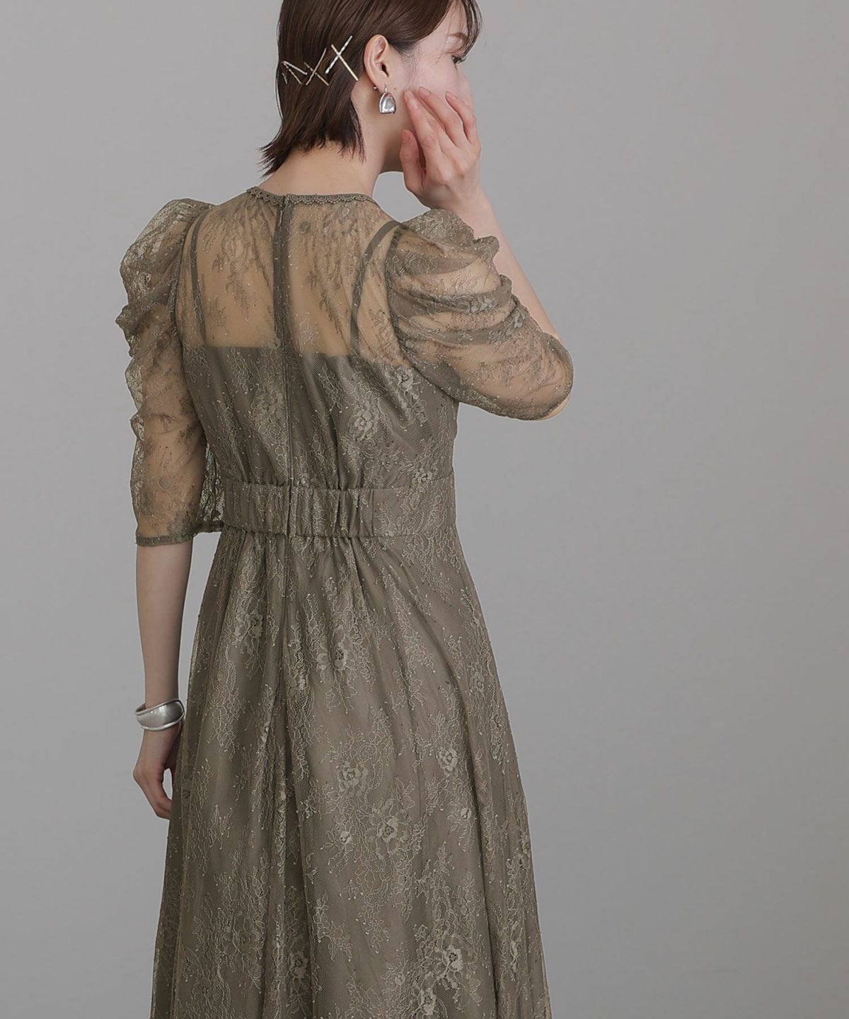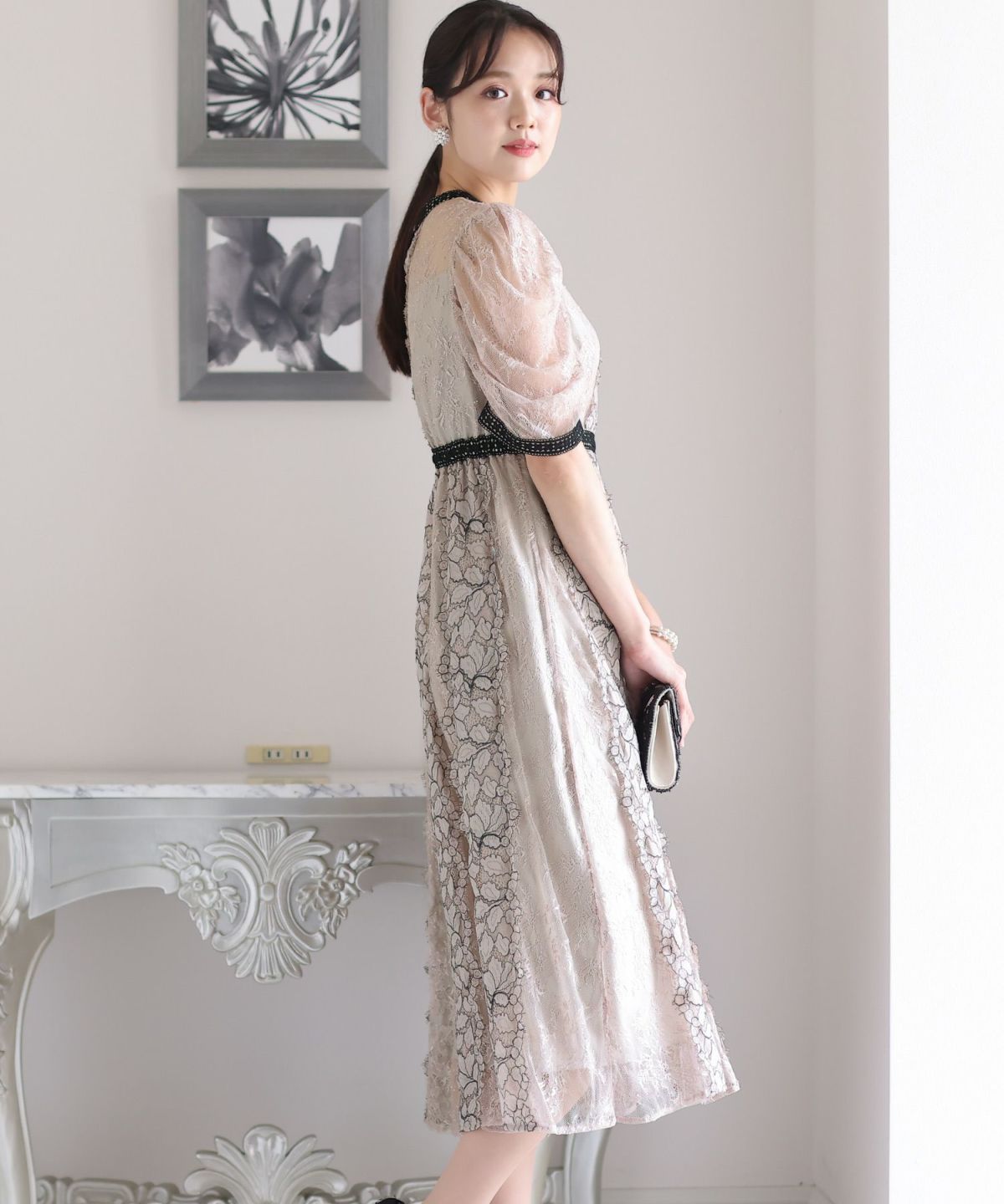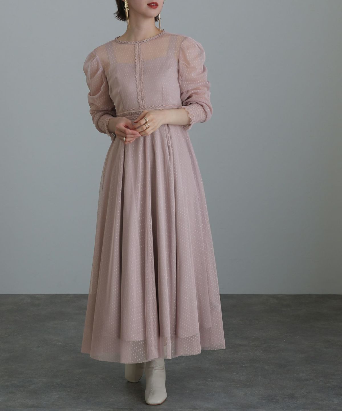 レースとオーガンジーの透け感が可愛い ケミカルレース×オーガンジースリーブワンピース