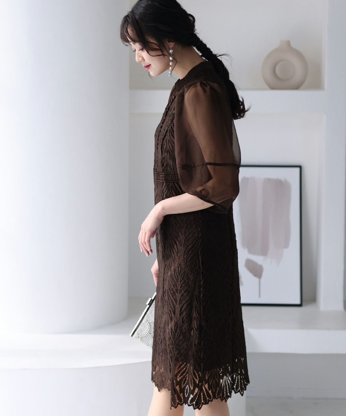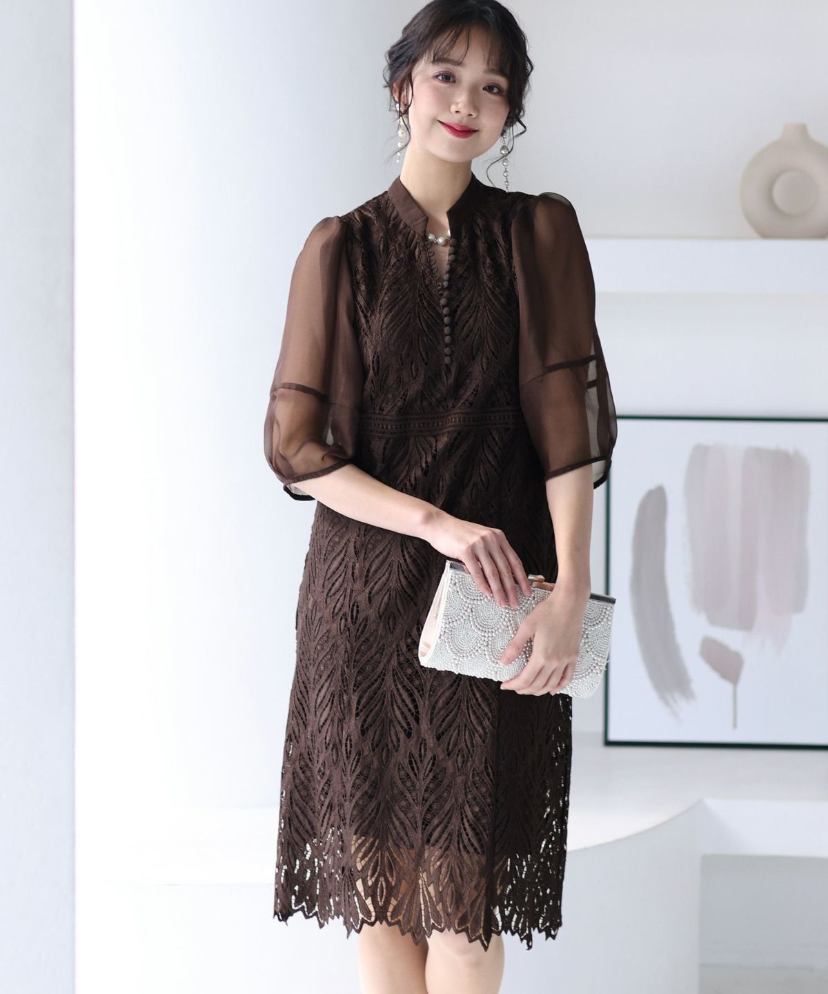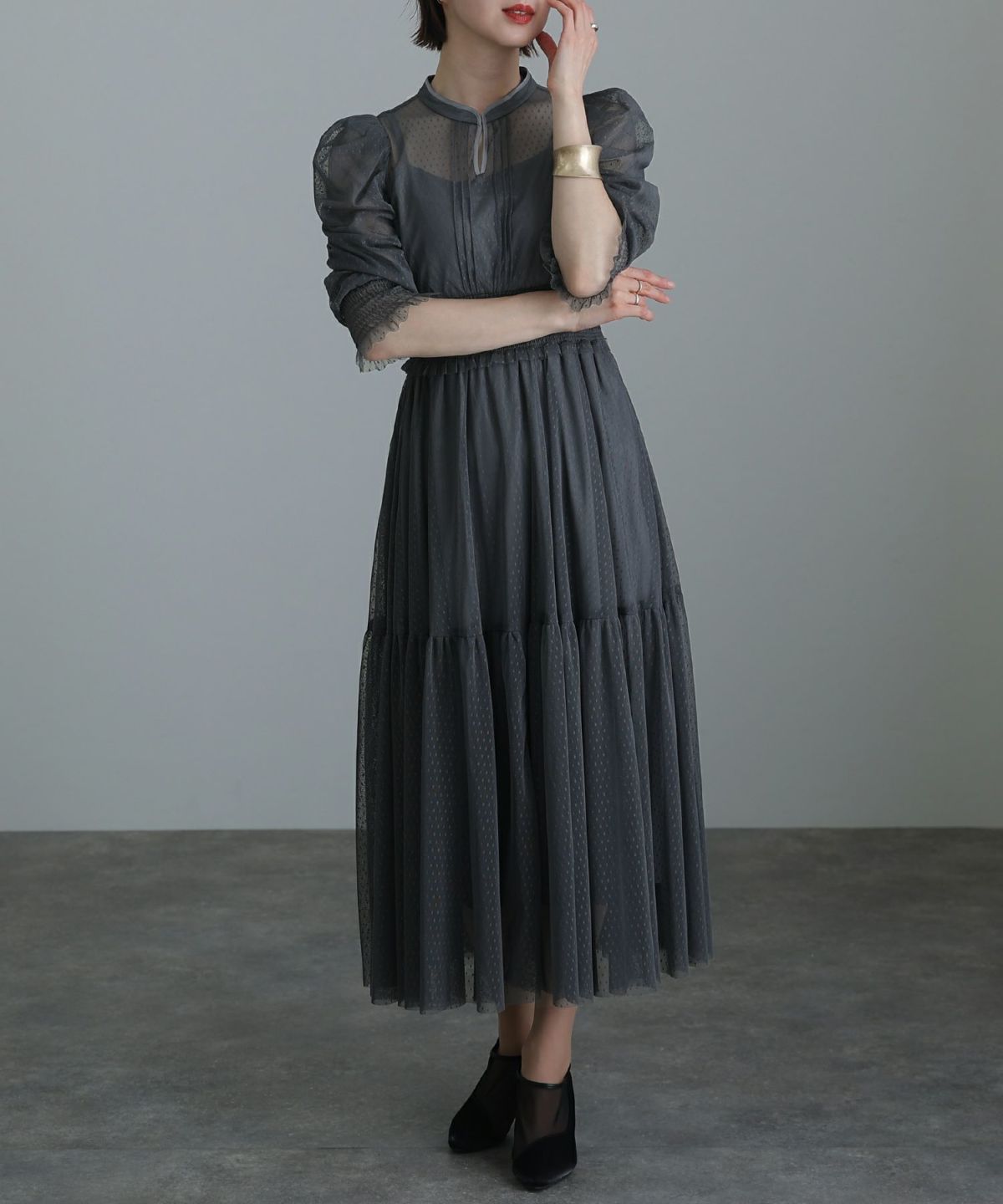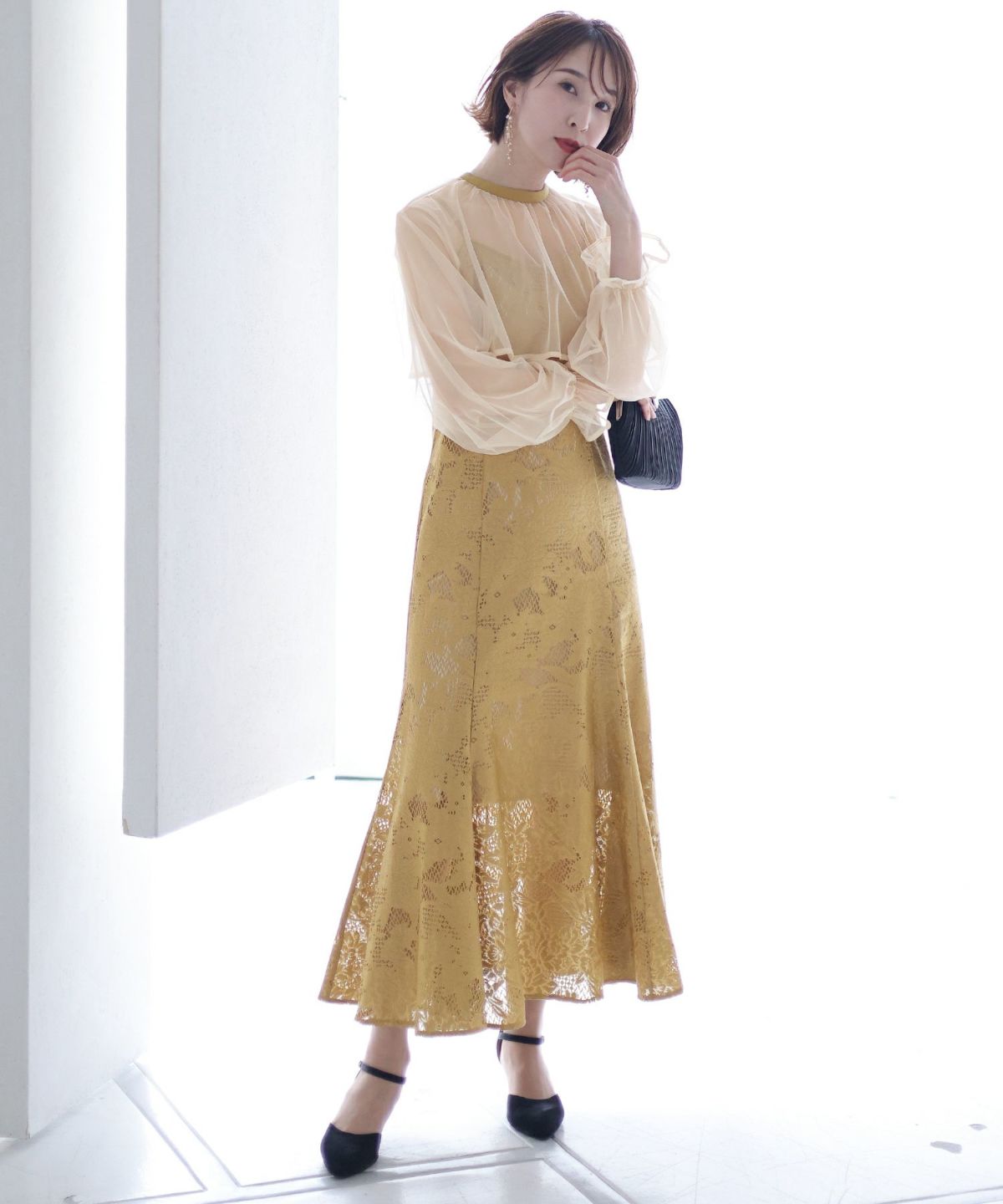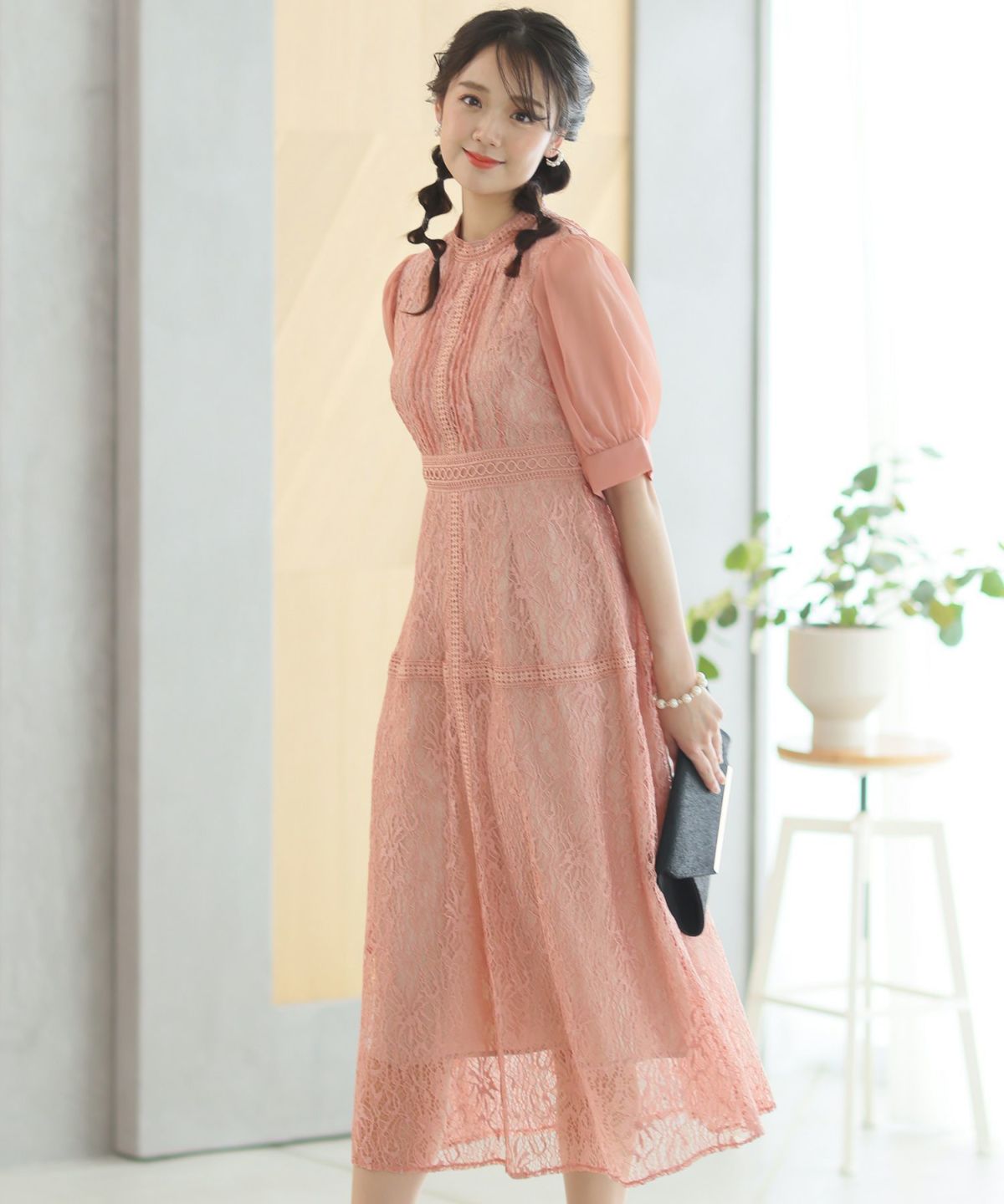 レースとオーガンジーの透け感が可愛い ケミカルレース×オーガンジースリーブワンピース