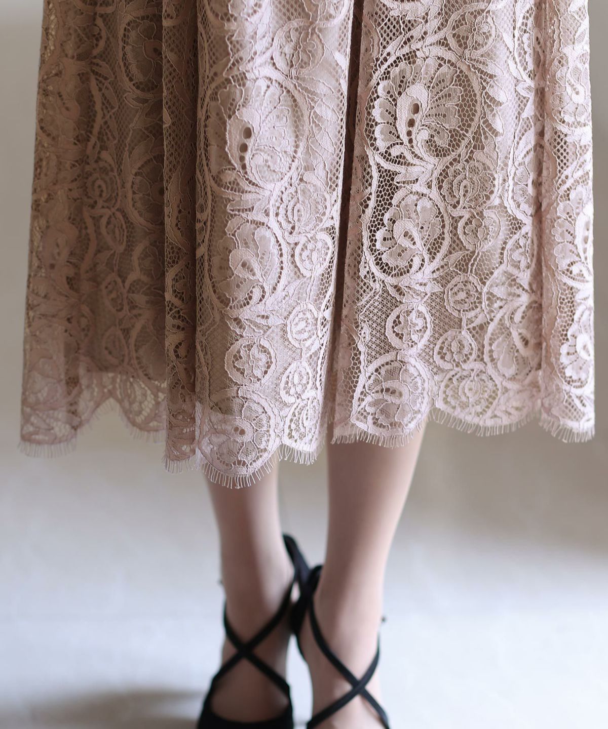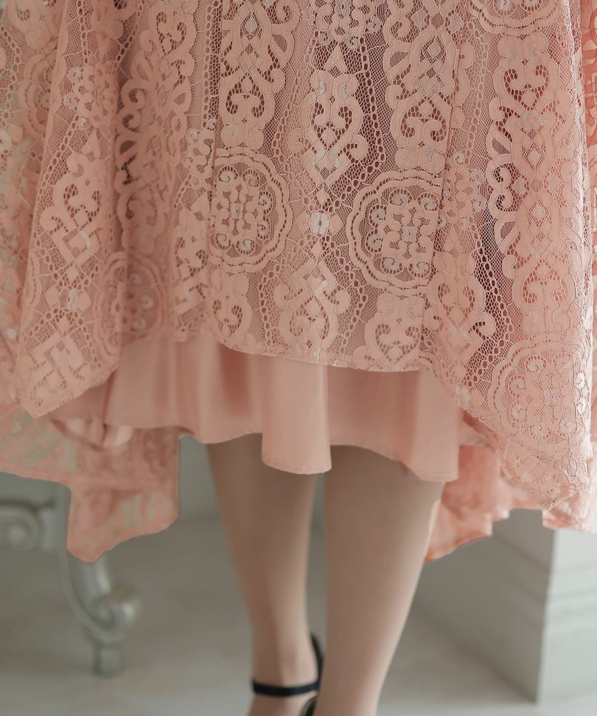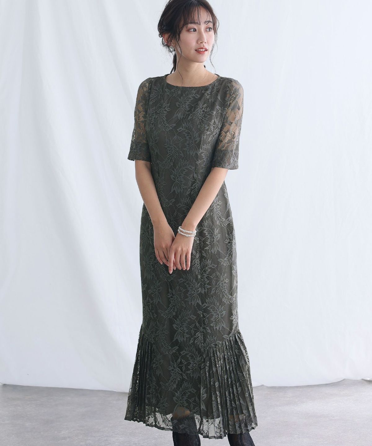 スカート裾のプリーツマーメイドデザインが華やかで可愛い 総レースマーメードワンピース