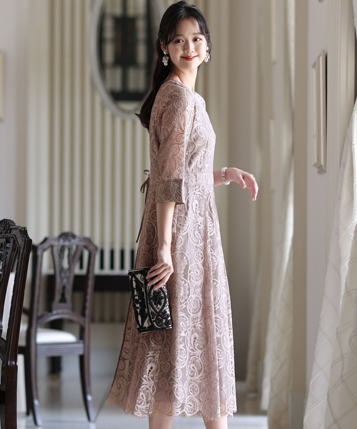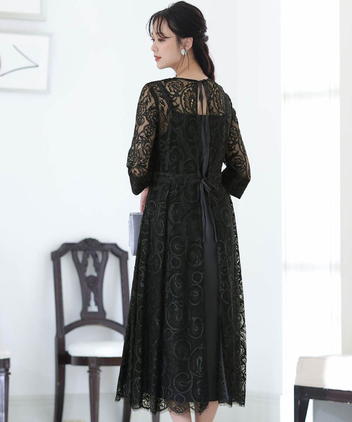 クラシカルな雰囲気の大人可愛いデザインワンピース クラシカルレースリボンワンピース