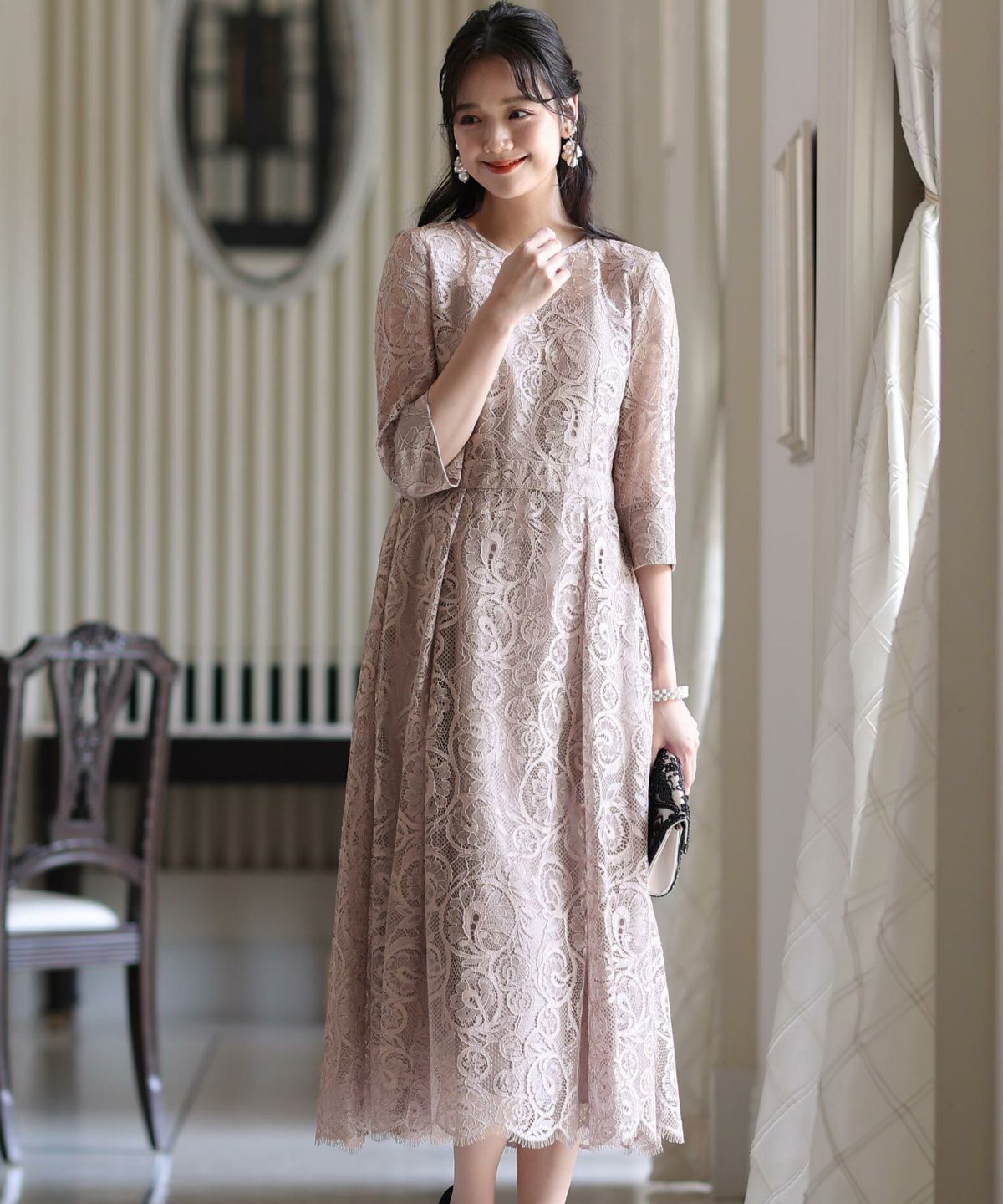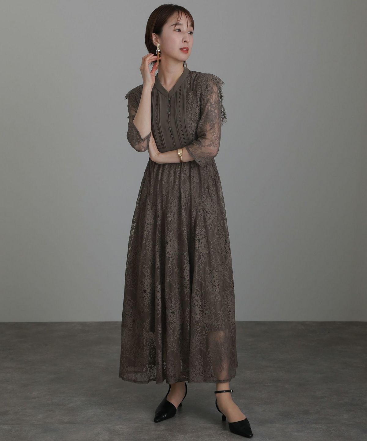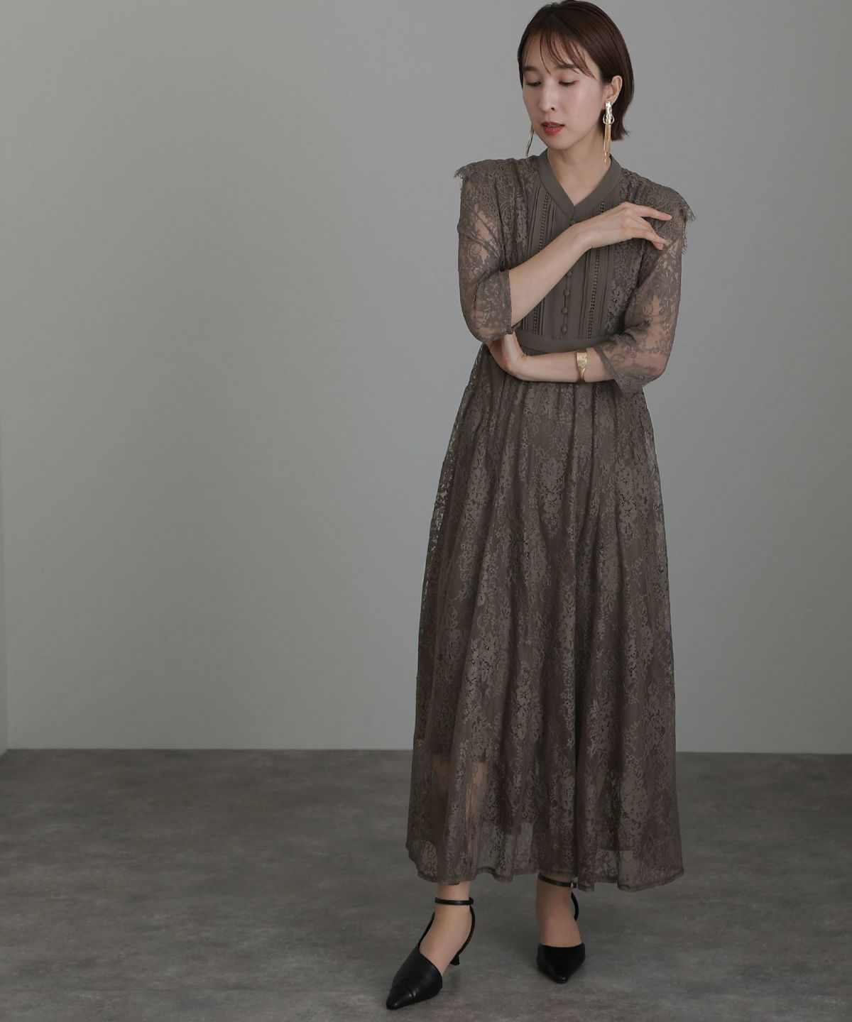 落ち着きのあるカラーとボタニカル柄が可愛い ラグランスリーブオールレースワンピース