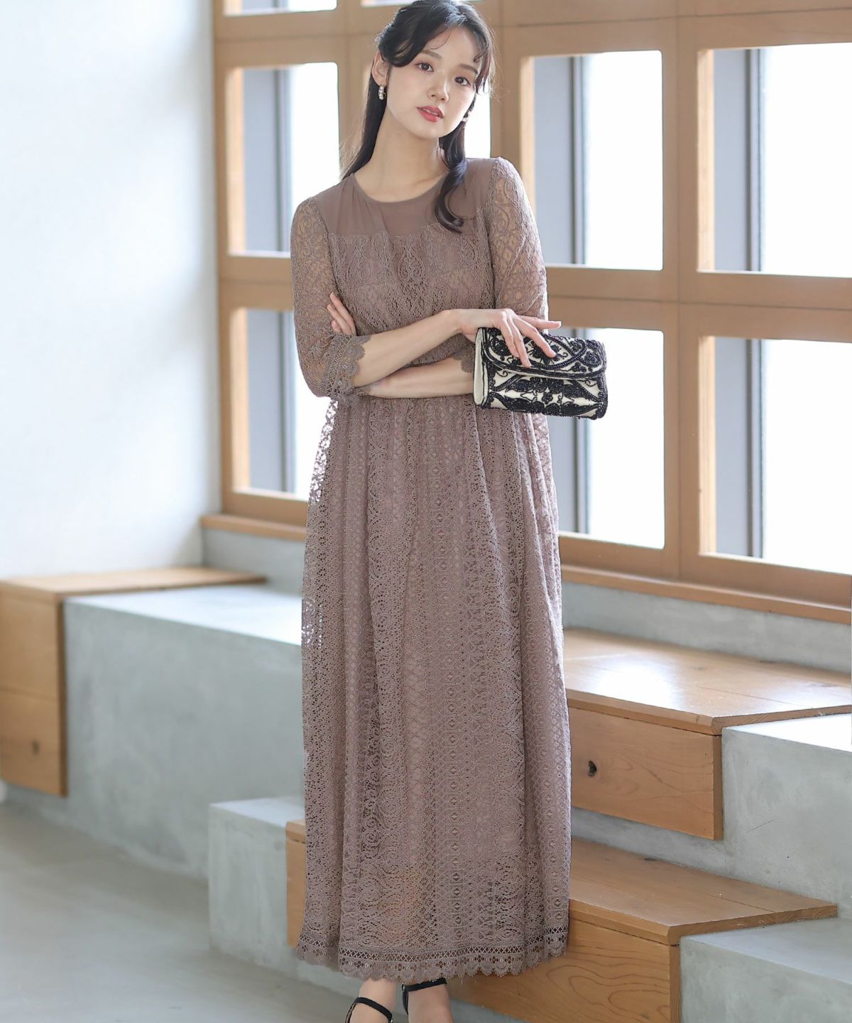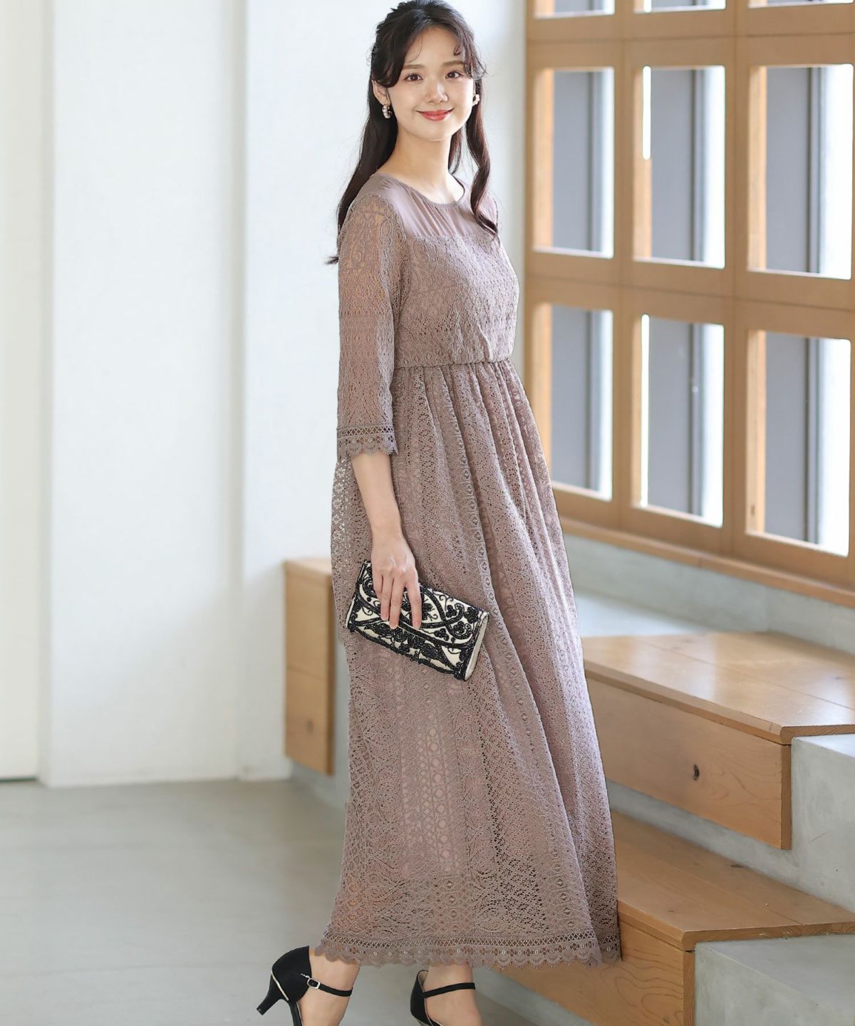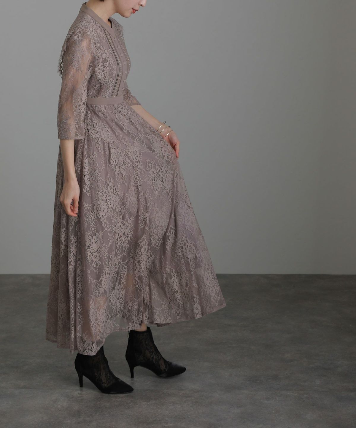 落ち着きのあるカラーとボタニカル柄が可愛い ラグランスリーブオールレースワンピース