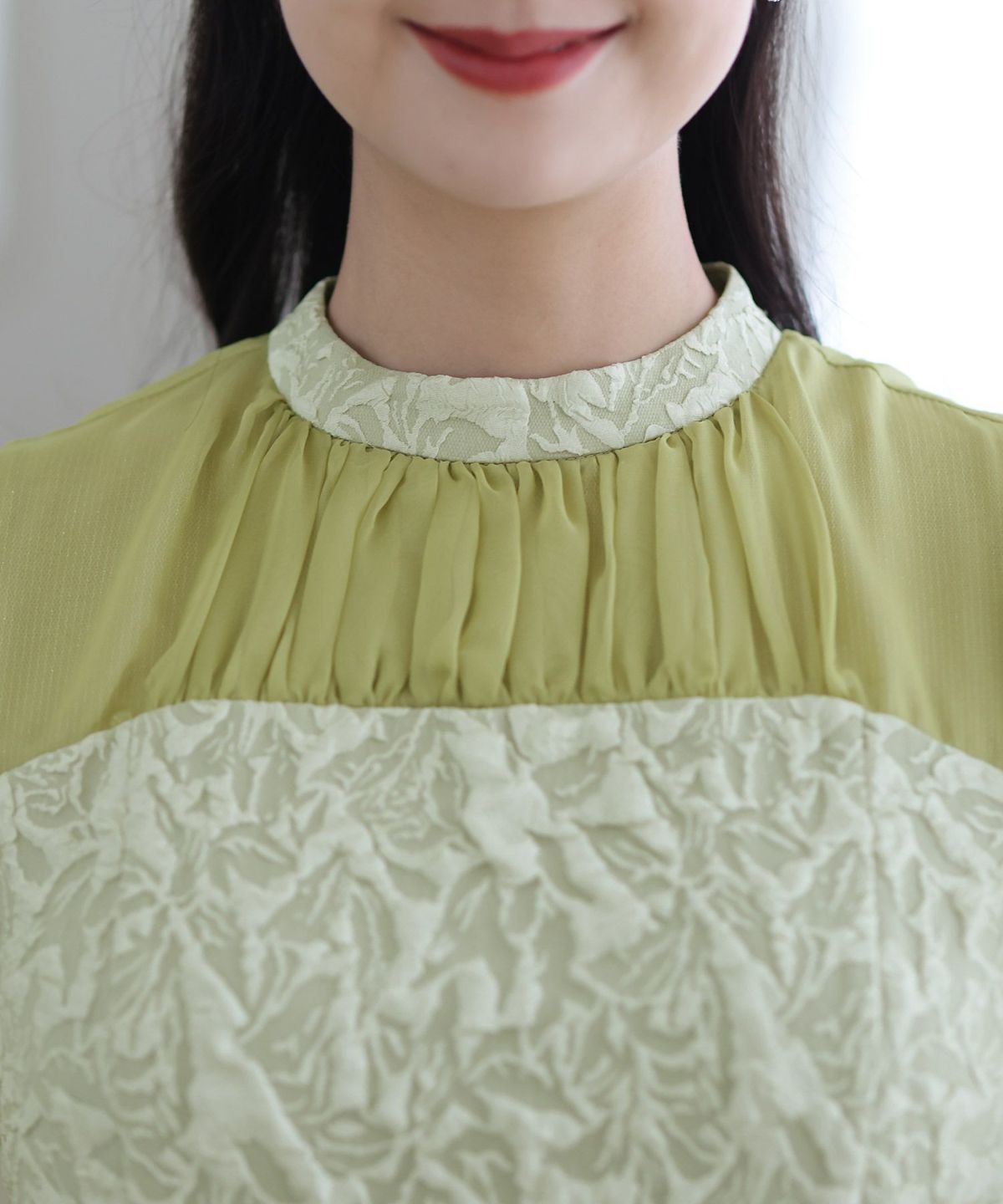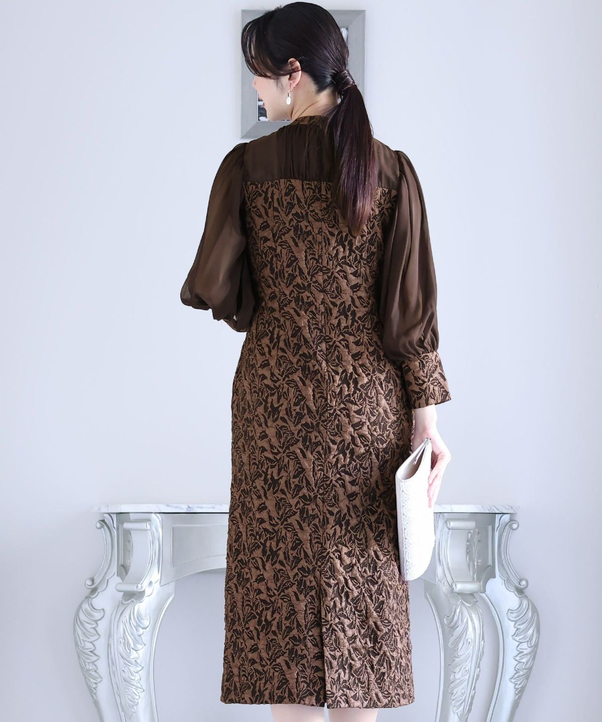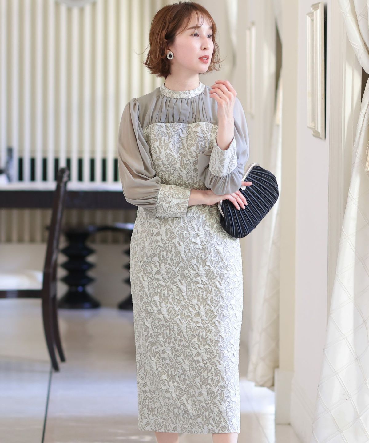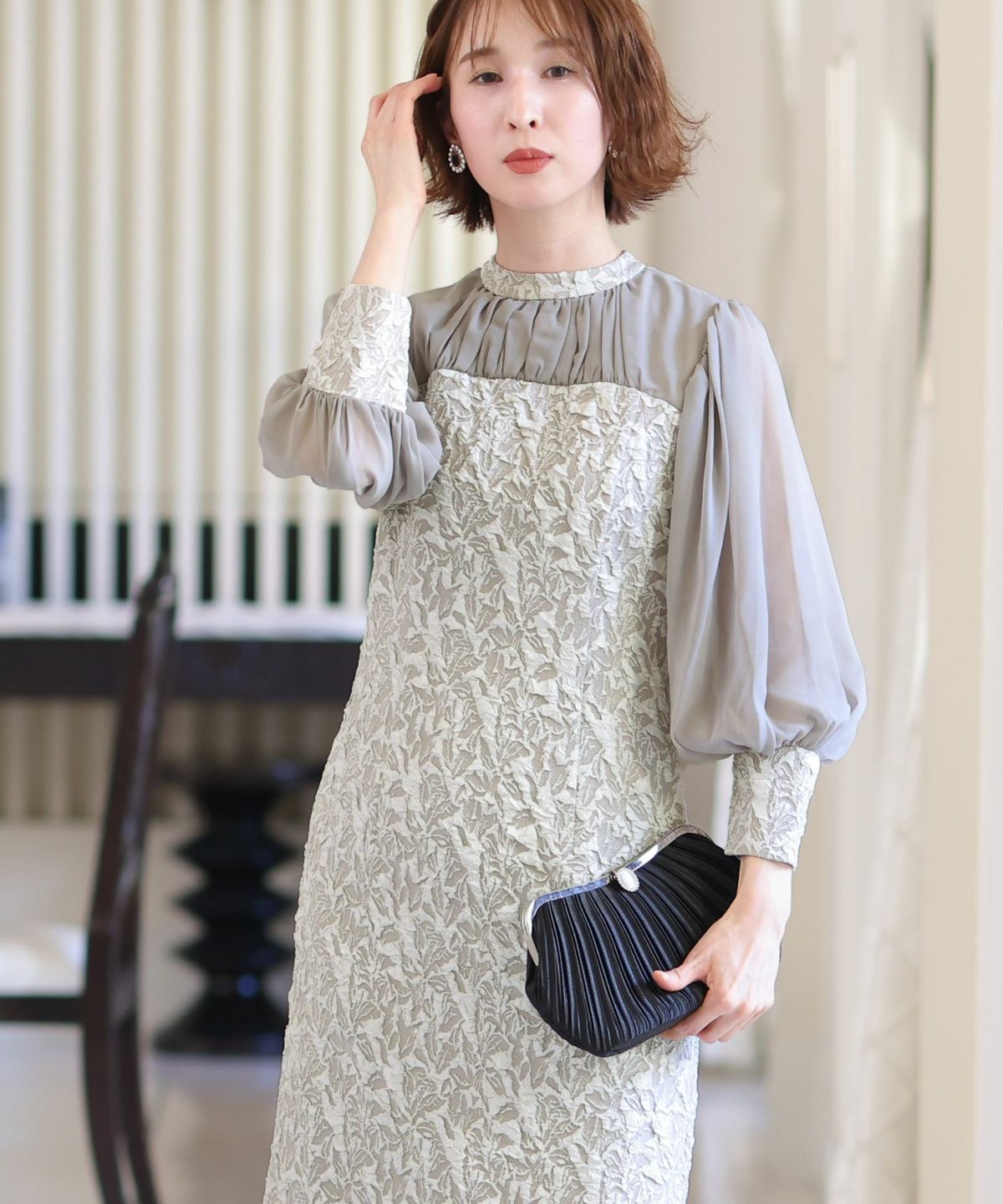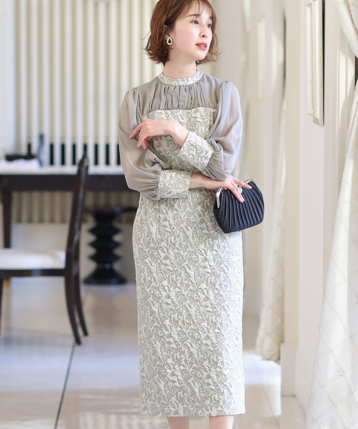 ぷっくり膨らみのあるジャガード生地が高級感漂う オーガンジー×膨れジャガードワンピース