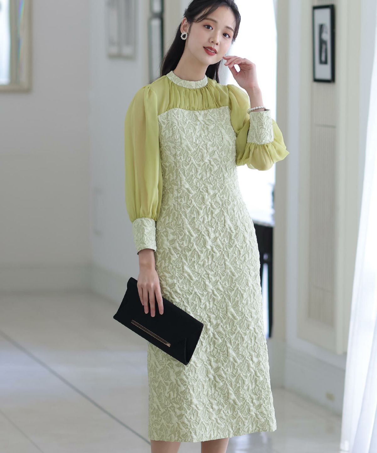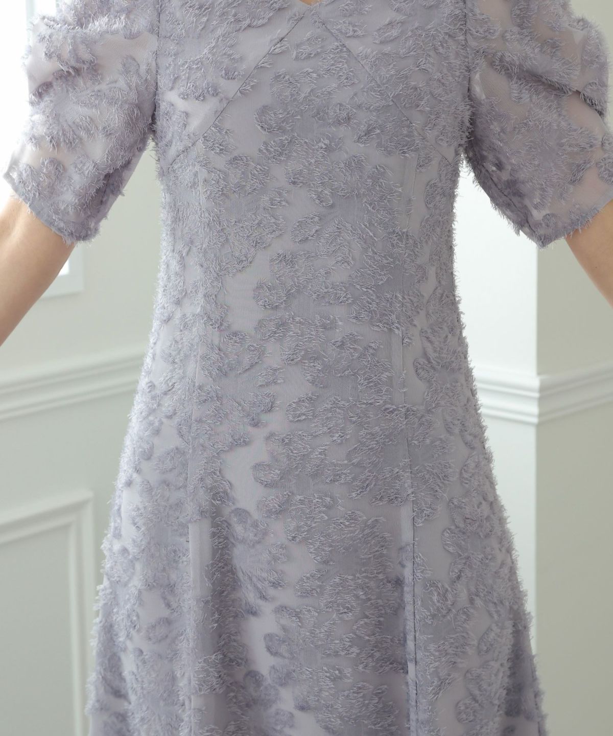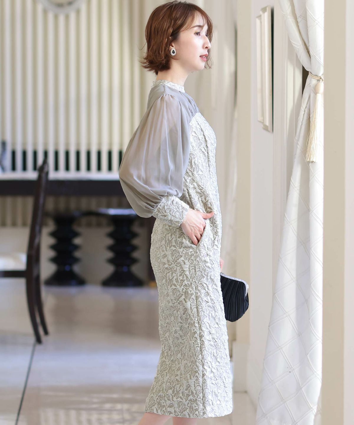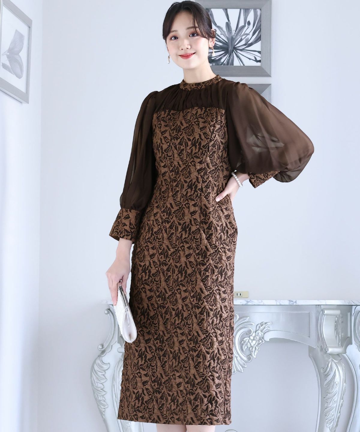 ぷっくり膨らみのあるジャガード生地が高級感漂う オーガンジー×膨れジャガードワンピース