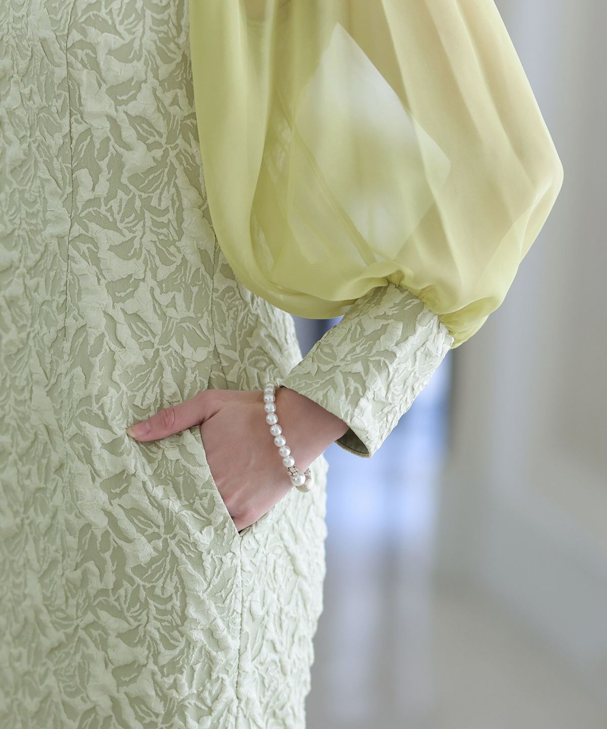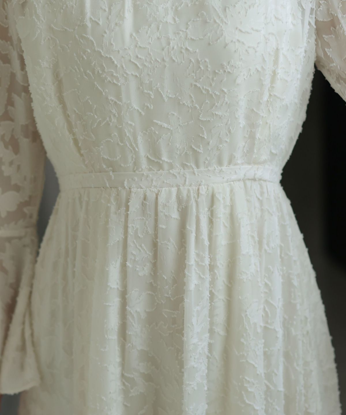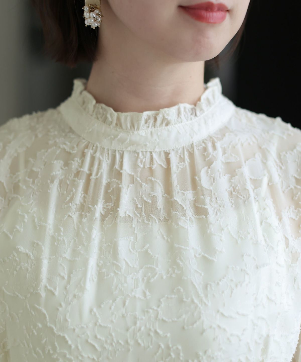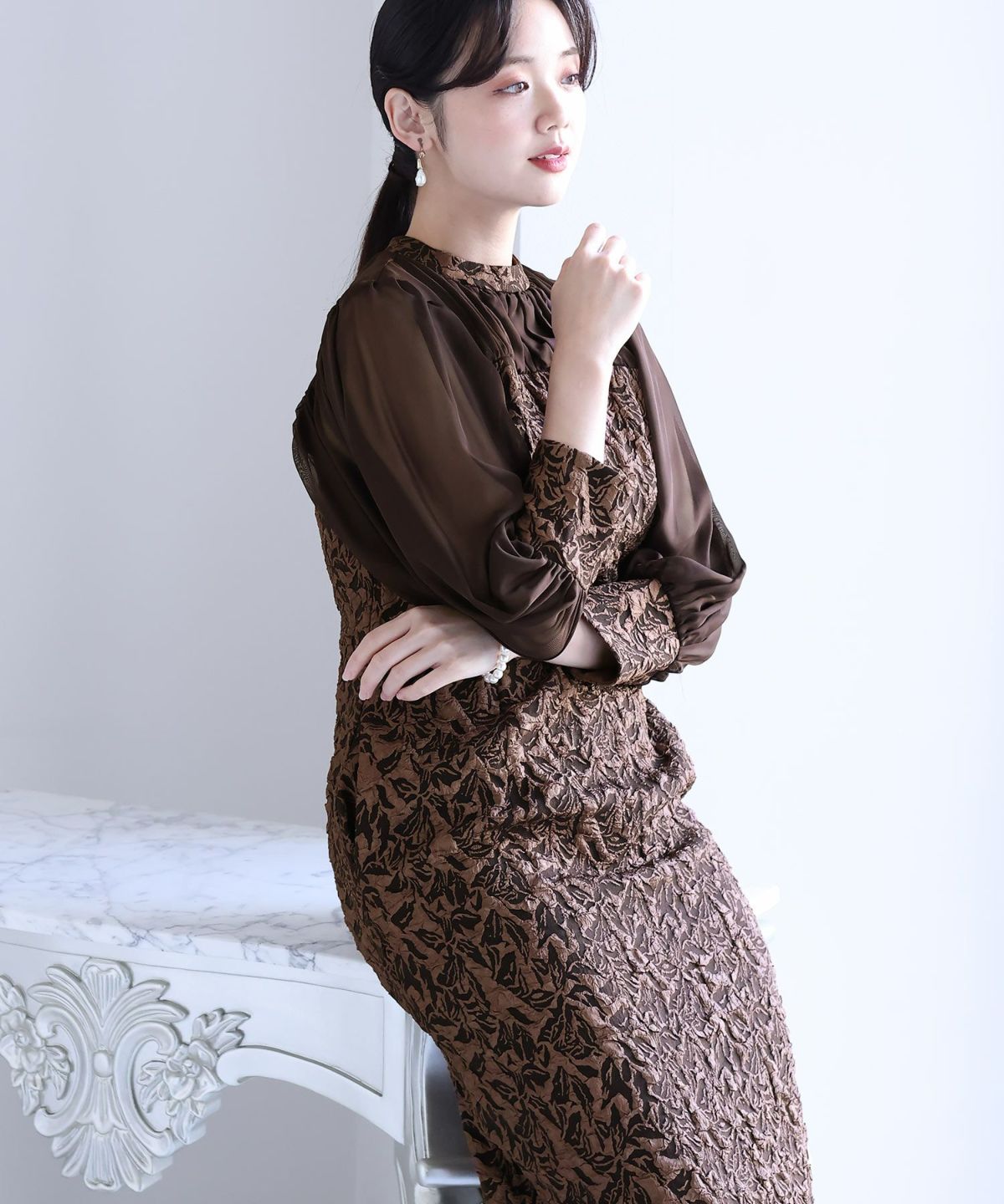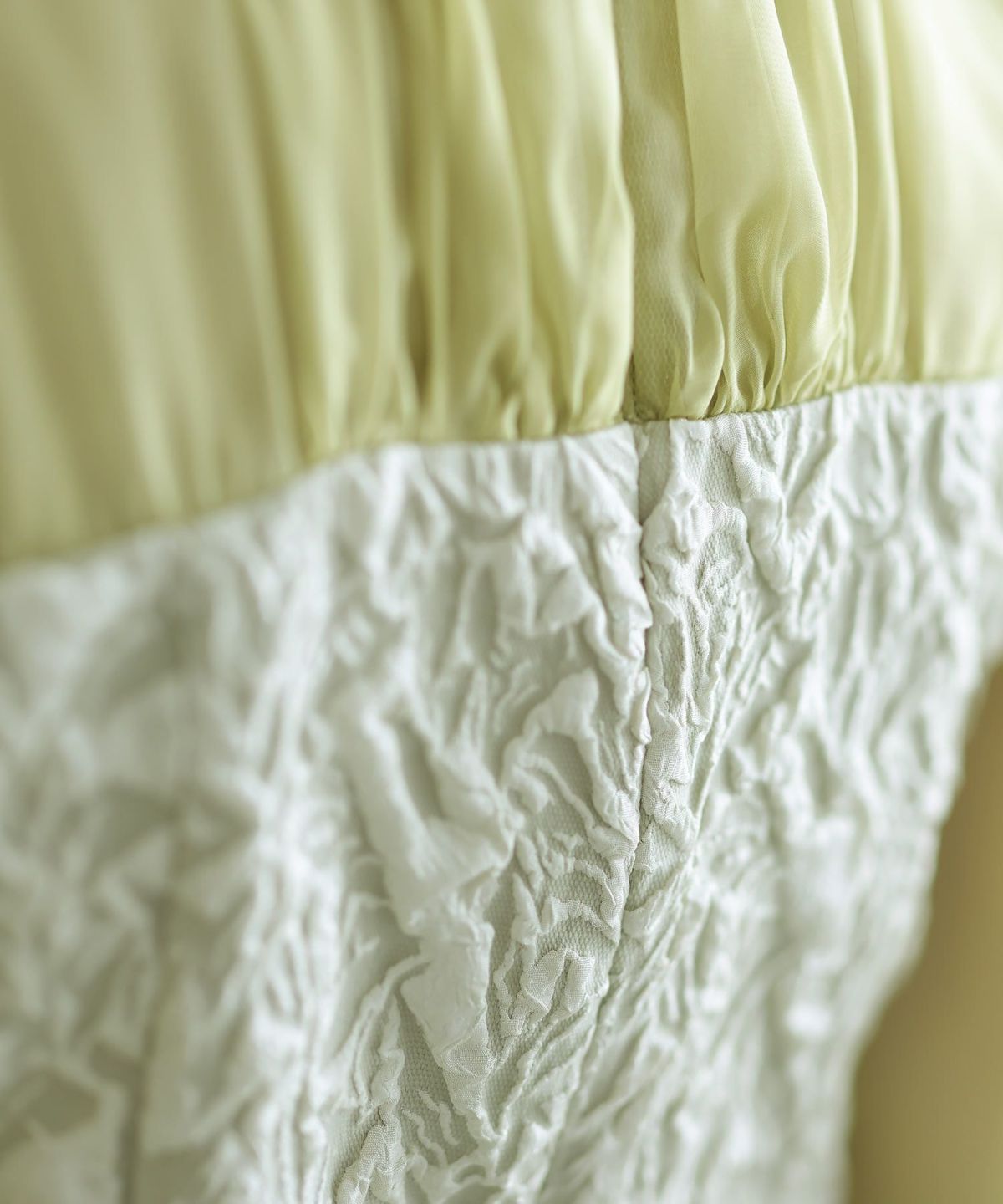 ぷっくり膨らみのあるジャガード生地が高級感漂う オーガンジー×膨れジャガードワンピース