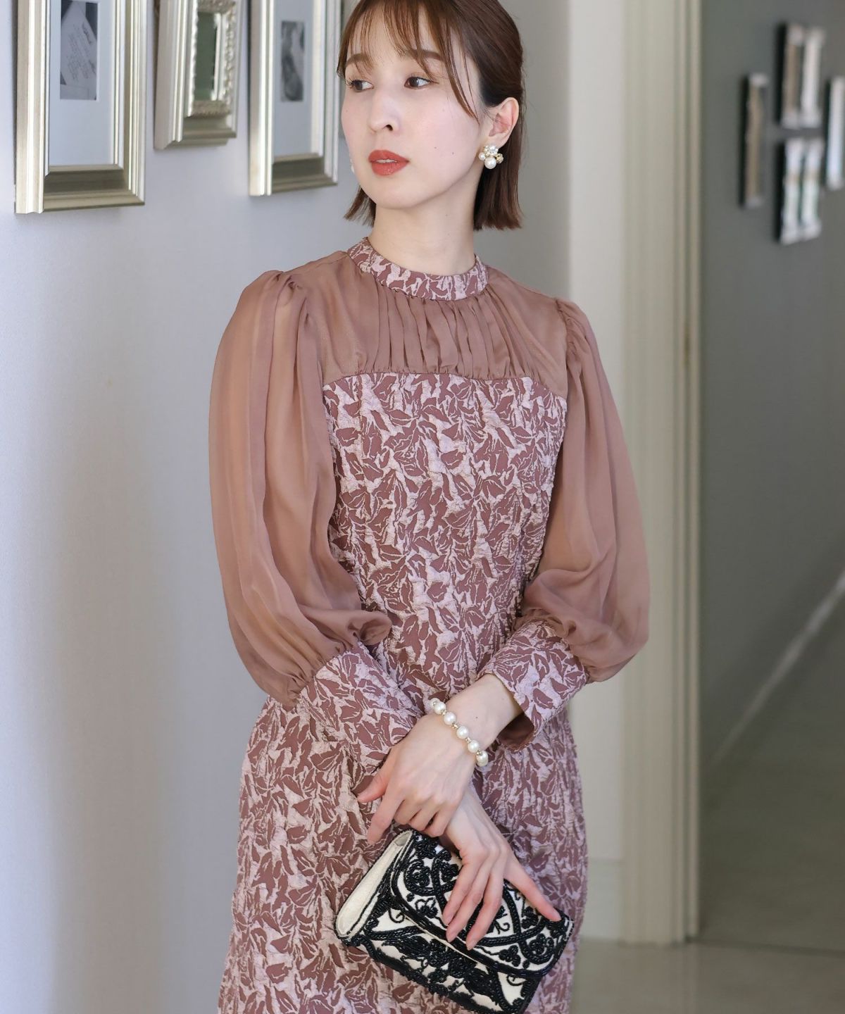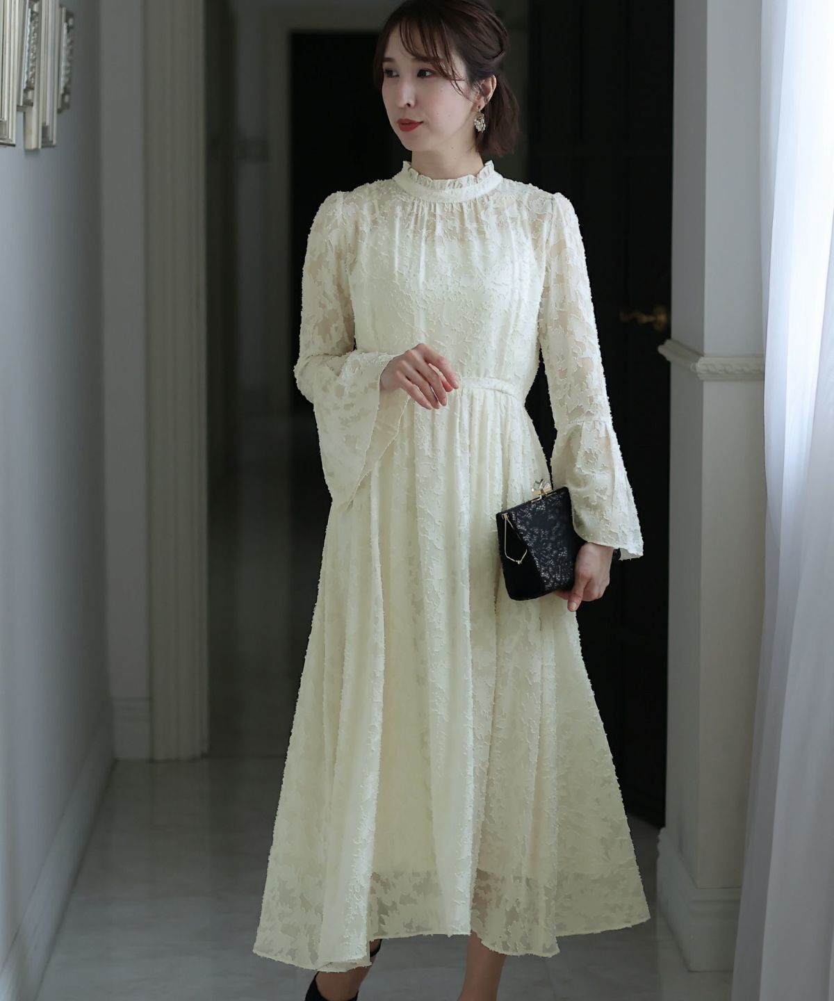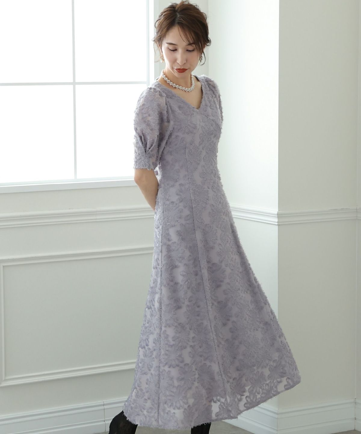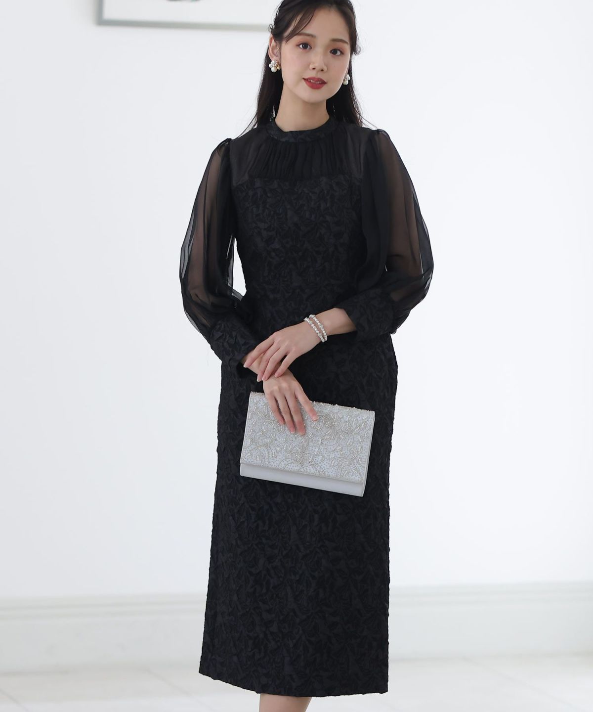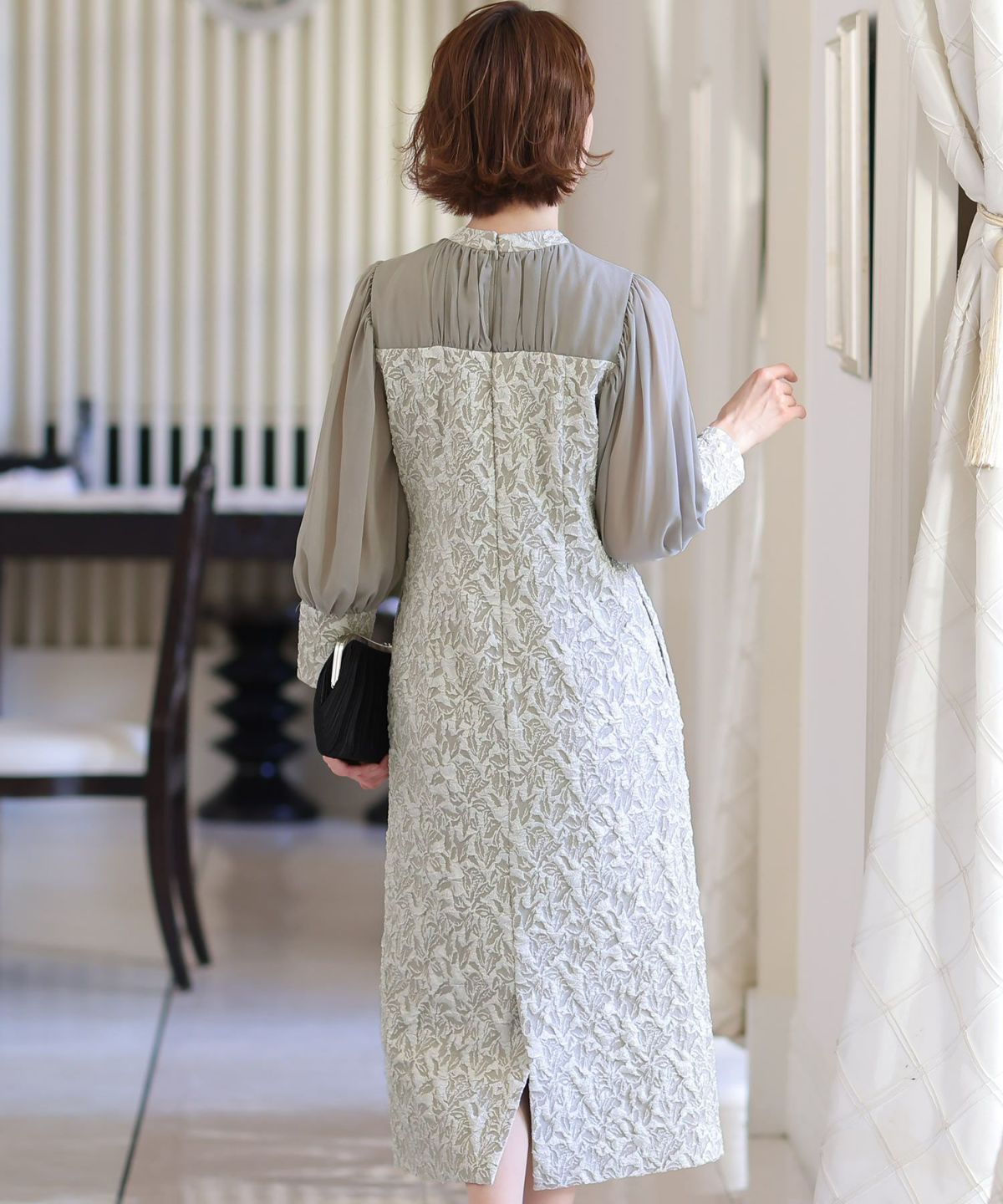 ぷっくり膨らみのあるジャガード生地が高級感漂う オーガンジー×膨れジャガードワンピース