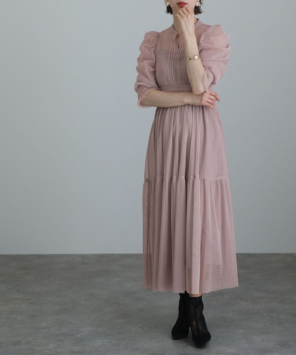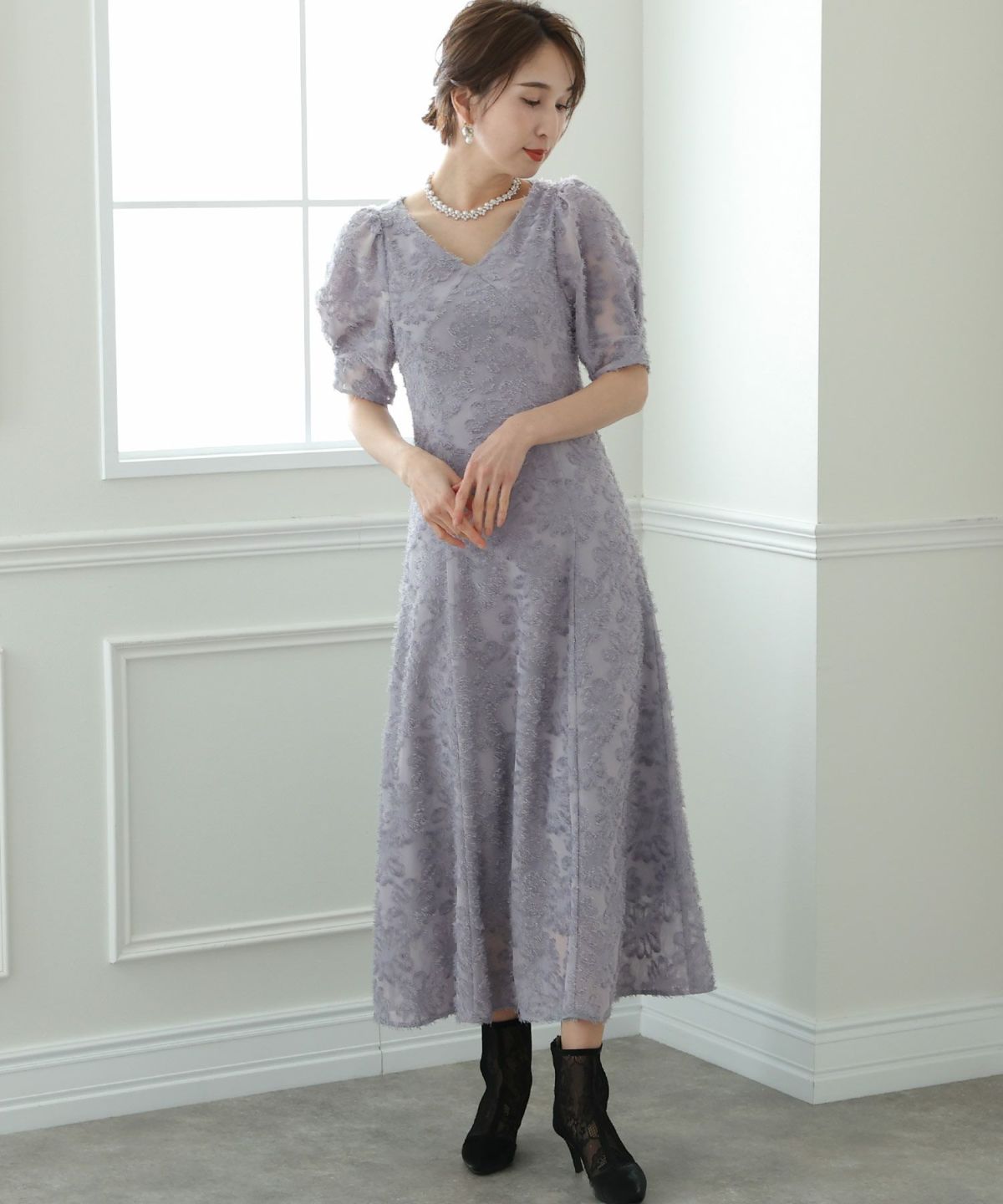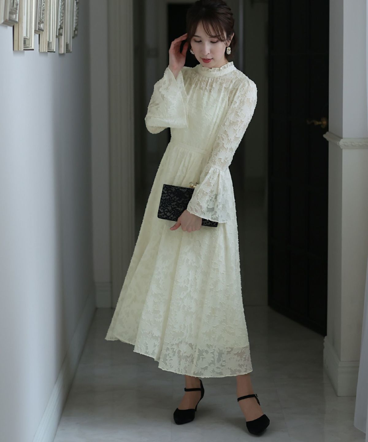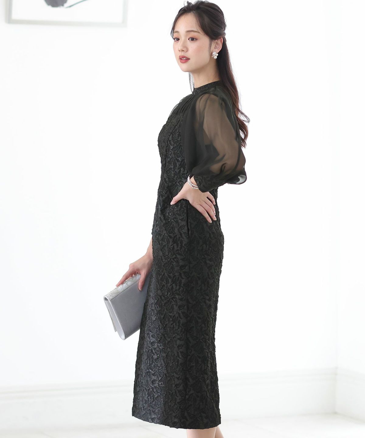 ぷっくり膨らみのあるジャガード生地が高級感漂う オーガンジー×膨れジャガードワンピース