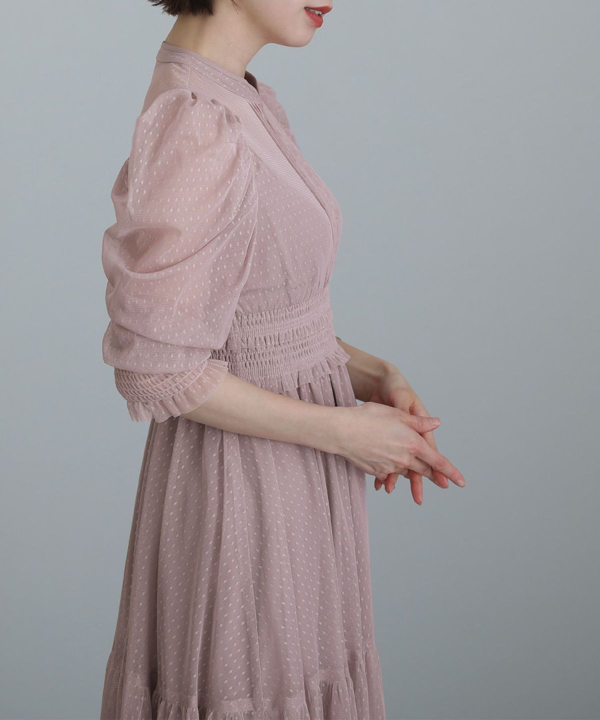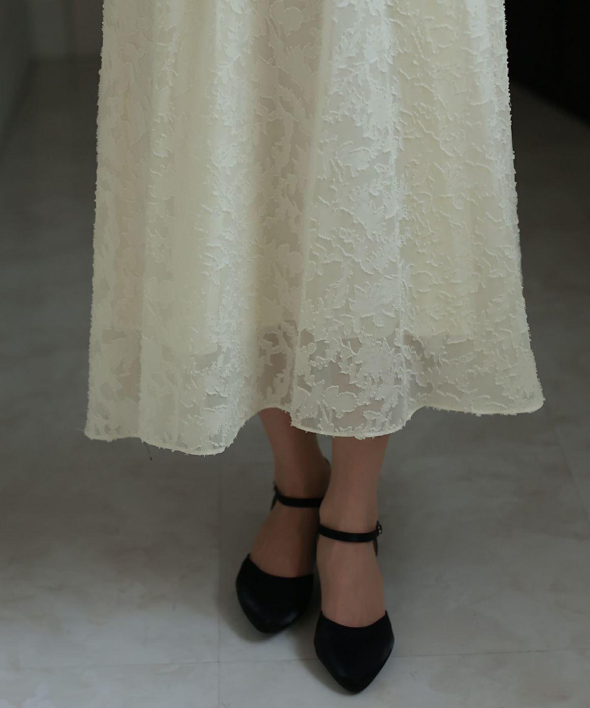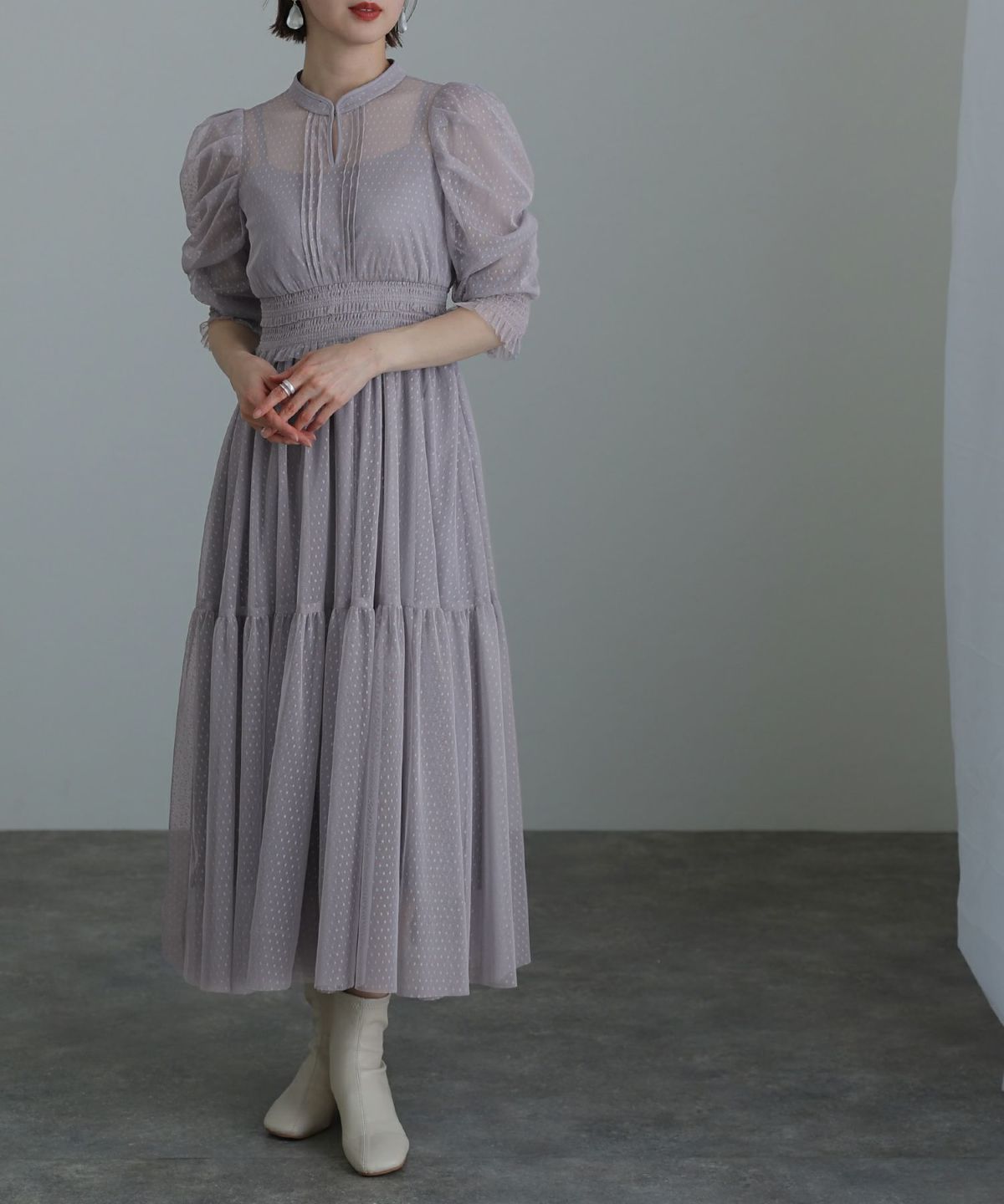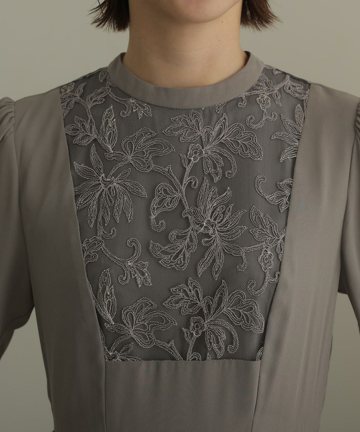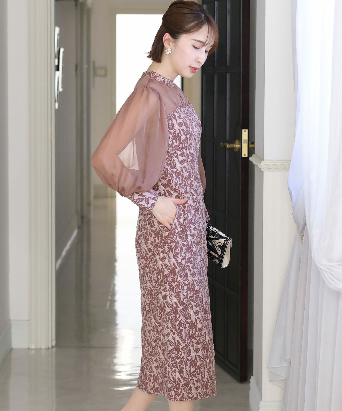 ぷっくり膨らみのあるジャガード生地が高級感漂う オーガンジー×膨れジャガードワンピース