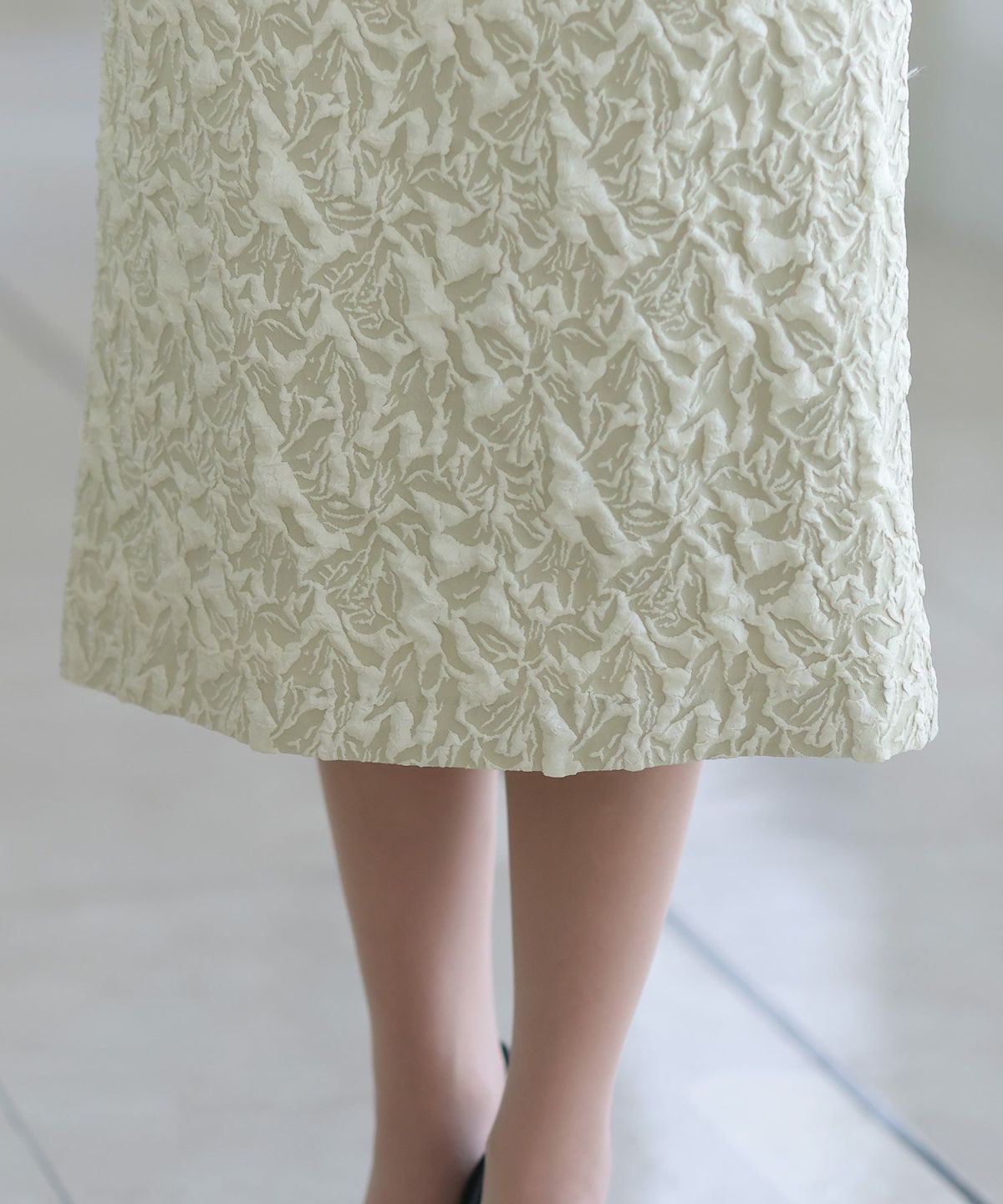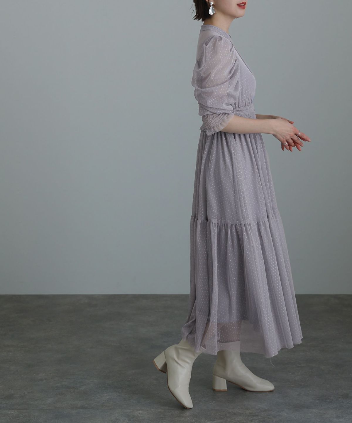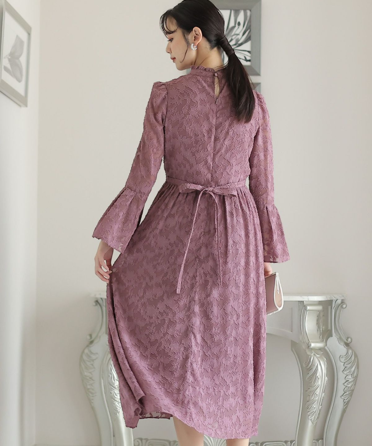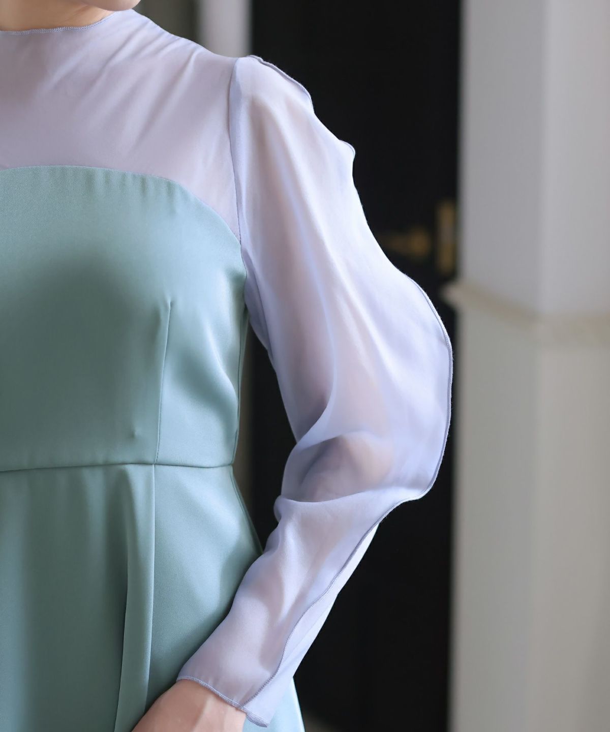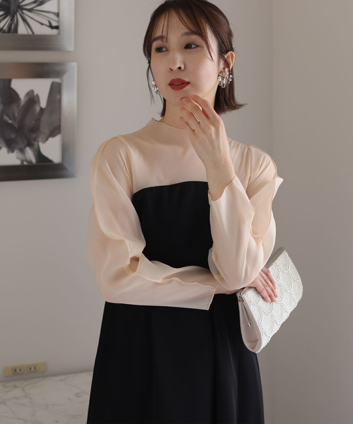 ぷっくり膨らみのあるジャガード生地が高級感漂う オーガンジー×膨れジャガードワンピース